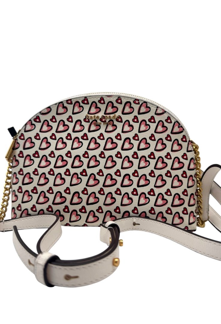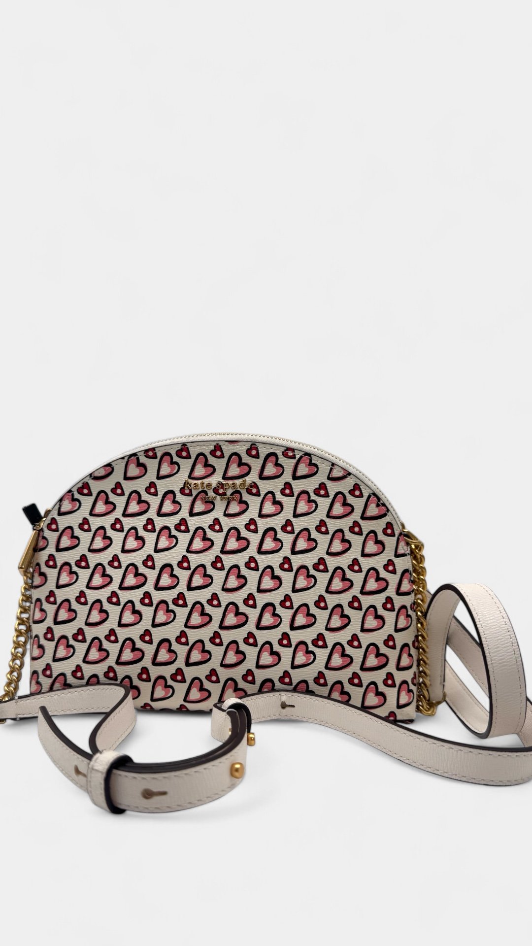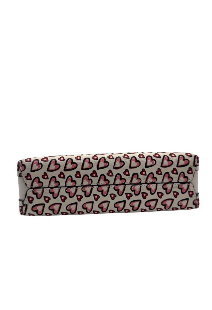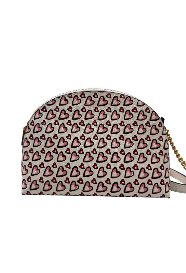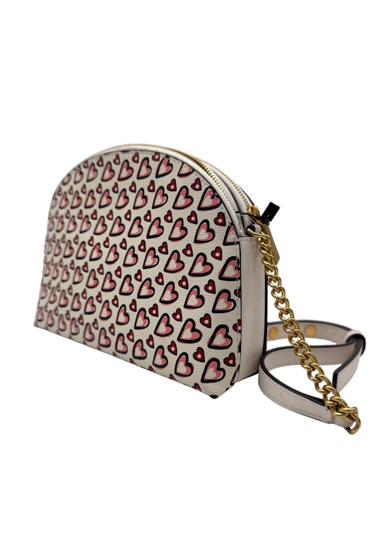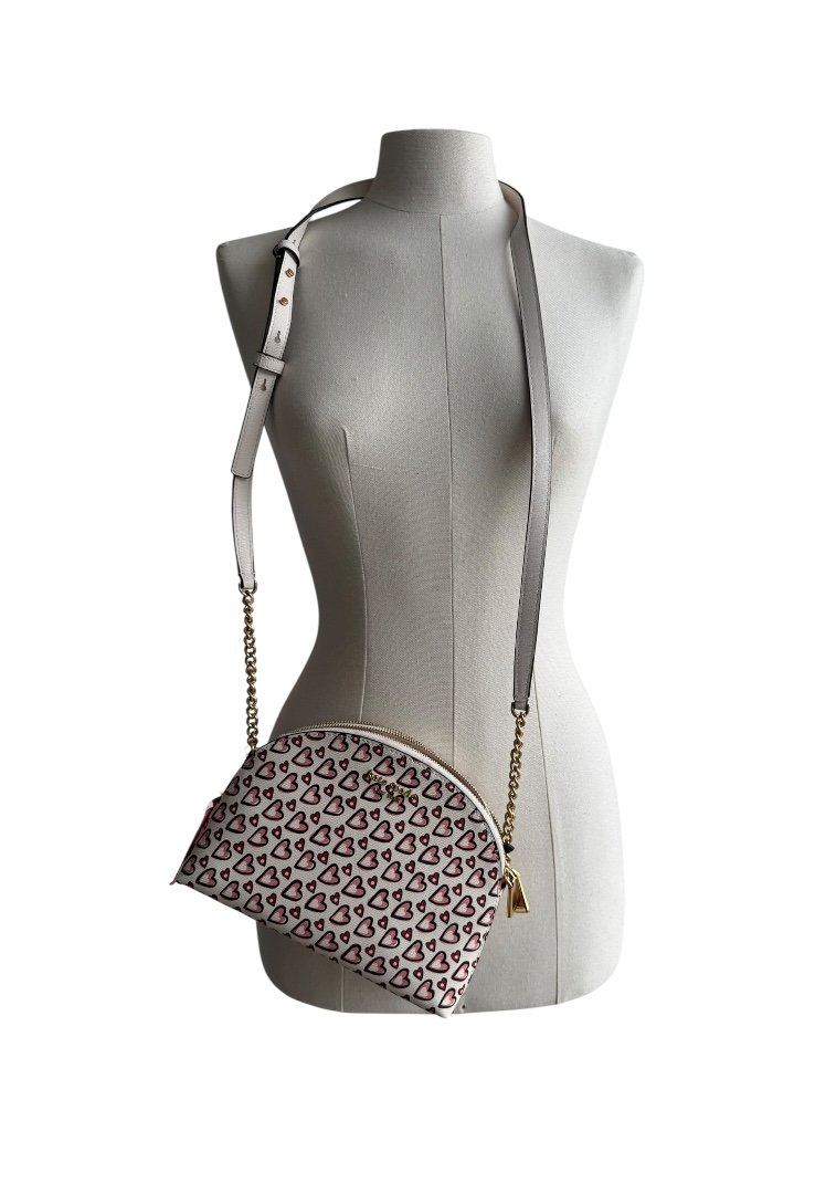 Bolso fabricado en lona con diseño de corazones, doble compartimento con cremallera, asa con cadena, apliques en dorado.