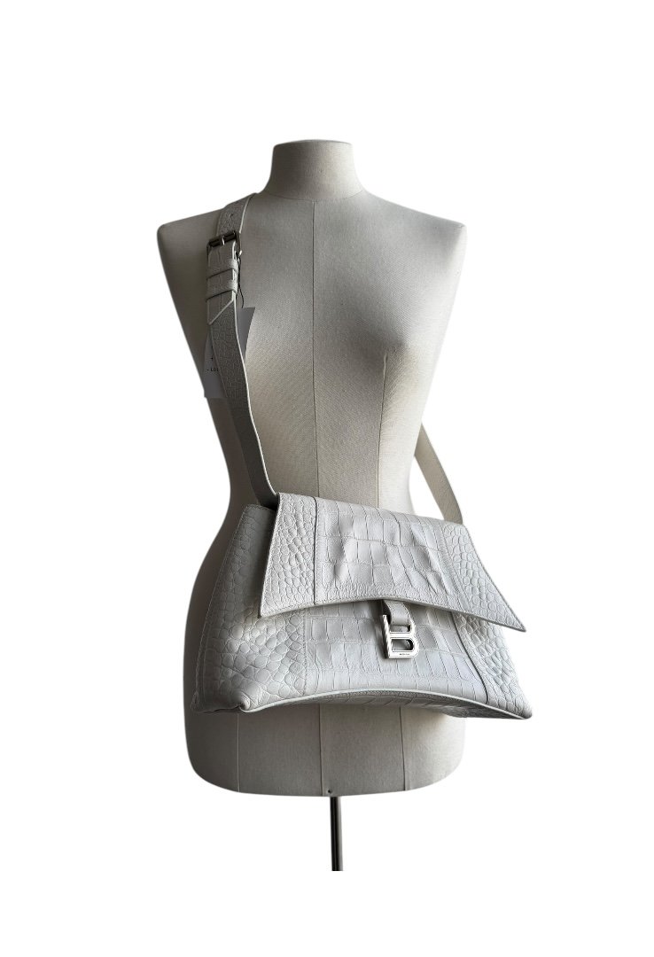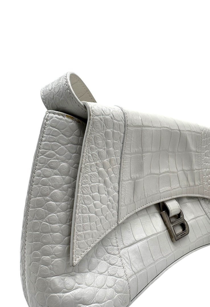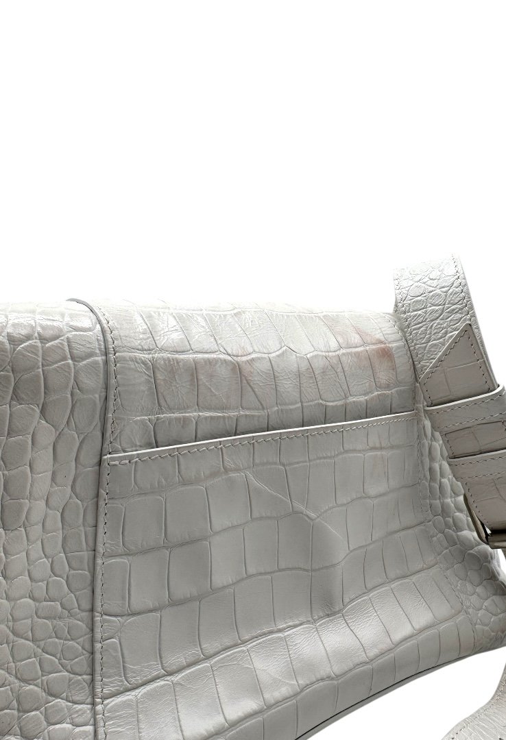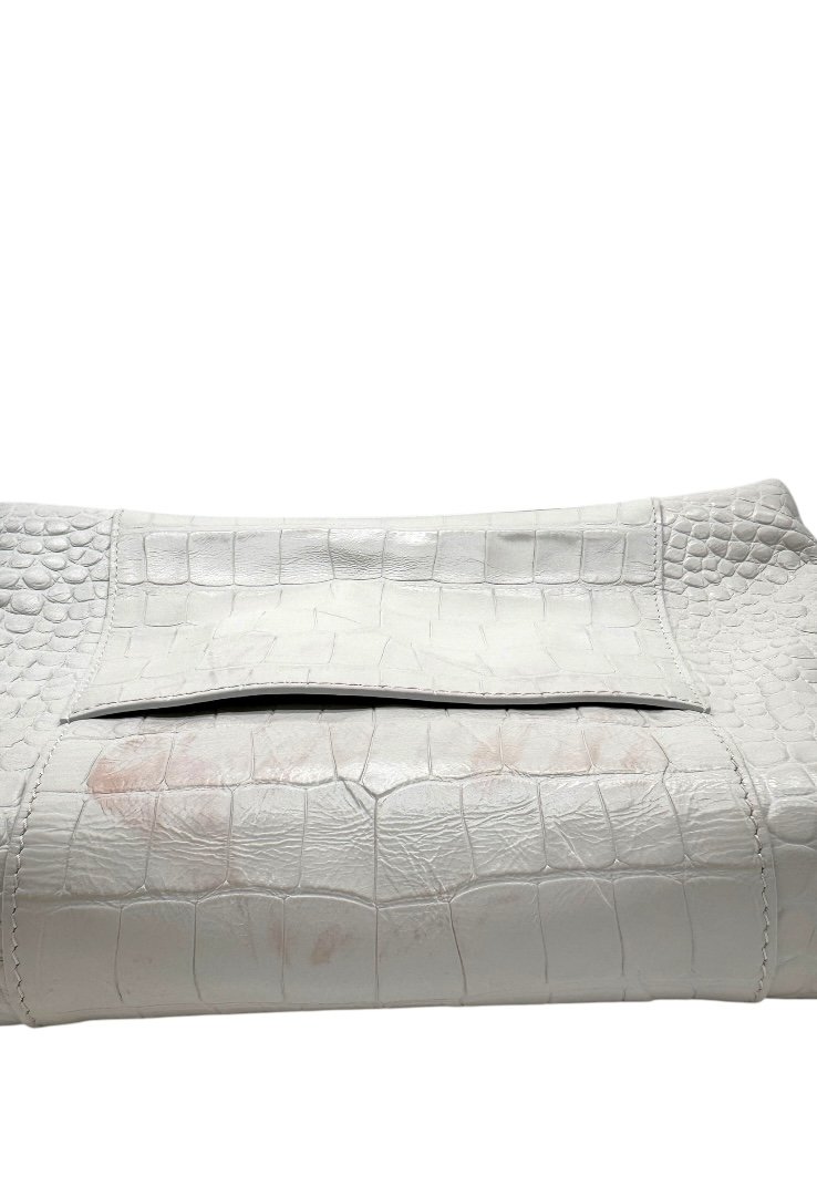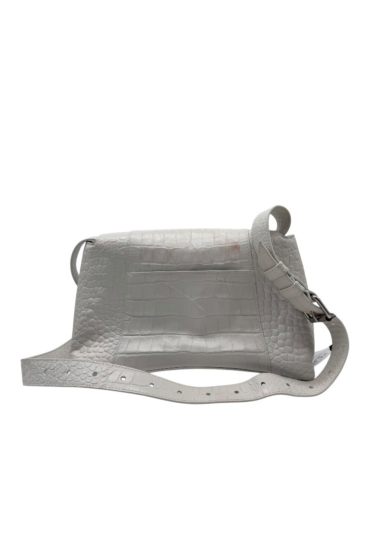 Bolsa de piel con textura de cocodrilo, con herrajes en plateado, compatimento interno con cremallera.