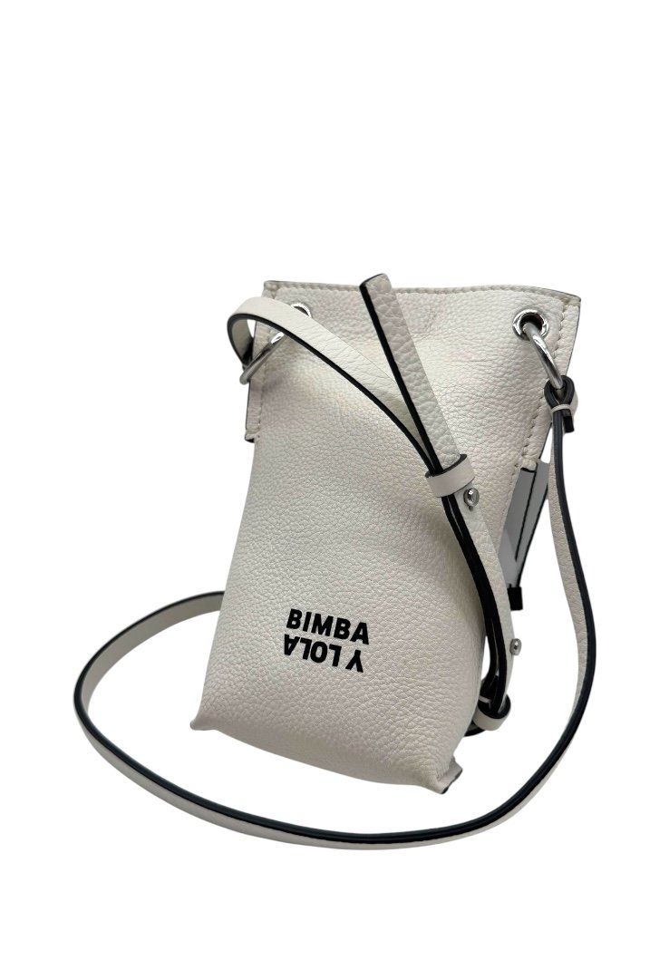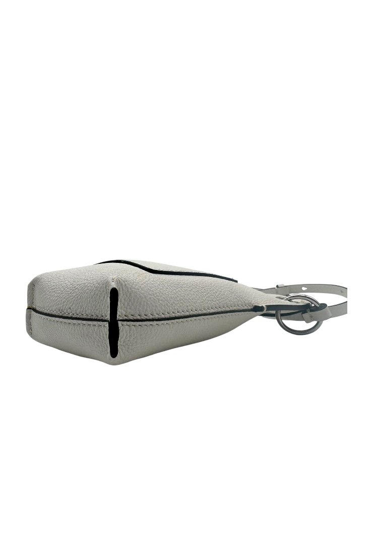 Bolso elaborado en piel granulada, apliques en plata, marca estampada en la parte frontal.