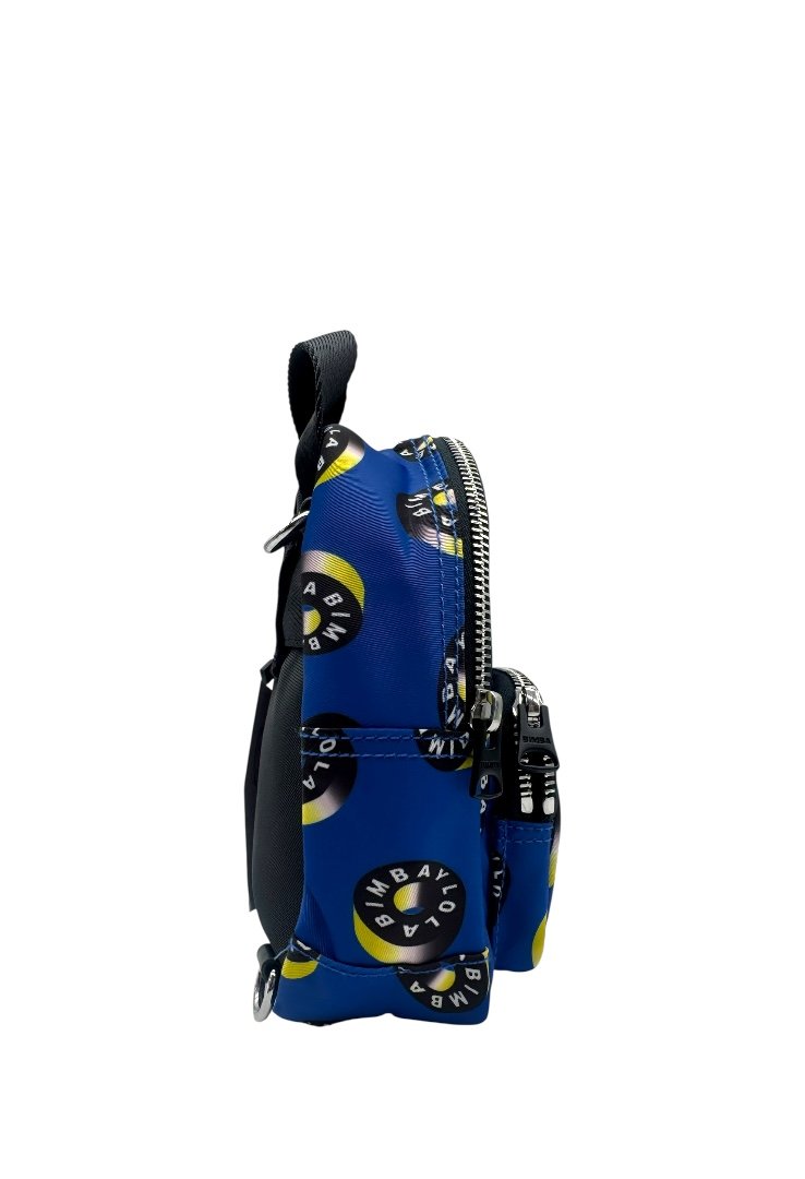 Mini mochila en nylon, apliques en plata, compartimento principal en cremallera y compartimento externo con cremallera.