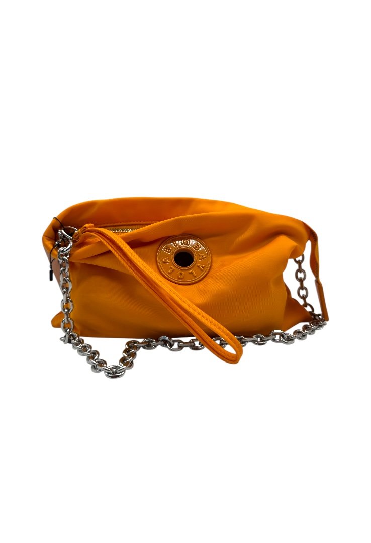 Bolsa elaborada en lona, con apliques y cadena en plata.