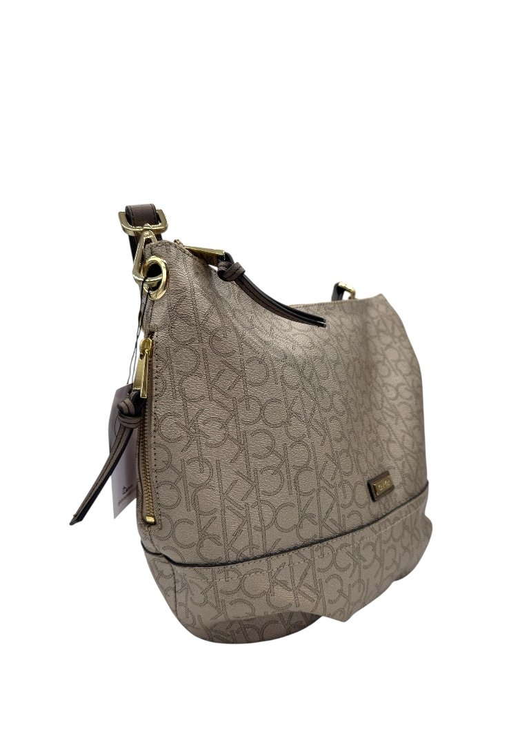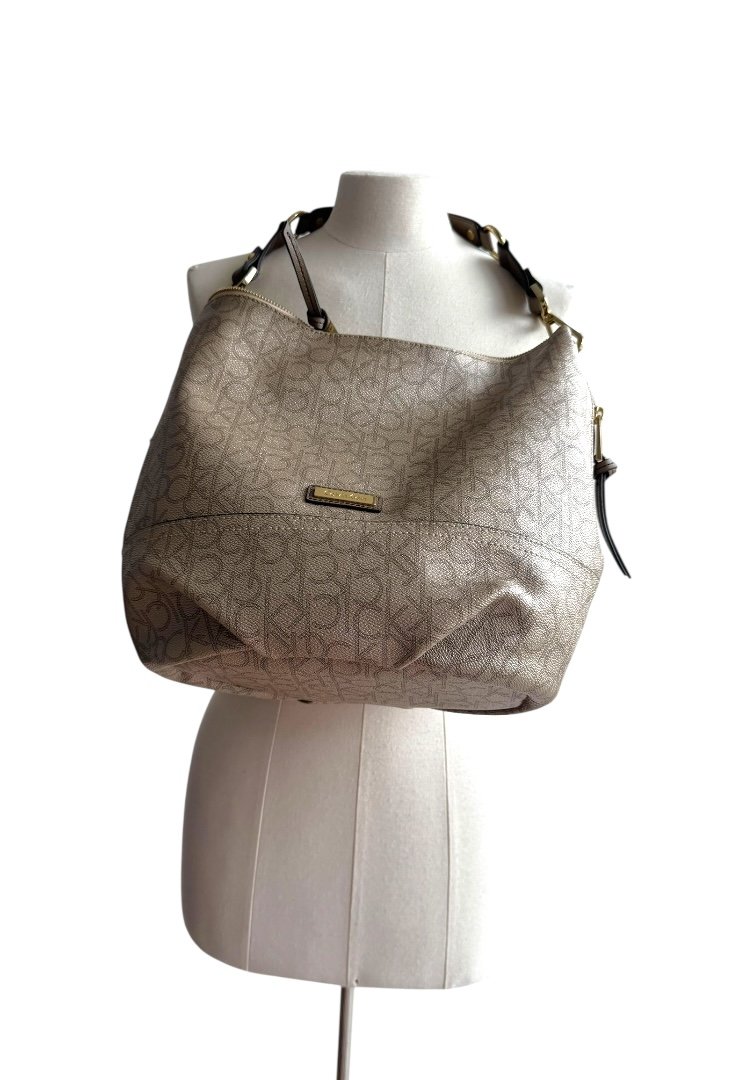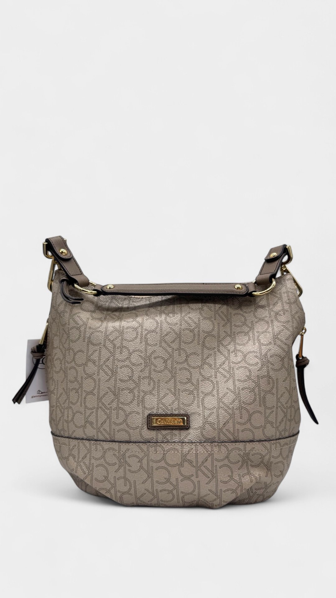 Bolso elaborado en canvas diseño monogram, asa de cuero, apliques en dorado, cierre con cremallera.