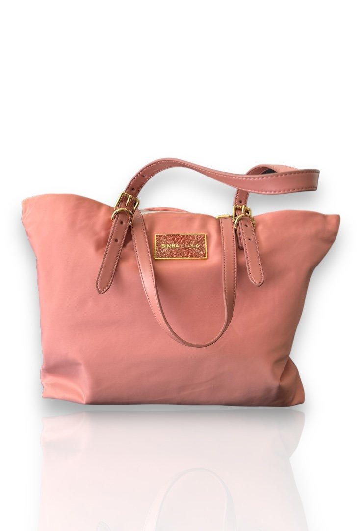 Bolso de Nylon con asas ajustables de polipiel con hebillas doradas. Cierre con cintas y topes en color negro. Bolsillo interior con cremallera, logotipo exterior.