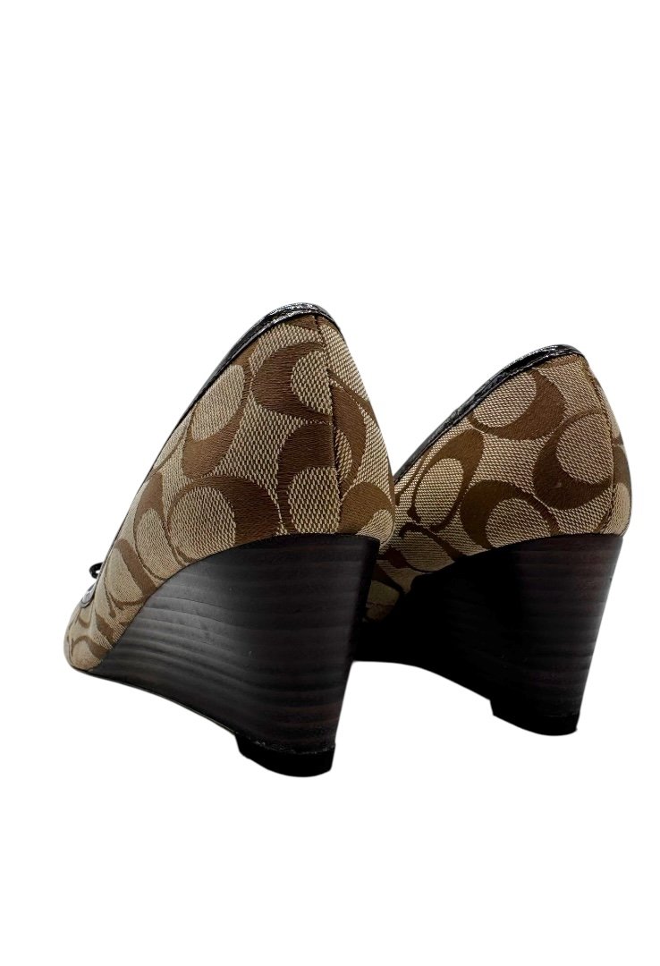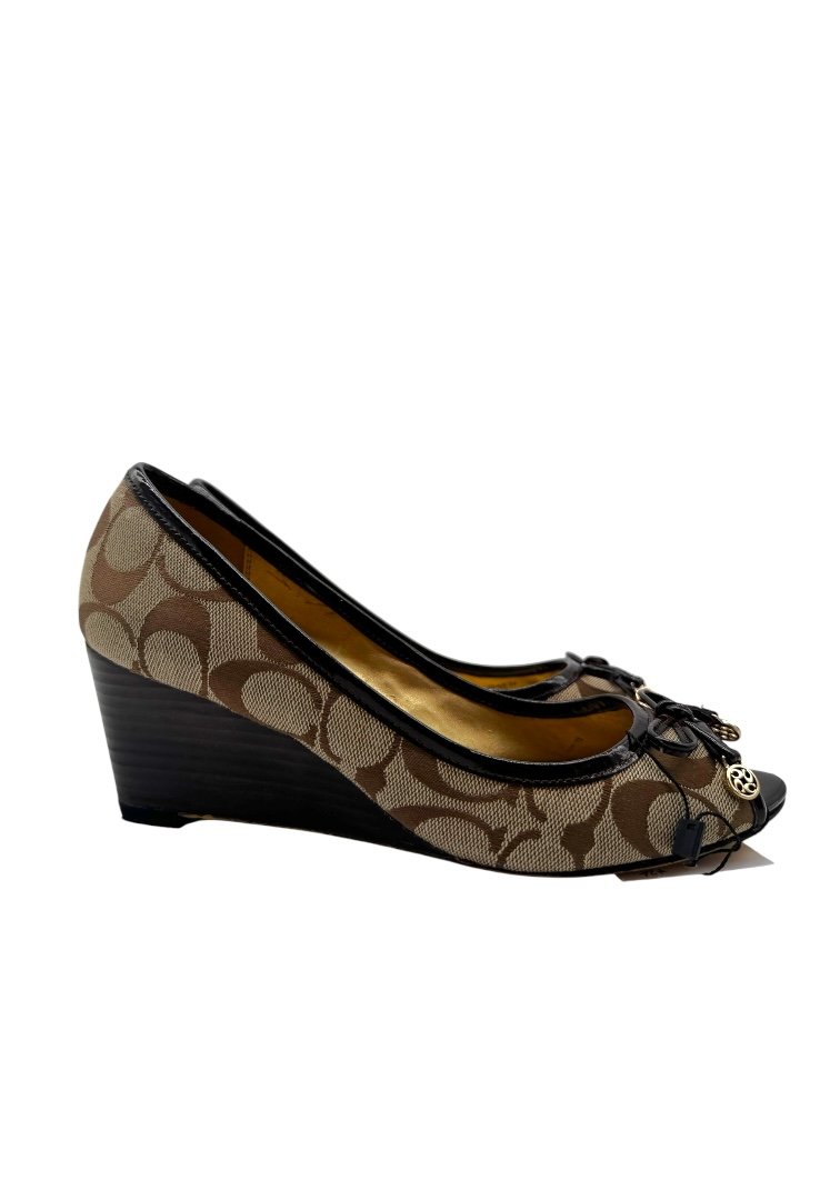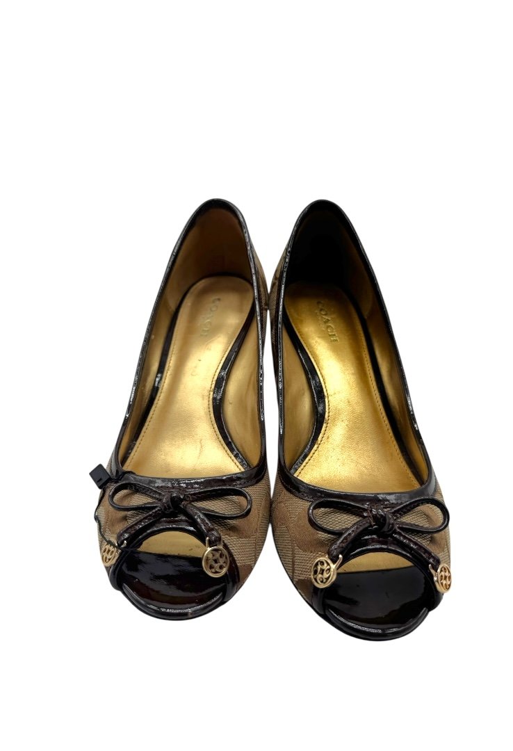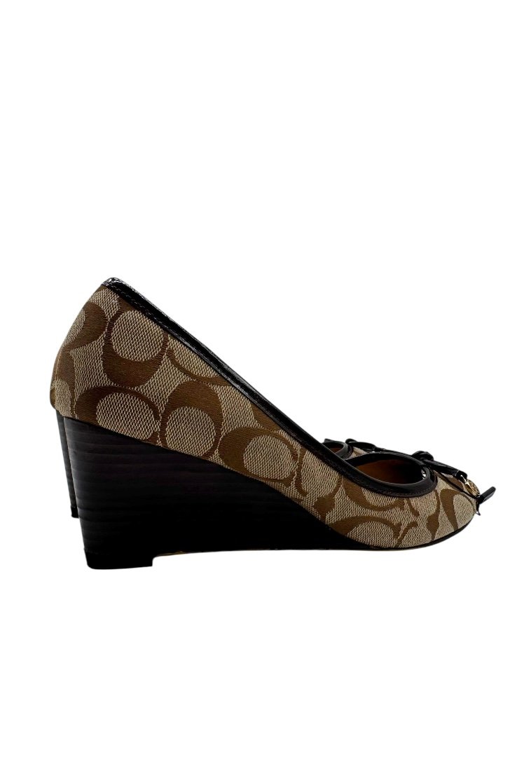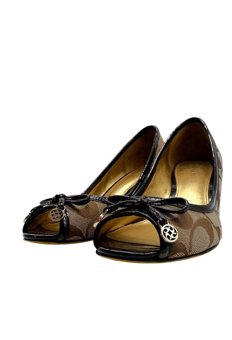 Tacones elaborados en canvas jacquard, moño decorativo, apliques en dorado.