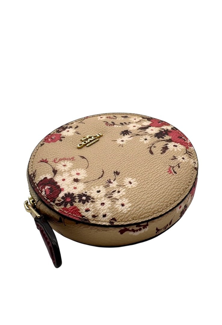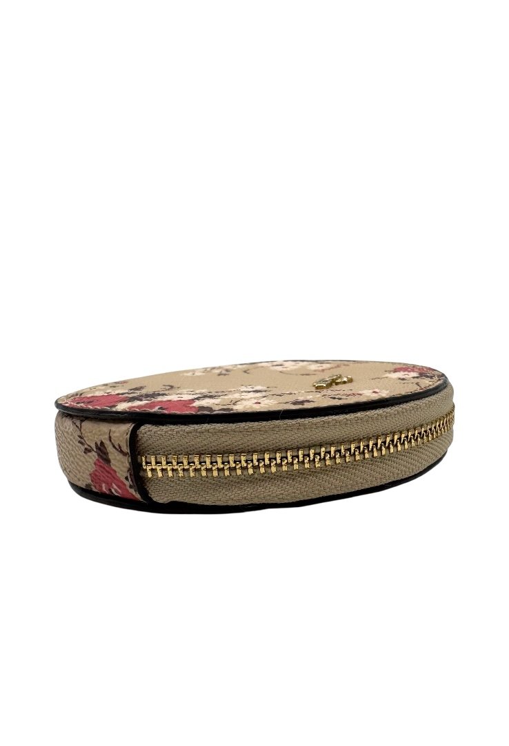 Monedero en forma circular en piel granulada, con estampado floral, aplques en dorado, cierre en cremallera.