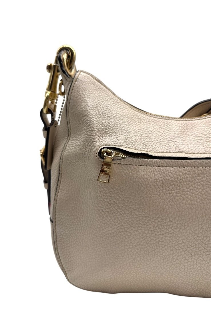 Bolso elaborado piel granulada, apliques en dorado, cierre en cremallera, logo de la marca estampado.