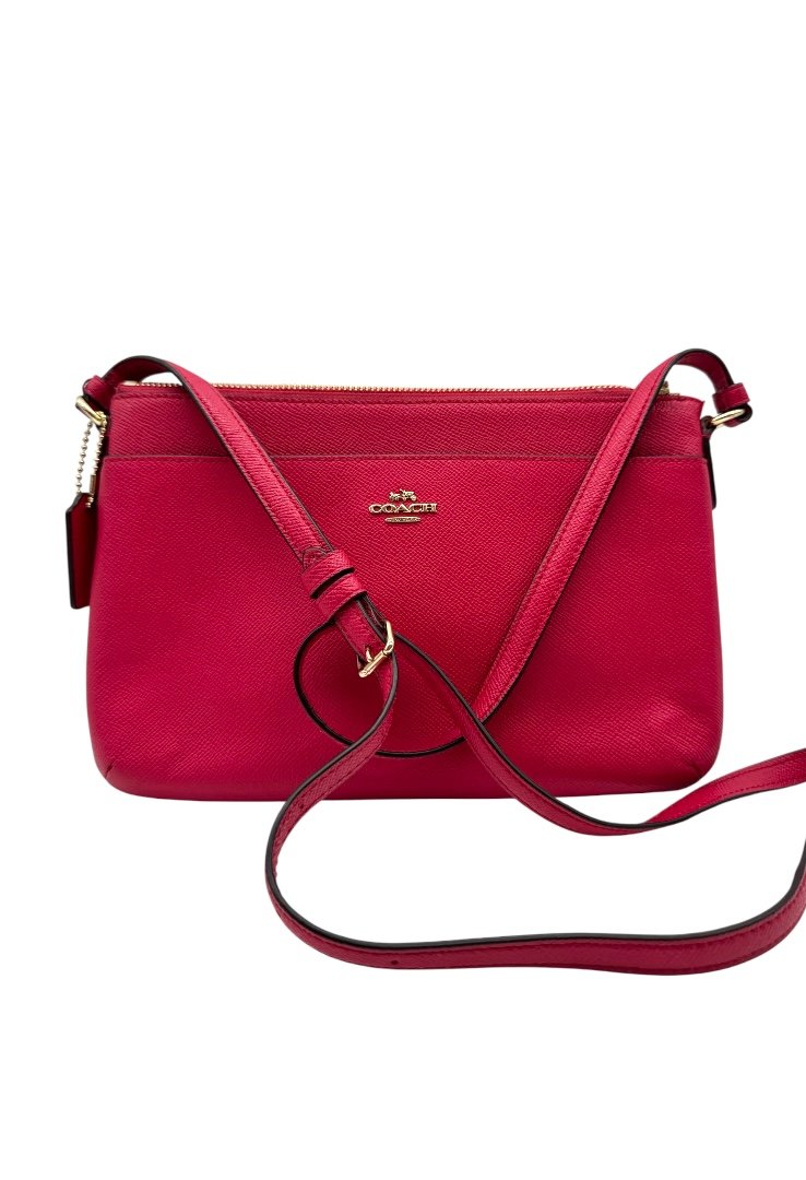 Bolso de cuero granulado, apliques en dorado, cierre de cremallera, asa ajustable.