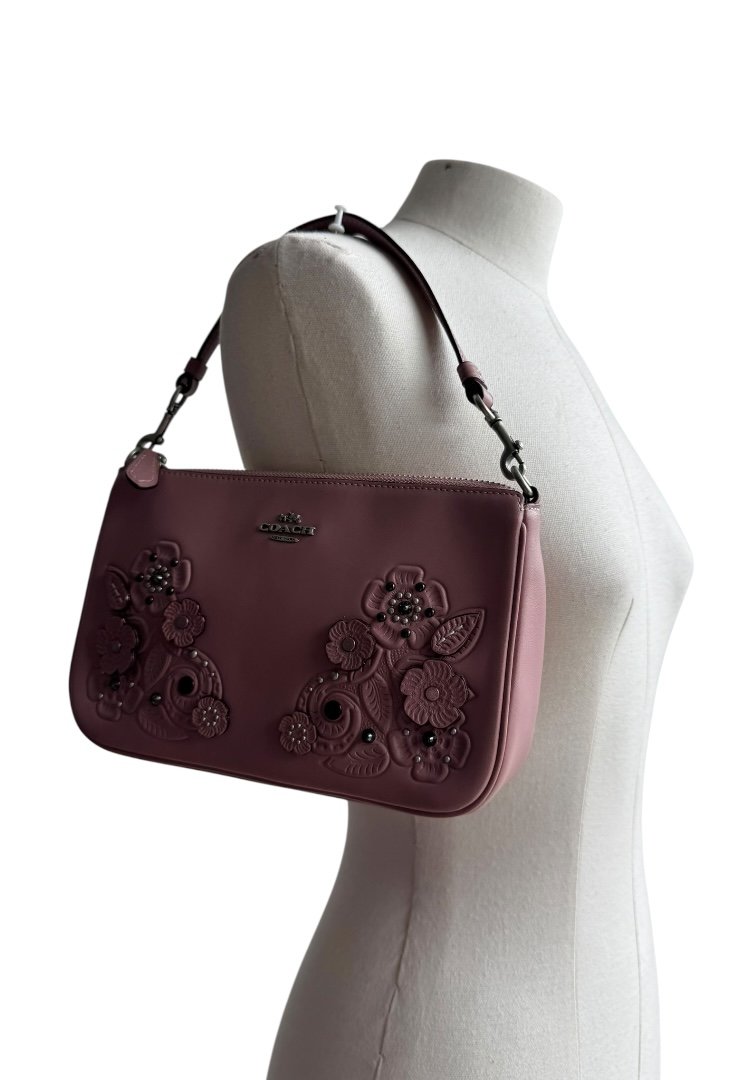 Bolso elaborado en piel lisa, adornos de flores con detalles en plata, cierre principal de cremallera, apliques en plata.