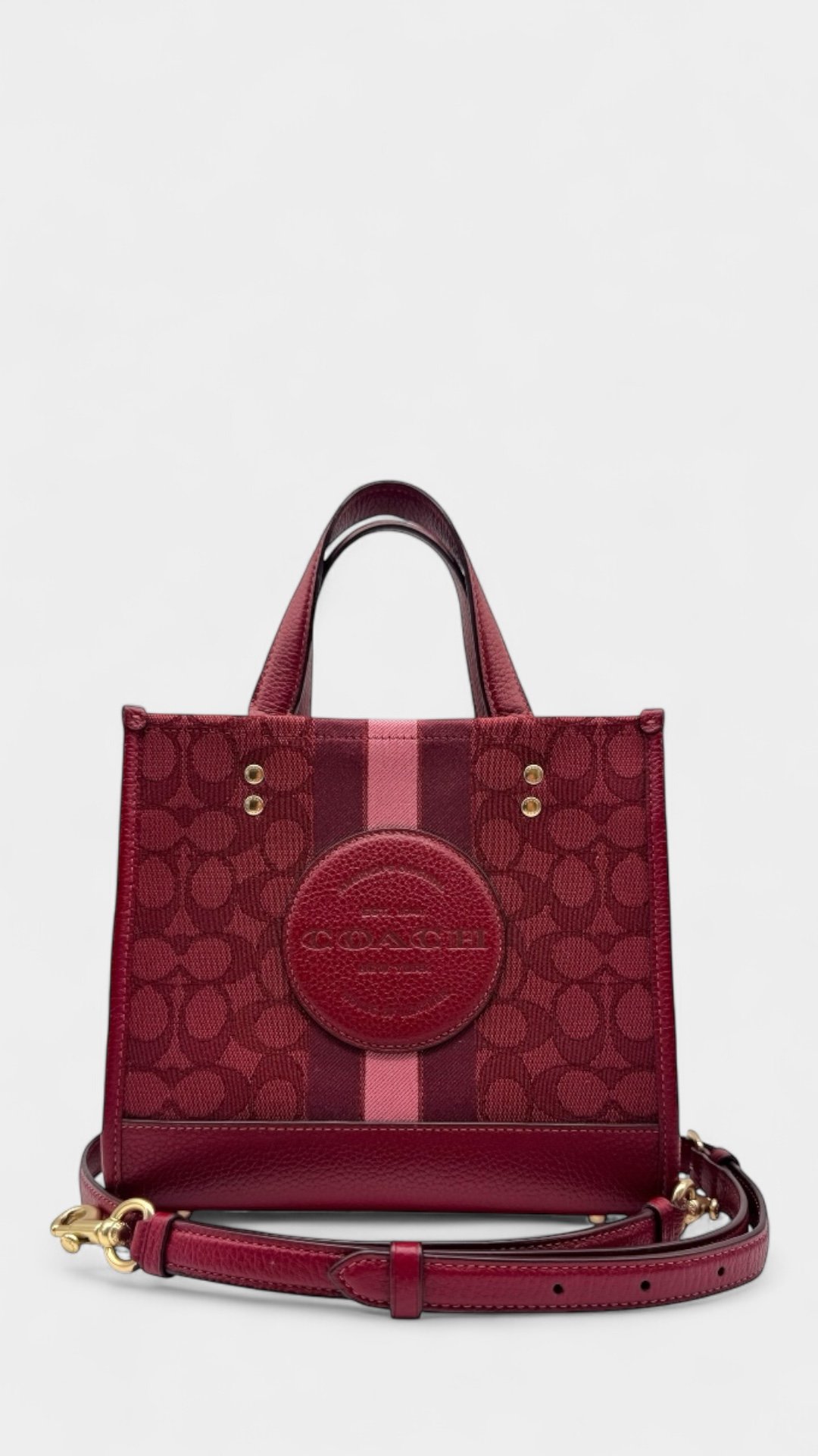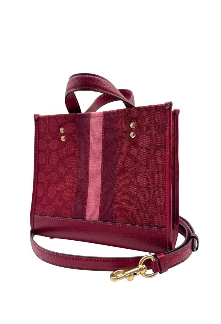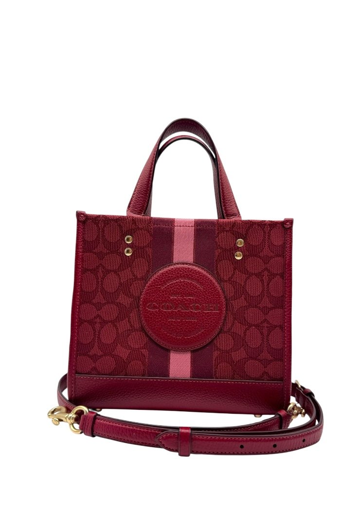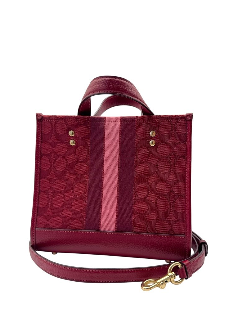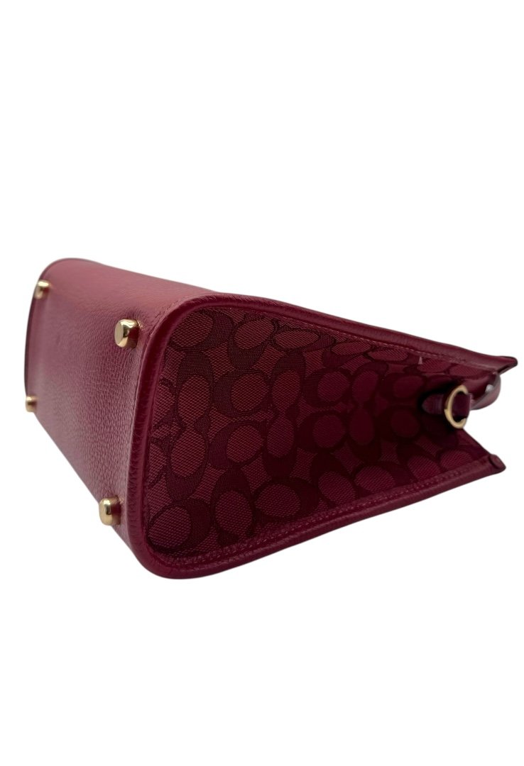 Bolsa elaborado en jacquard de firma y piel granulada refinada, compartimentos internos con cierre, apliques en dorado, cierre con botón magnéticos.