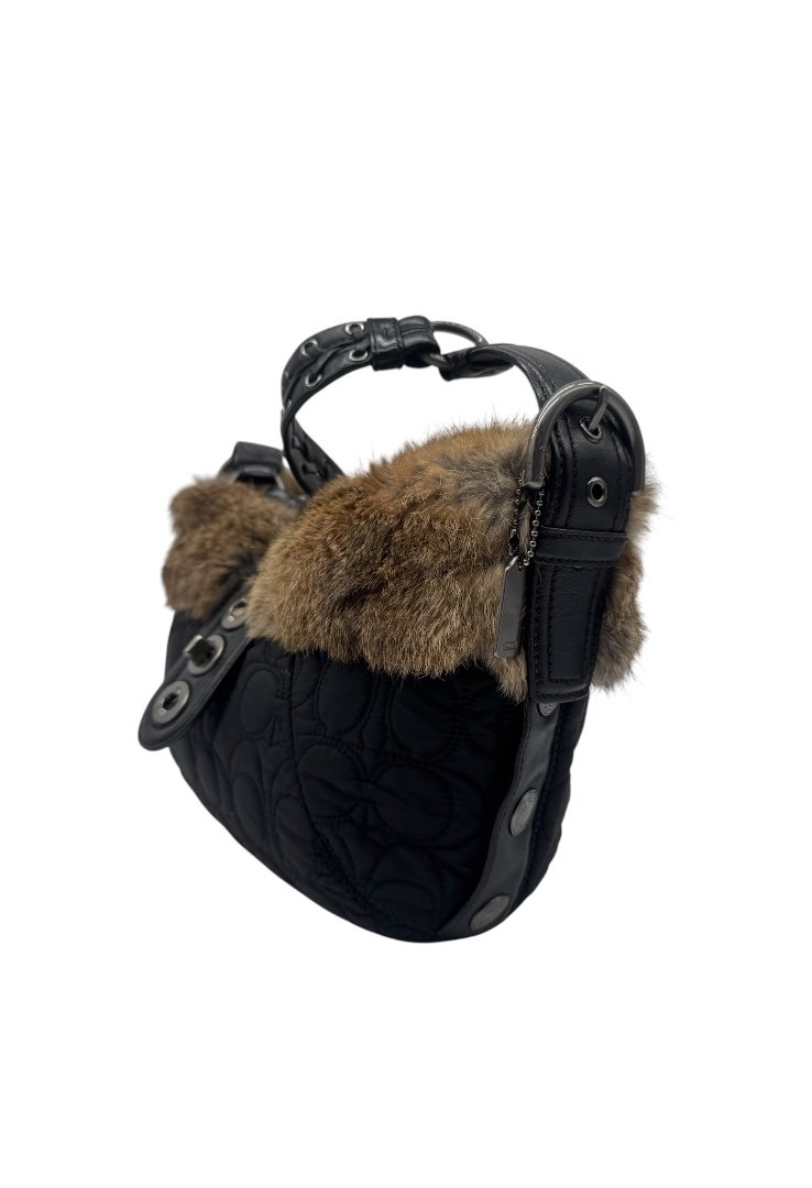 Bolso Coach Vintage Signature hecho en nailyon negro con correa de cuero y ribeteado con piel de conejo genuina en toda la parte delantera y trasera.