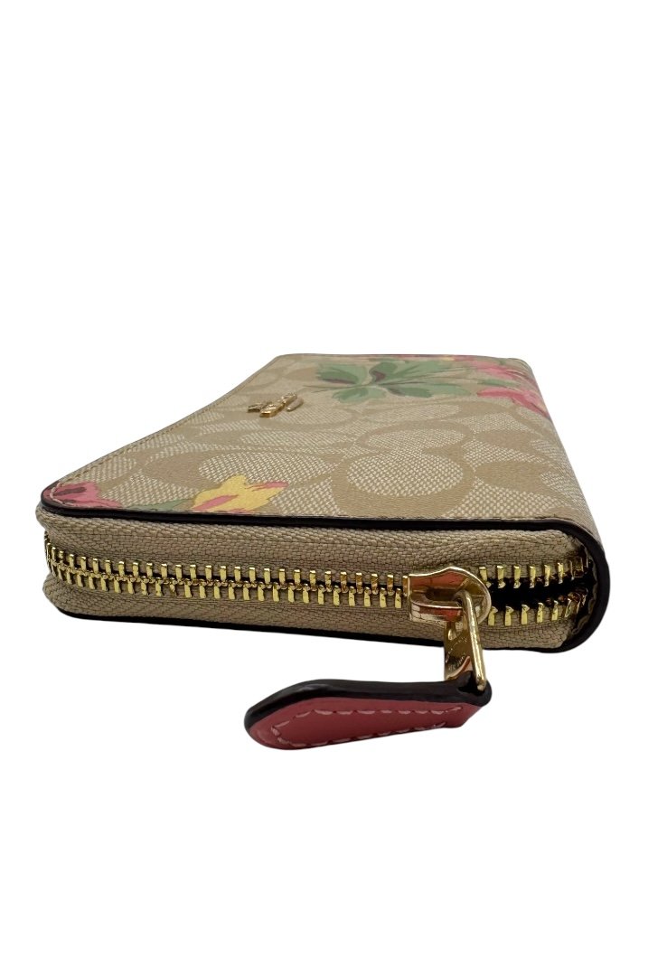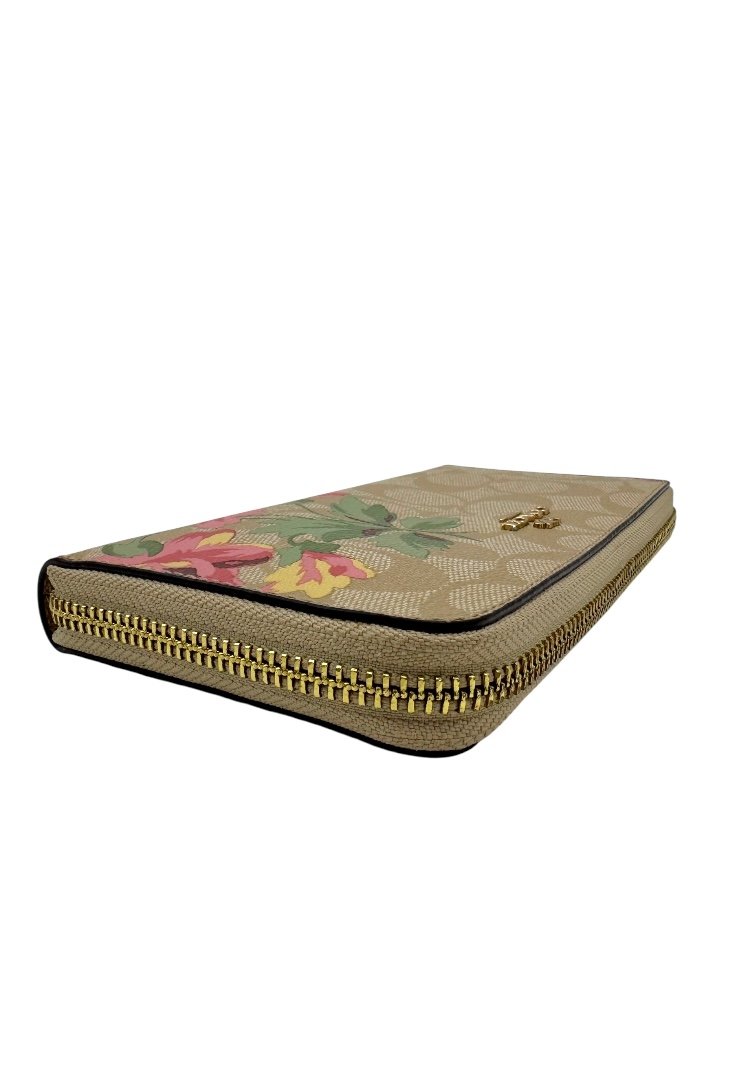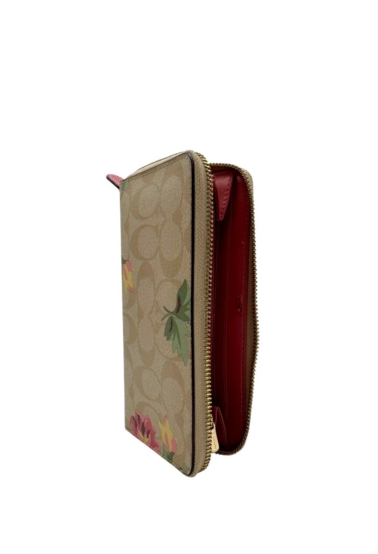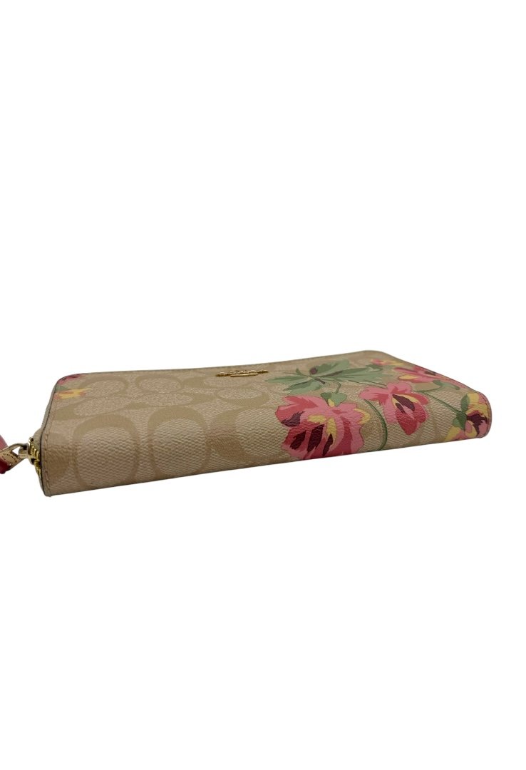 Cartera elaborada en lona revestida diseño monogram, con estampado floral y apliques en dorado.