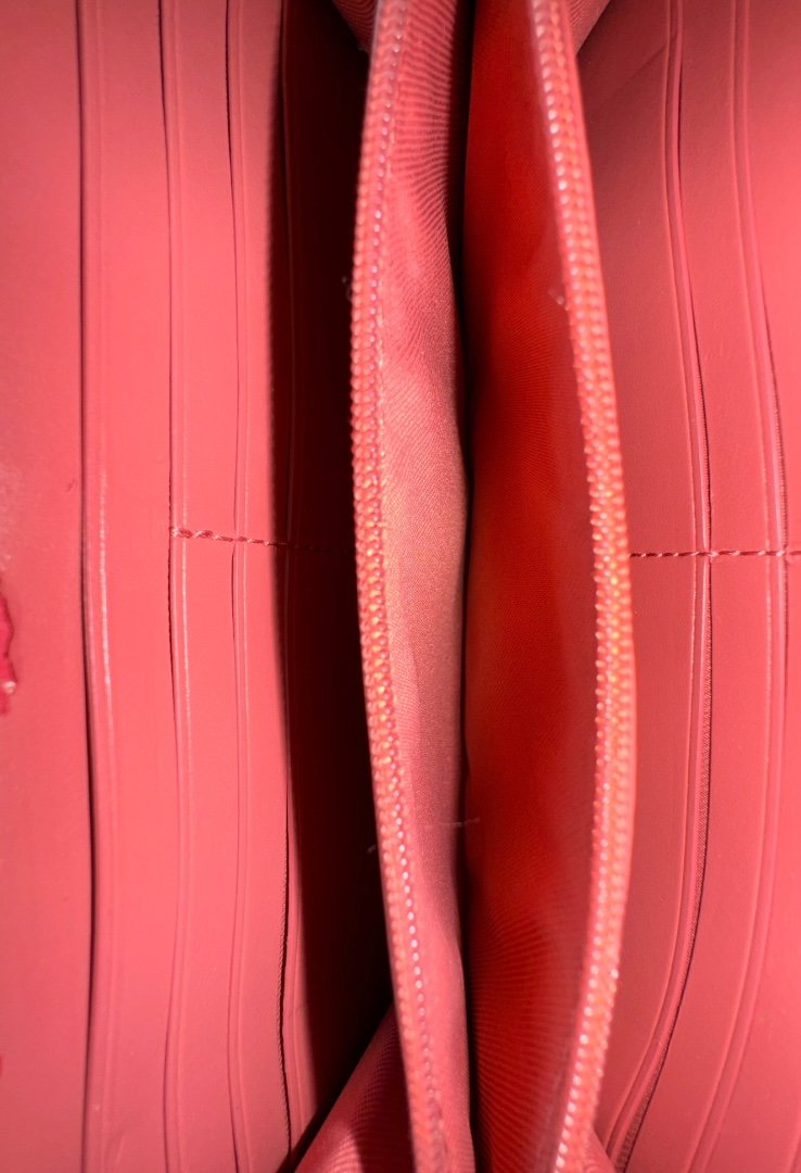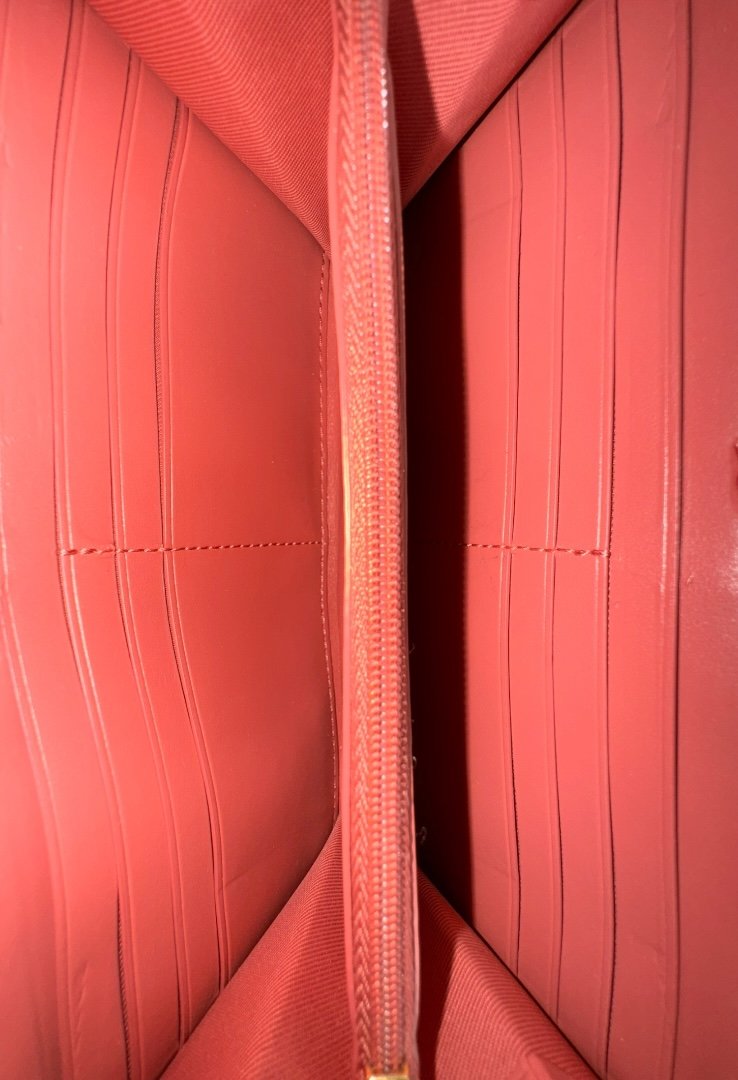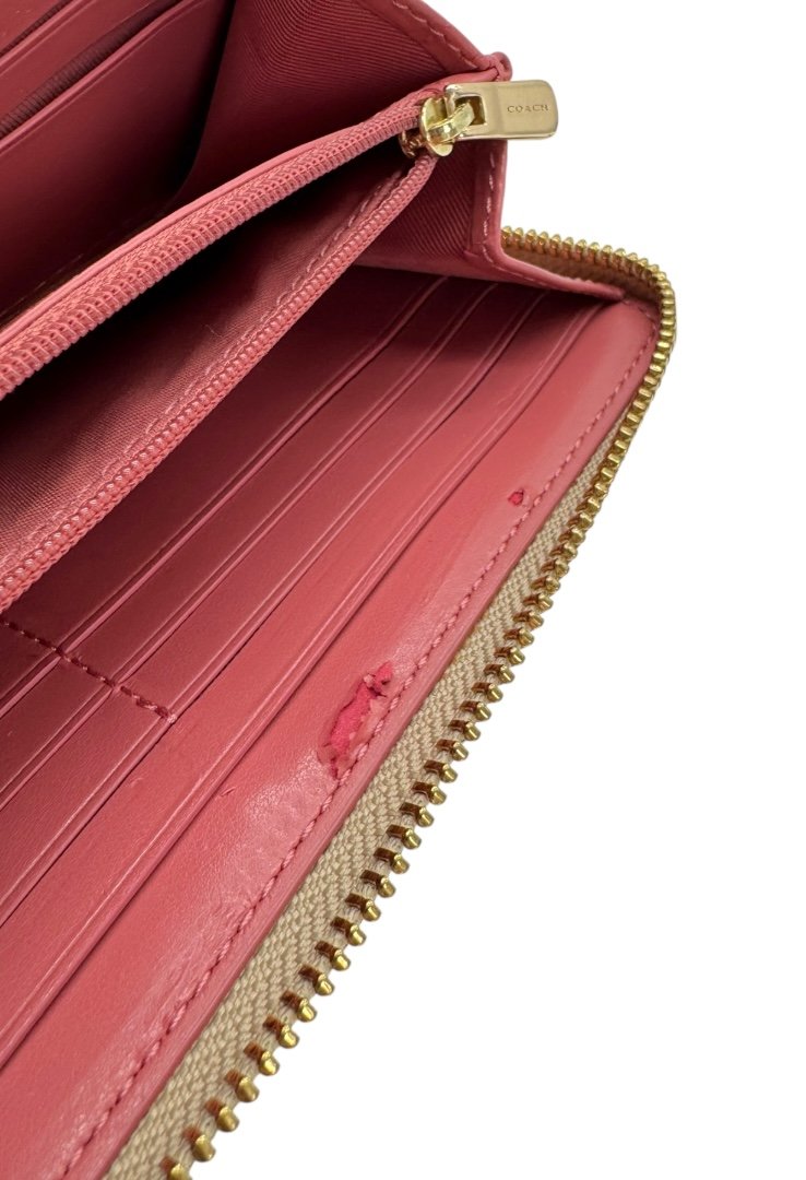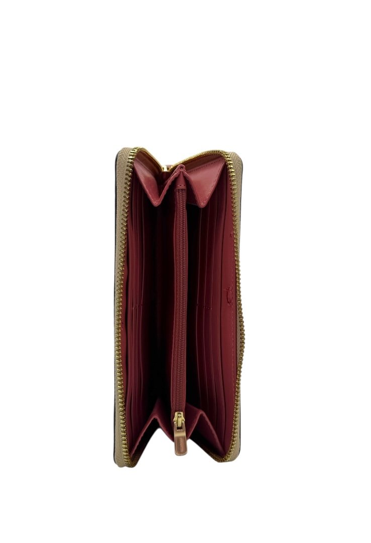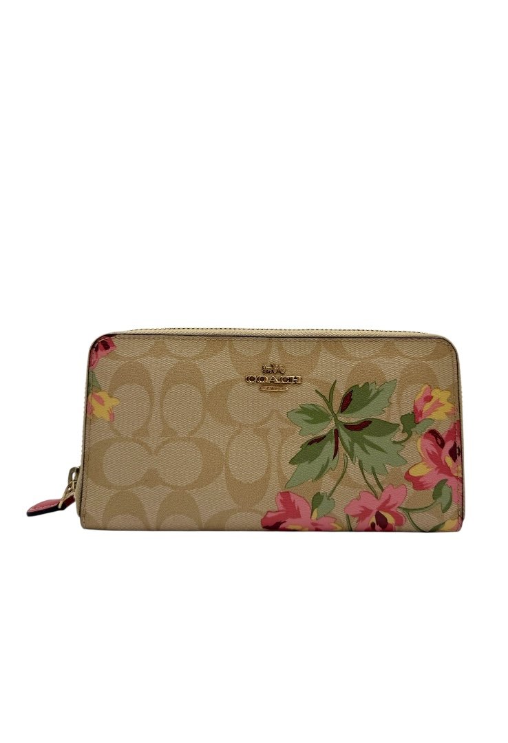 Cartera elaborada en lona revestida diseño monogram, con estampado floral y apliques en dorado.
