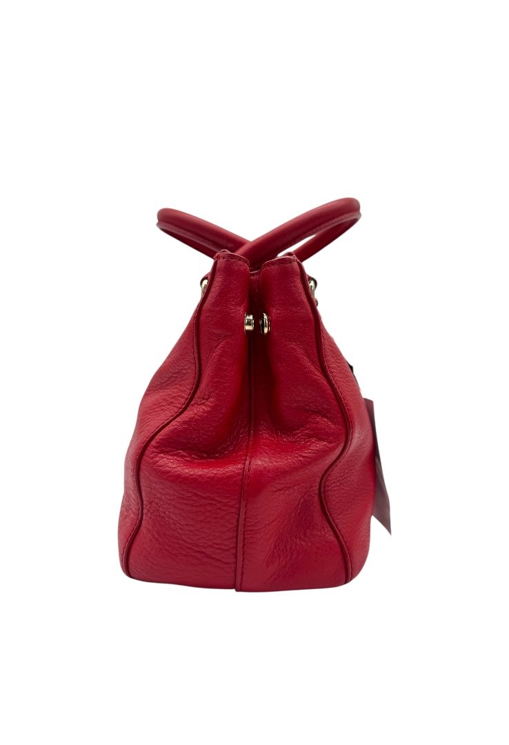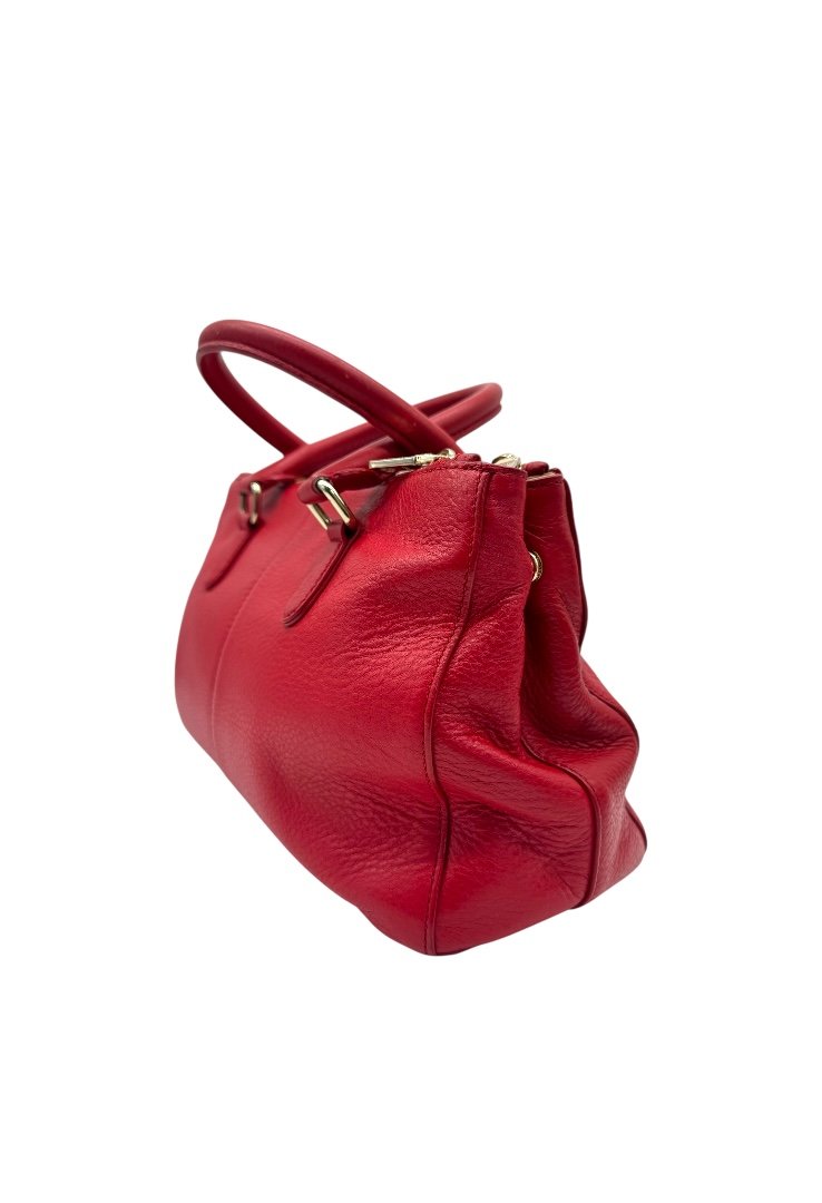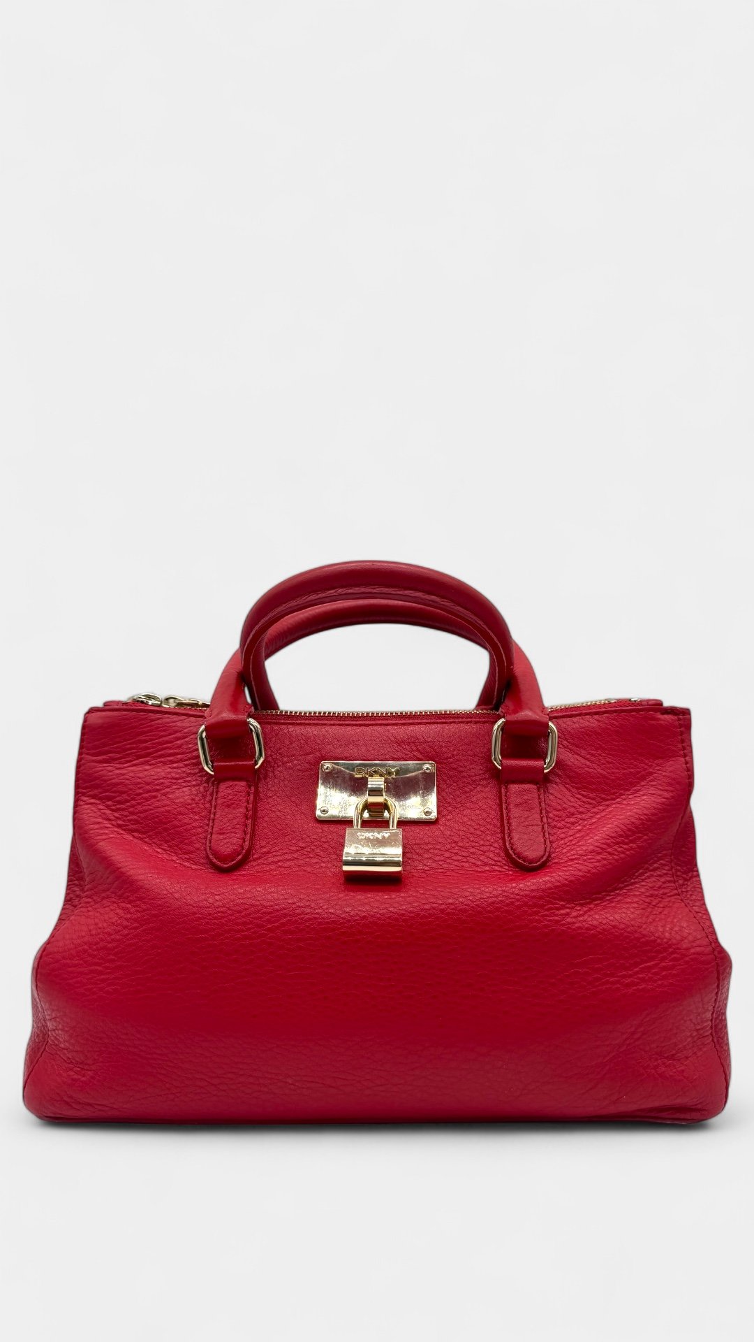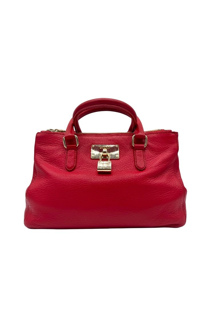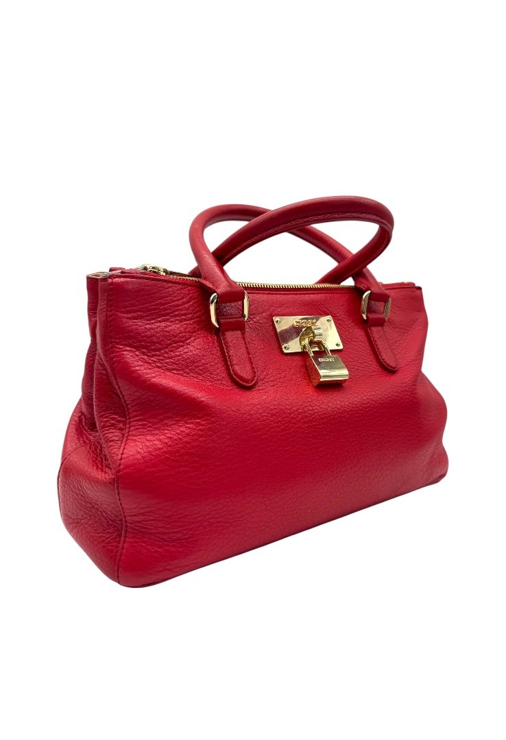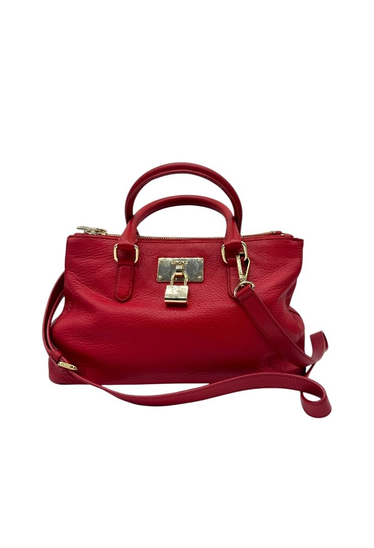 Bolso fabricado en piel sintética, apliques en dorado, candado decorativo, doble compartimento con cremallera, compartimento principal con botón magnético.