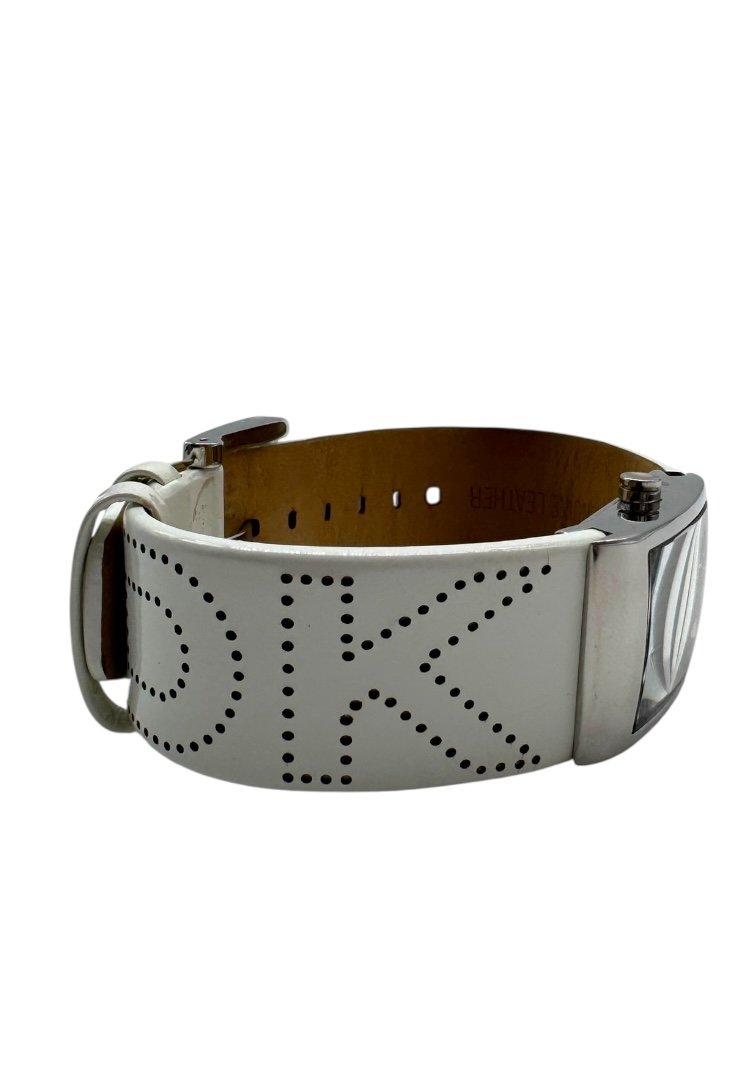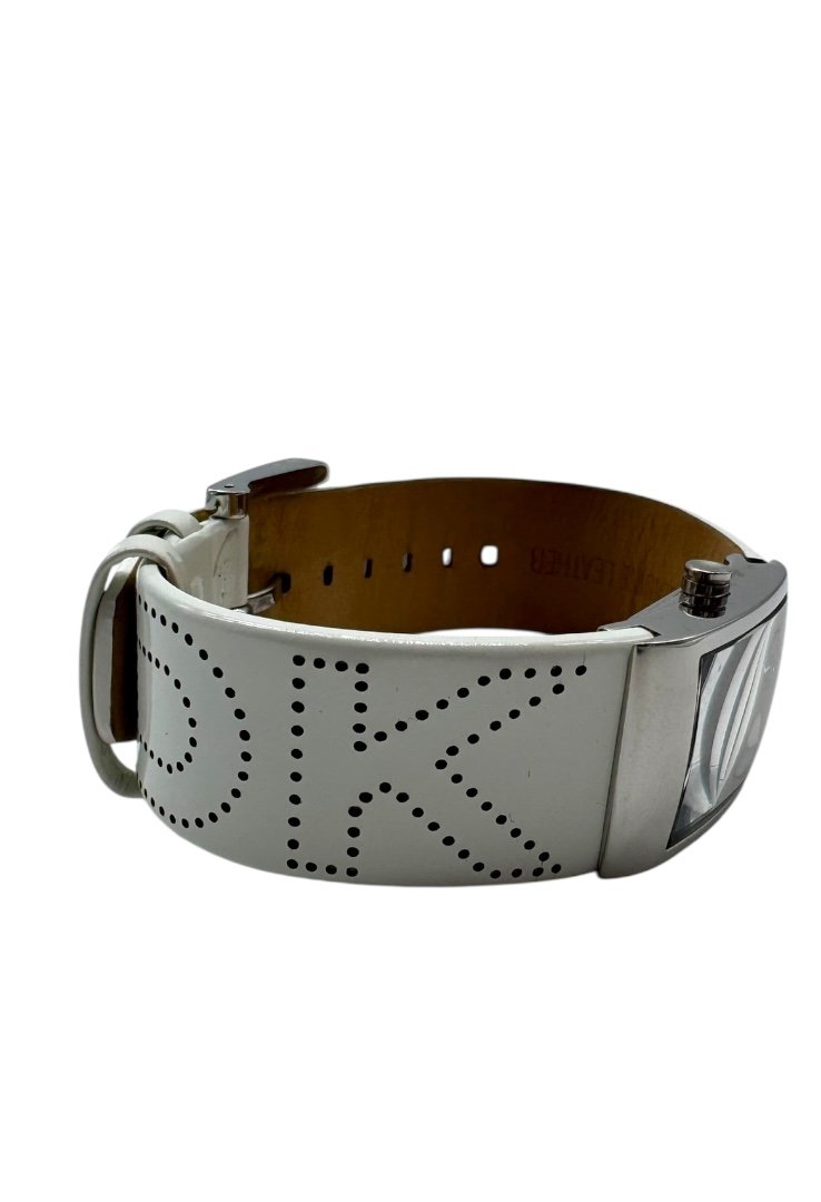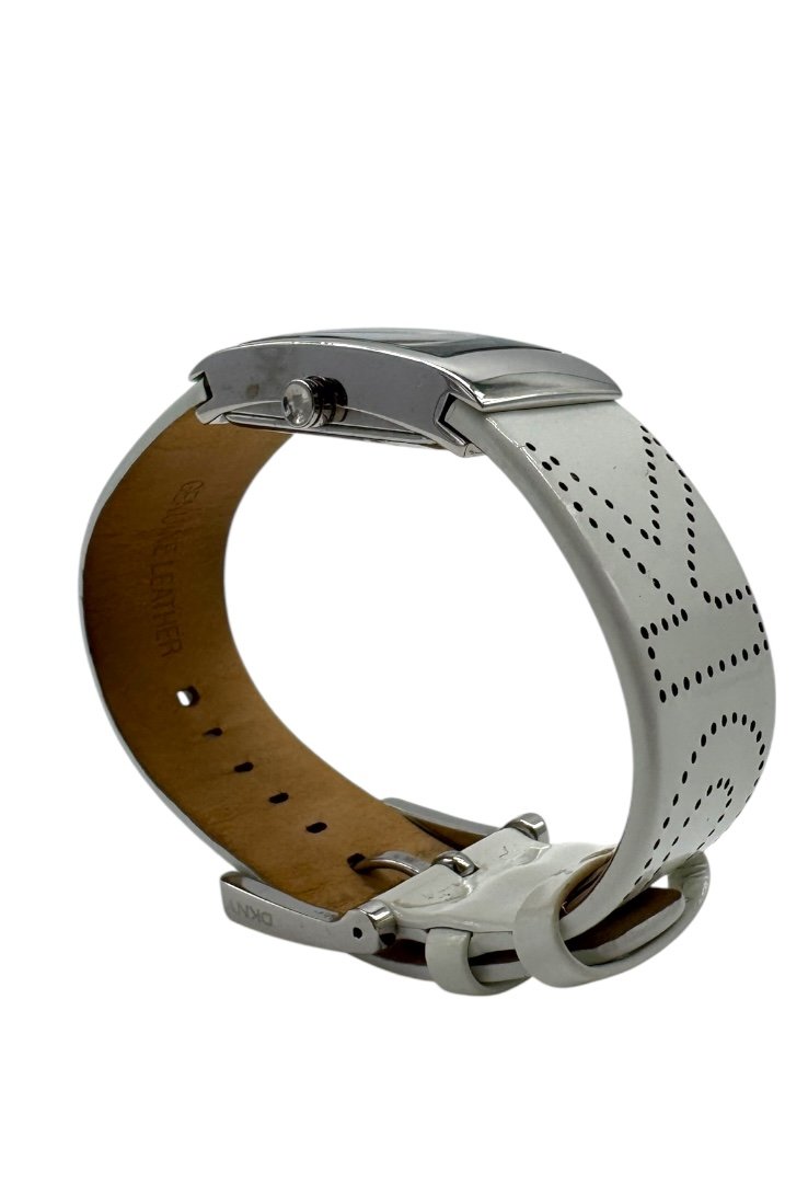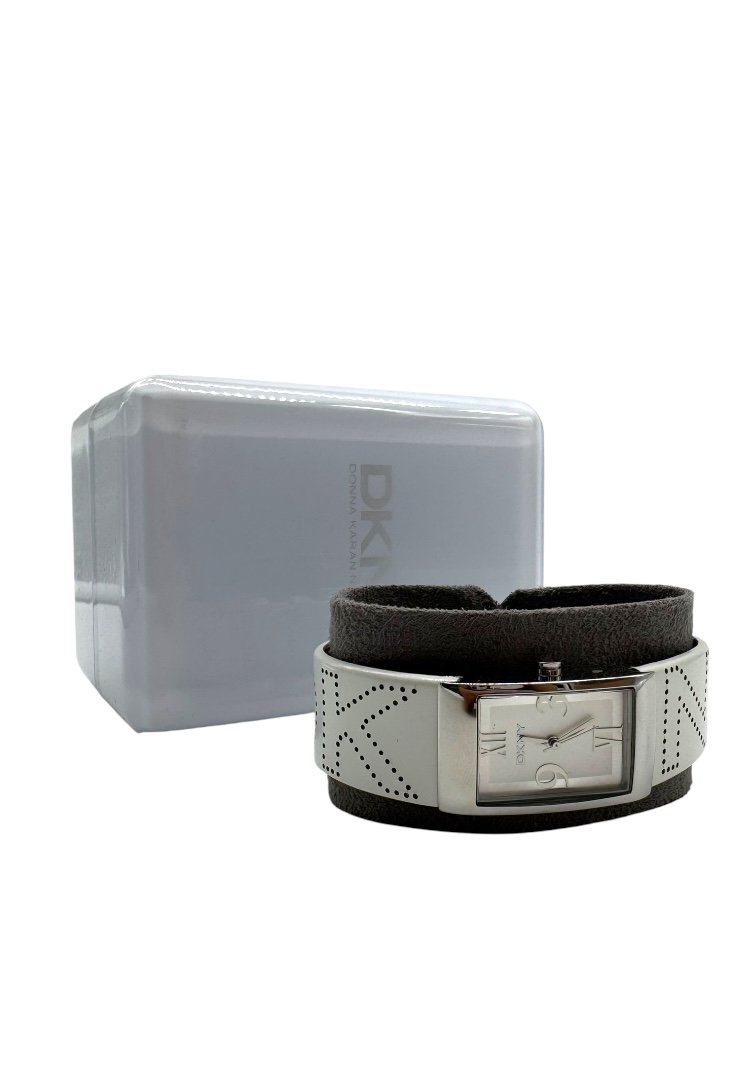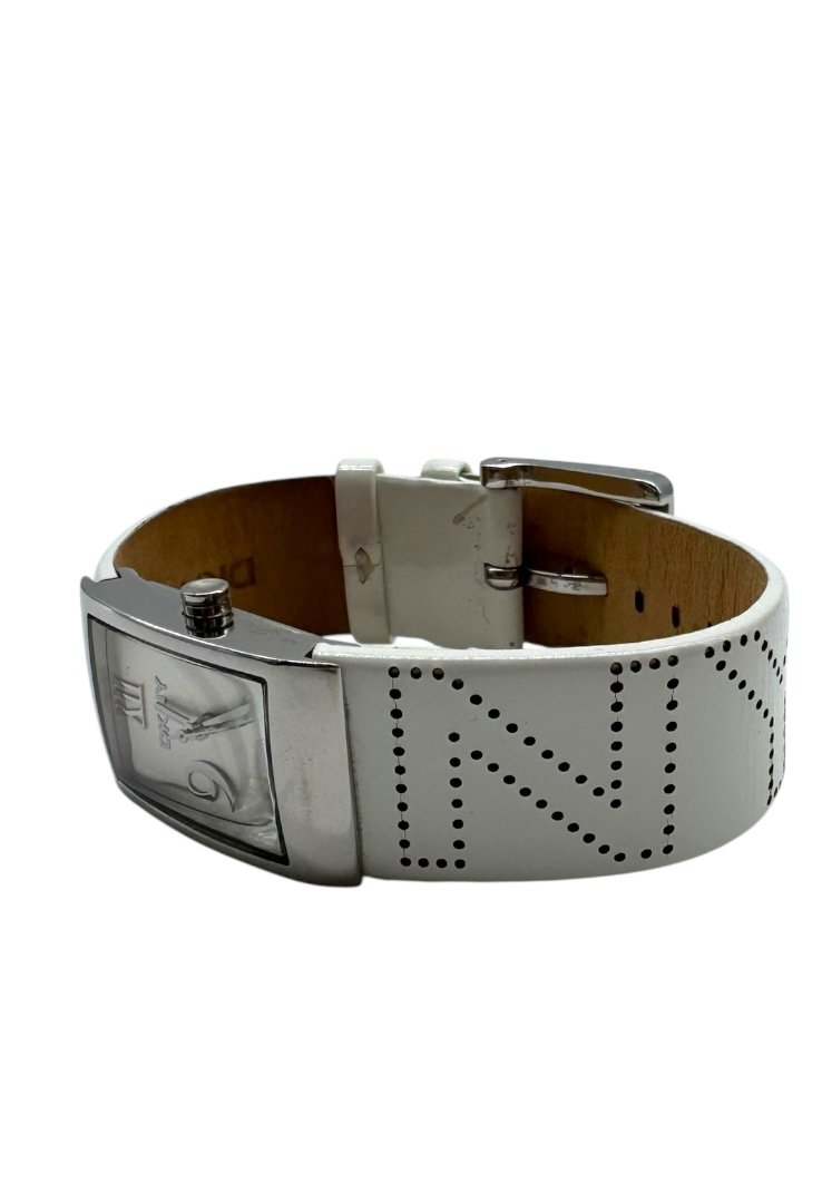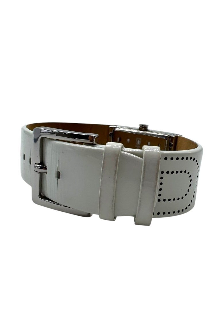 Reloj con caratula de metal en plata, strap de goma con la marca grabada.