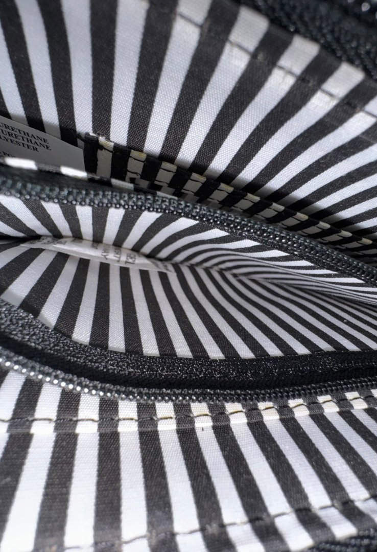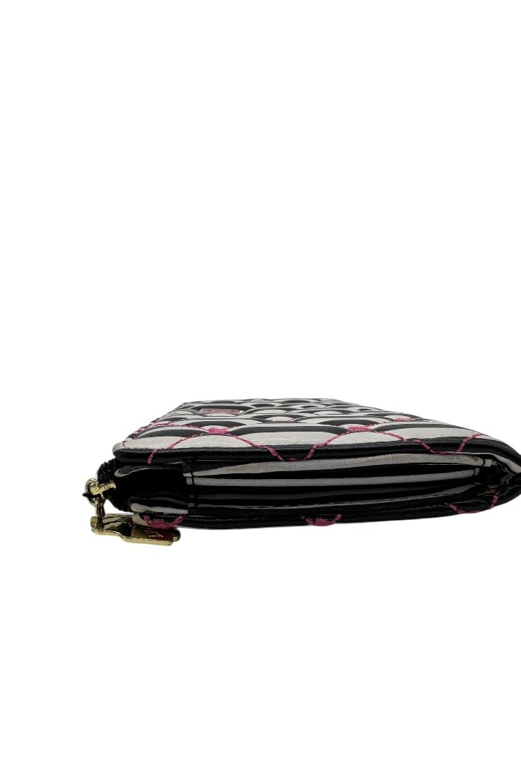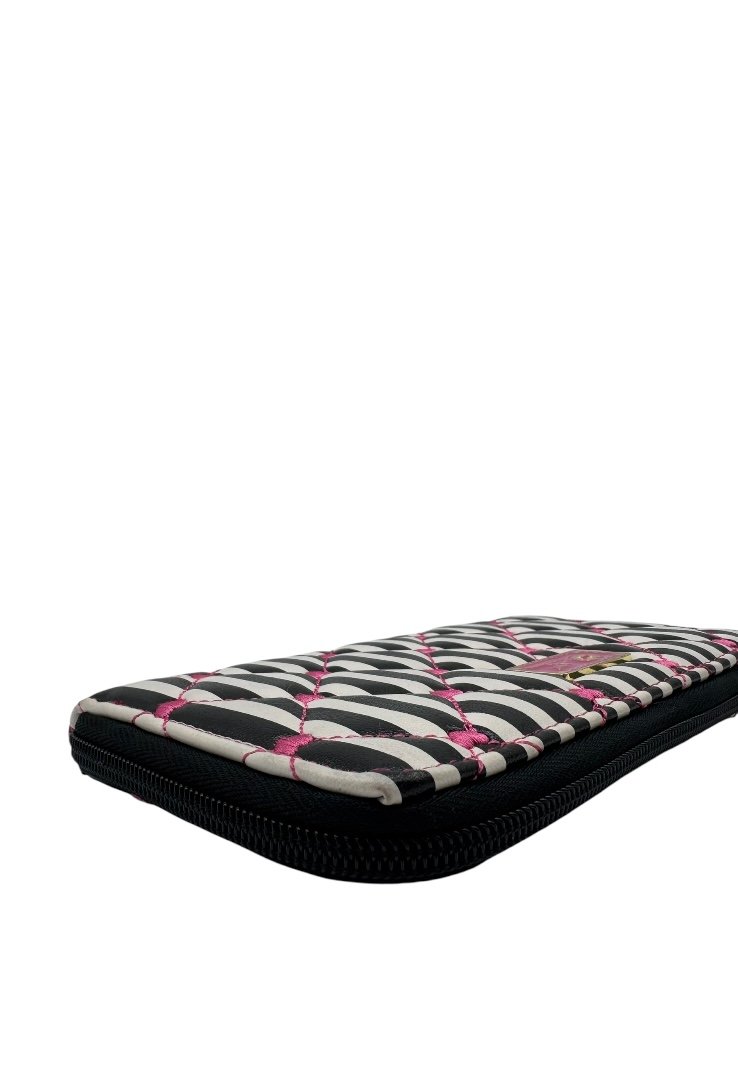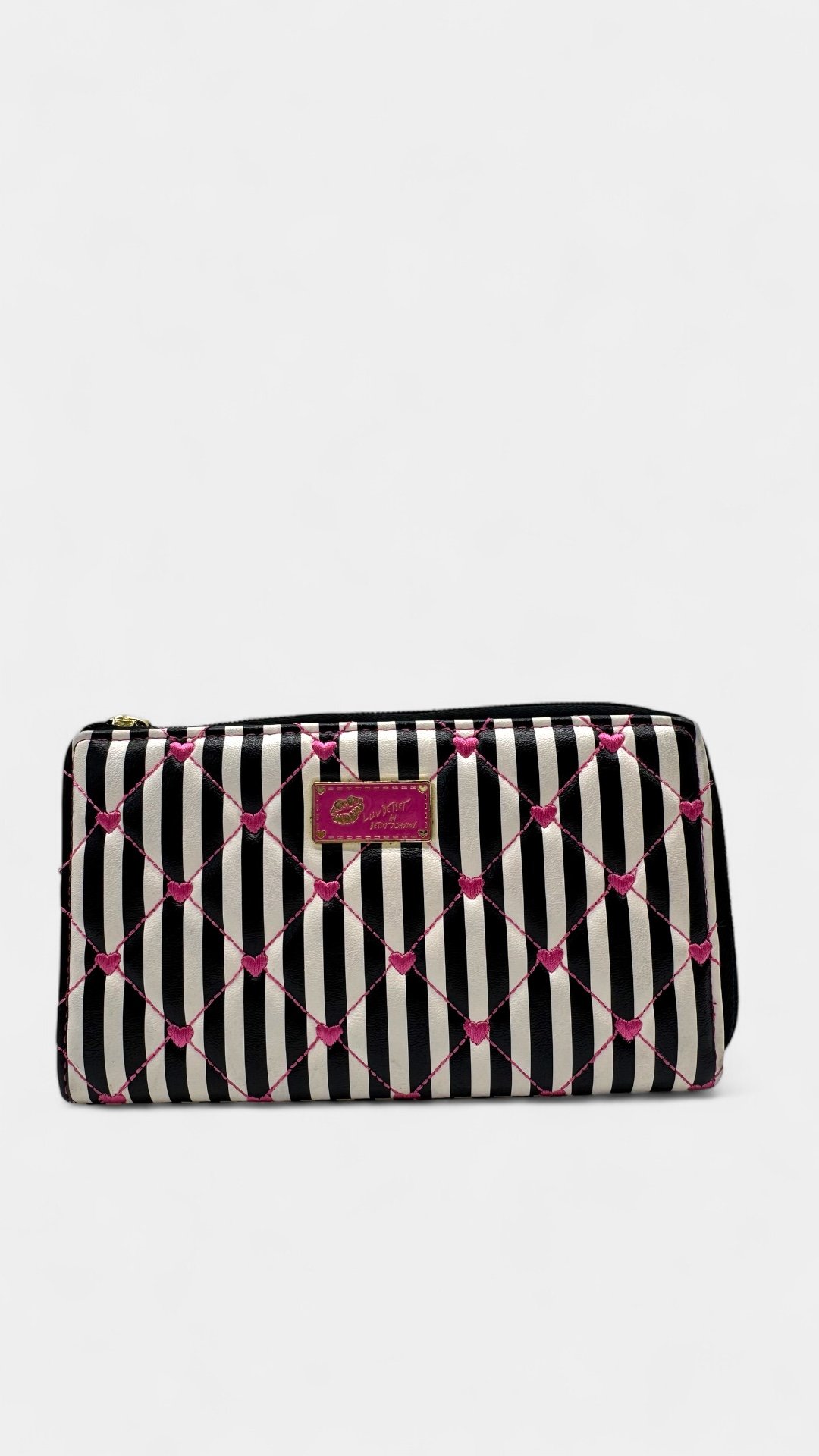 Cartera en piel sintética, estilo acolchonado, con apliques en dorado, diseño de rayas y corazónes.