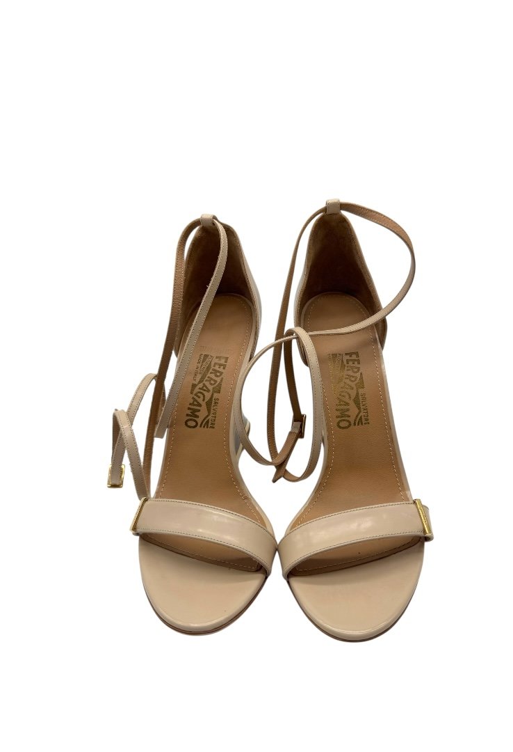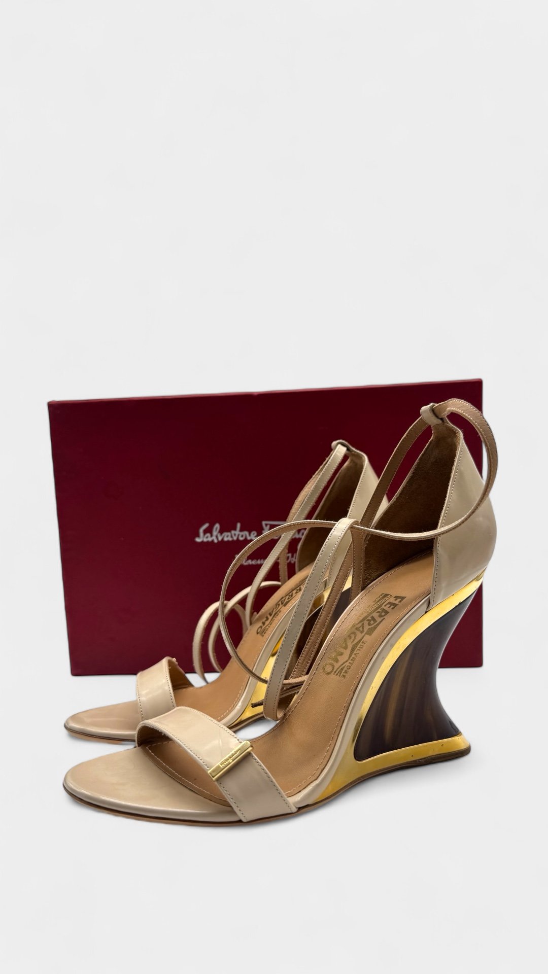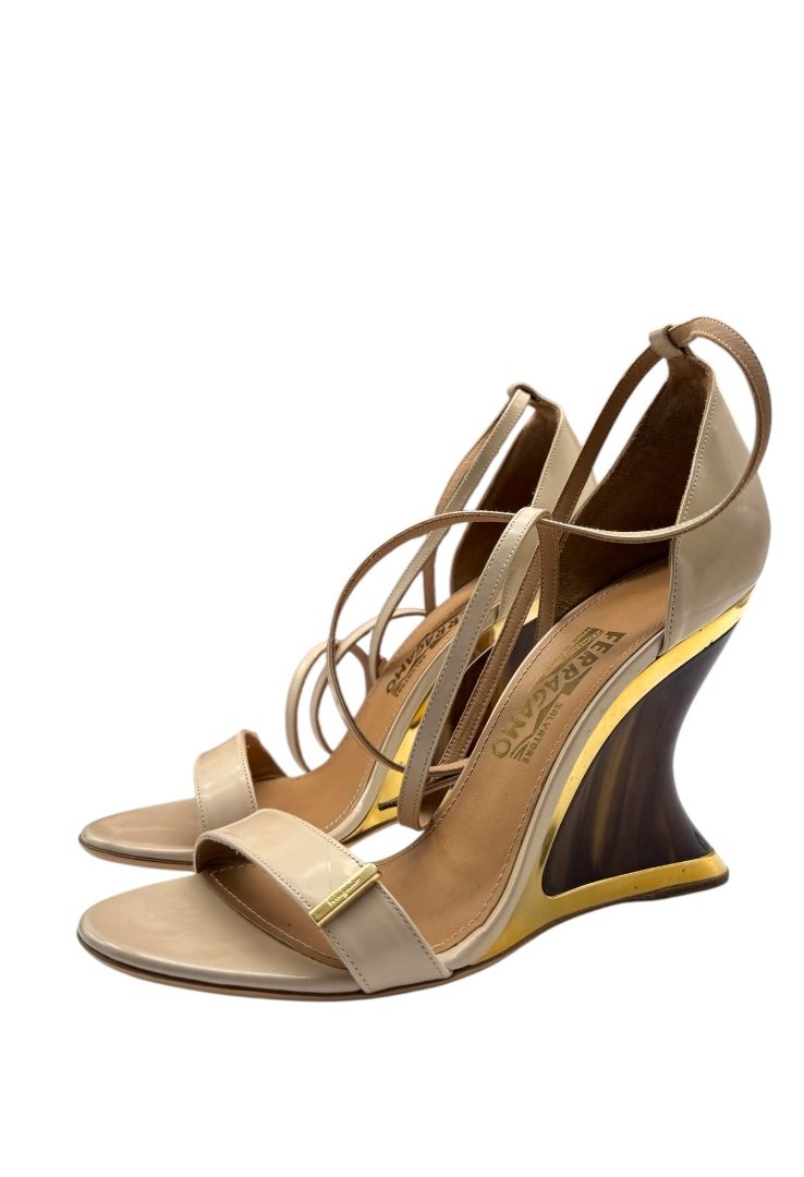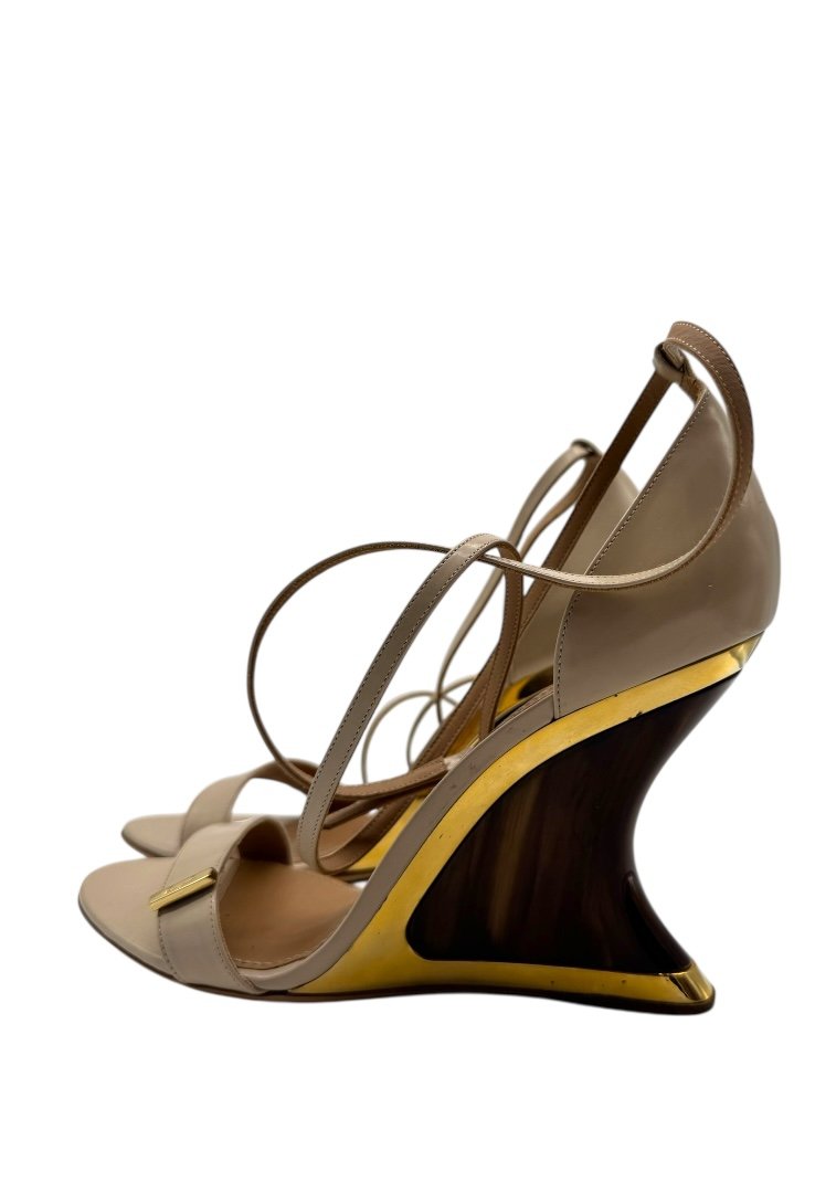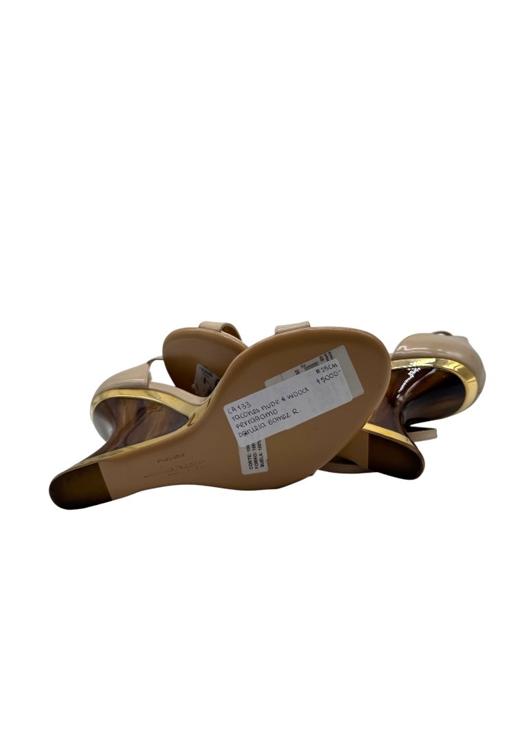 Tacones elaborados en piel con acabado de charol, tacón con aspecto de madera, detalles en dorado.