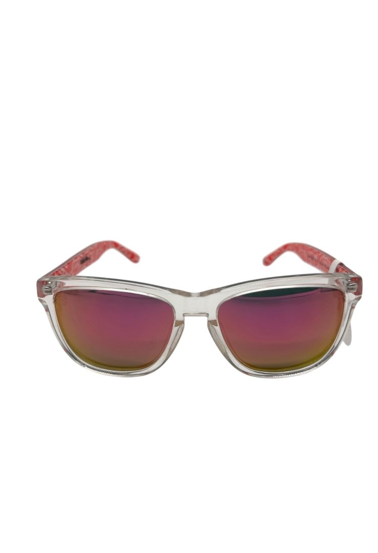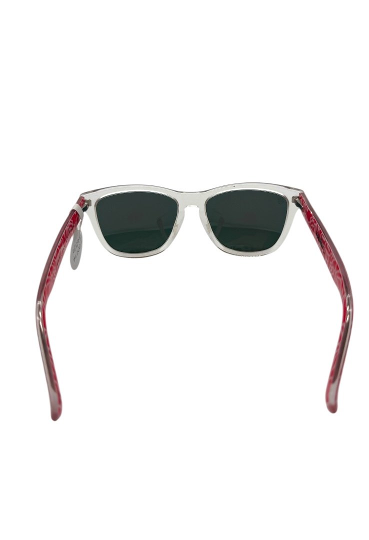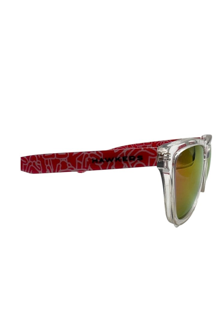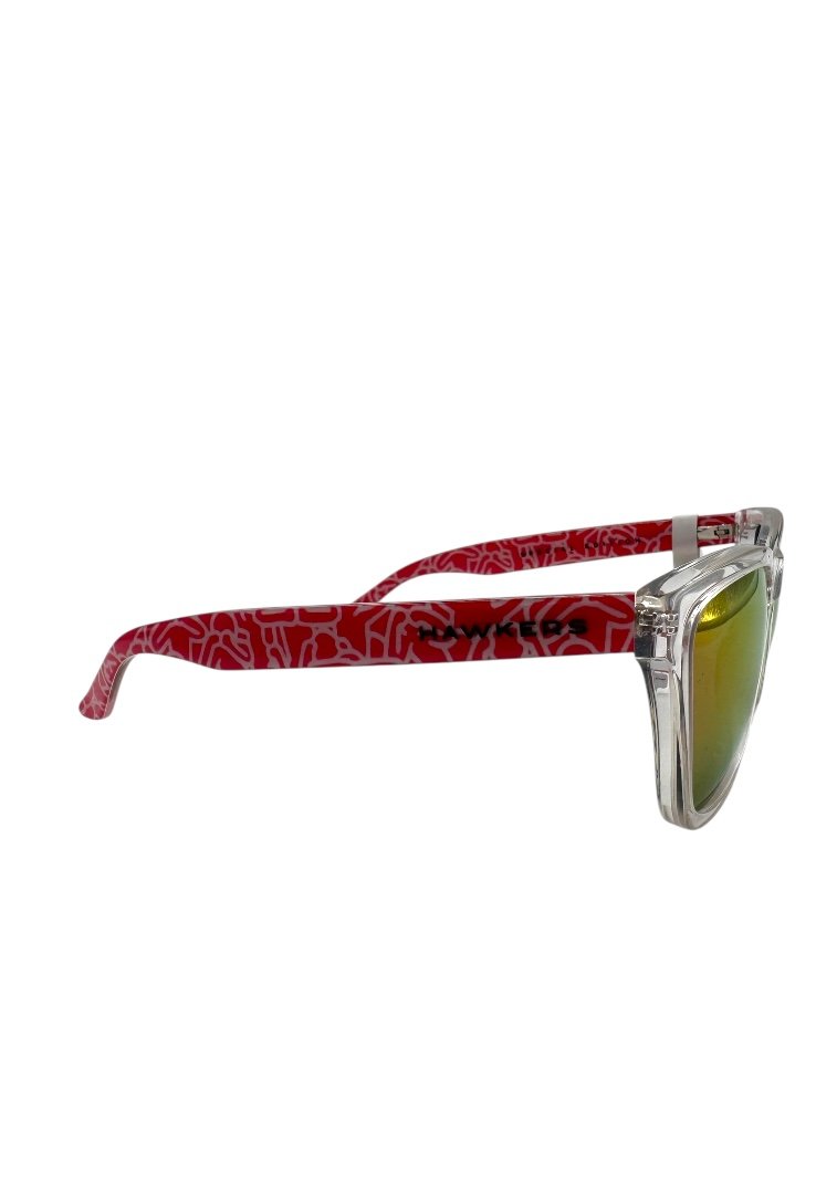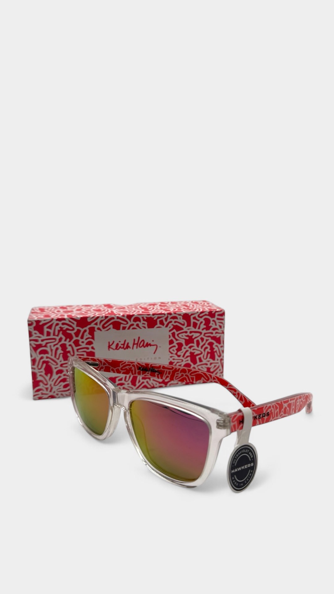 Lentes de sol con colaboración de Keith Haring, en forma cuadrada, micas tornasol, diseño en patillas de keith.