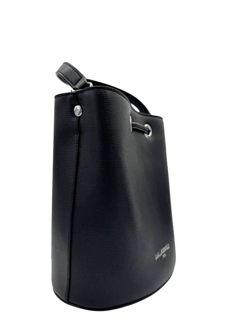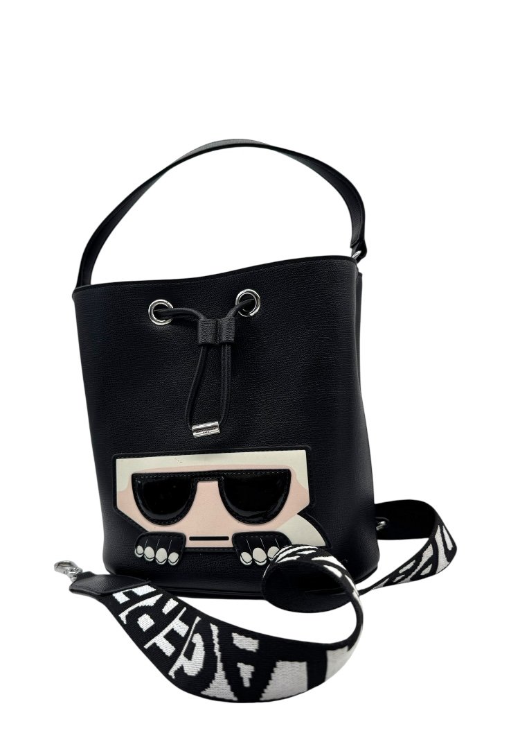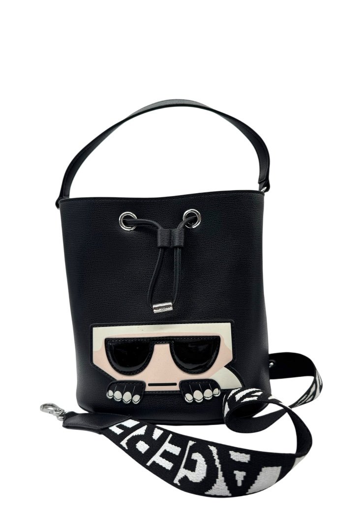 Bolso de cuero, apliques en plata, figura de karl en goma, asa de tela.
