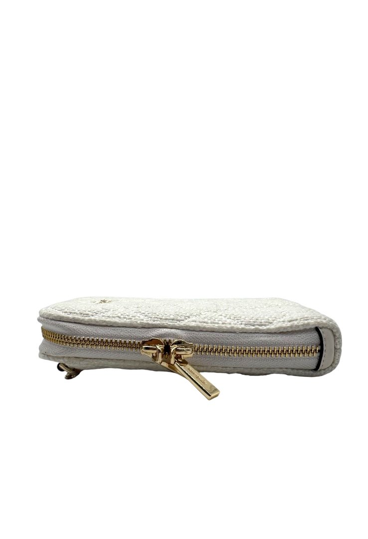 Elaborada en tela, bolsillo tracero exterior, tres ranuras para tarjetas de credito. cierre de cremalletra y monturametalica con el logotipo de la marca