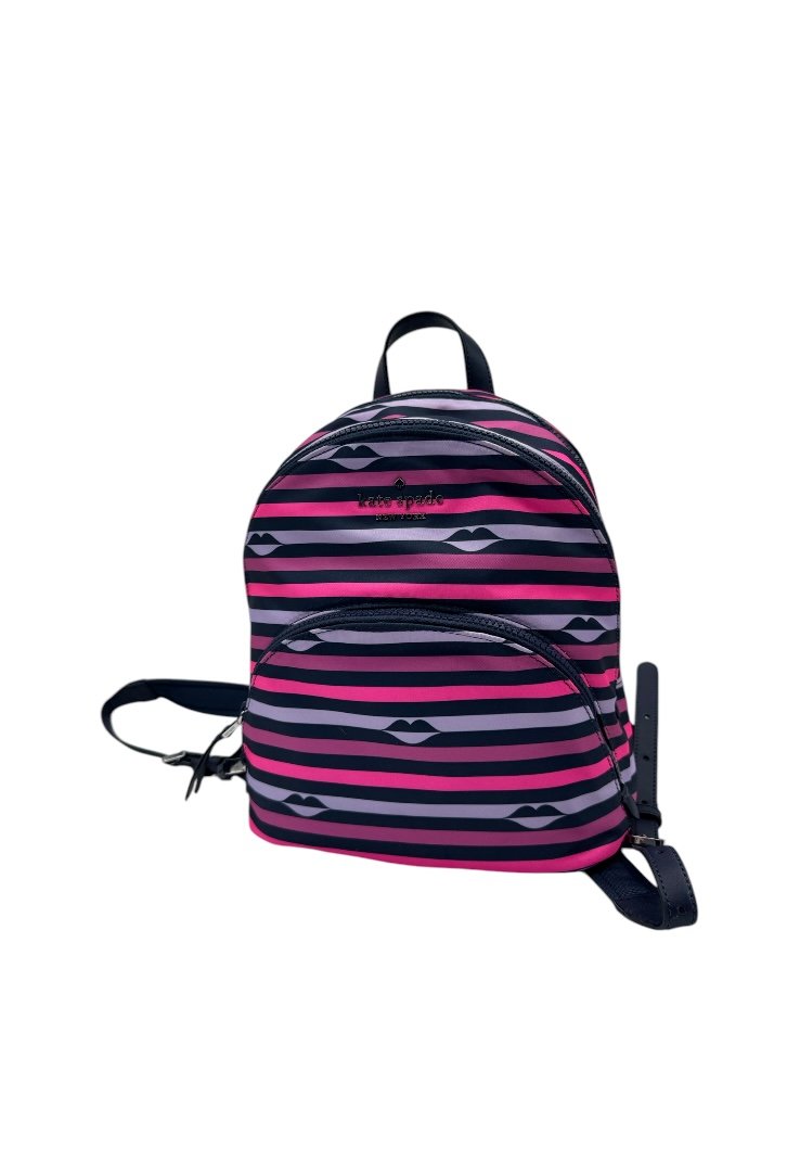 Mochila de nylon con cierres de cremallera y ribete de cuero suave; compartimento trasero acolchado con cremallera, correas ajustables.