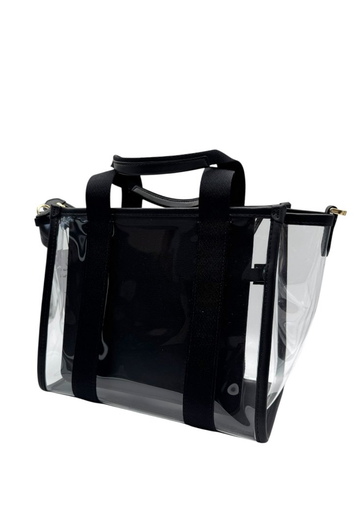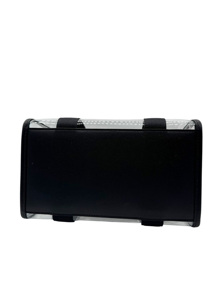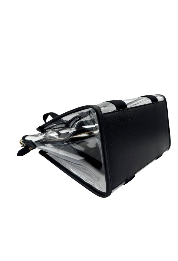 Bolso elaborado en tela, con partes transparentes, apliques en dorado, asa ajustable, cierre de cremallera.