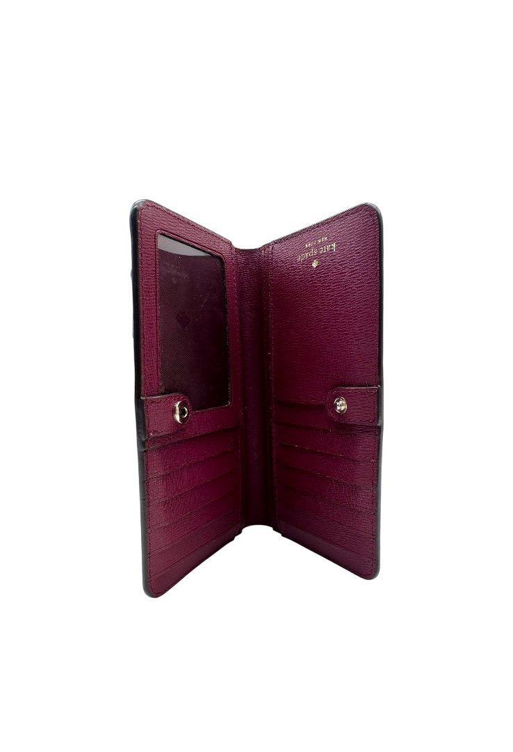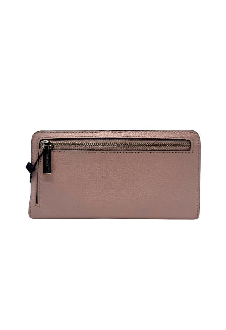 Cartera color rosa de piel, con interiores en color vino, con herrajes y logo en dorado.