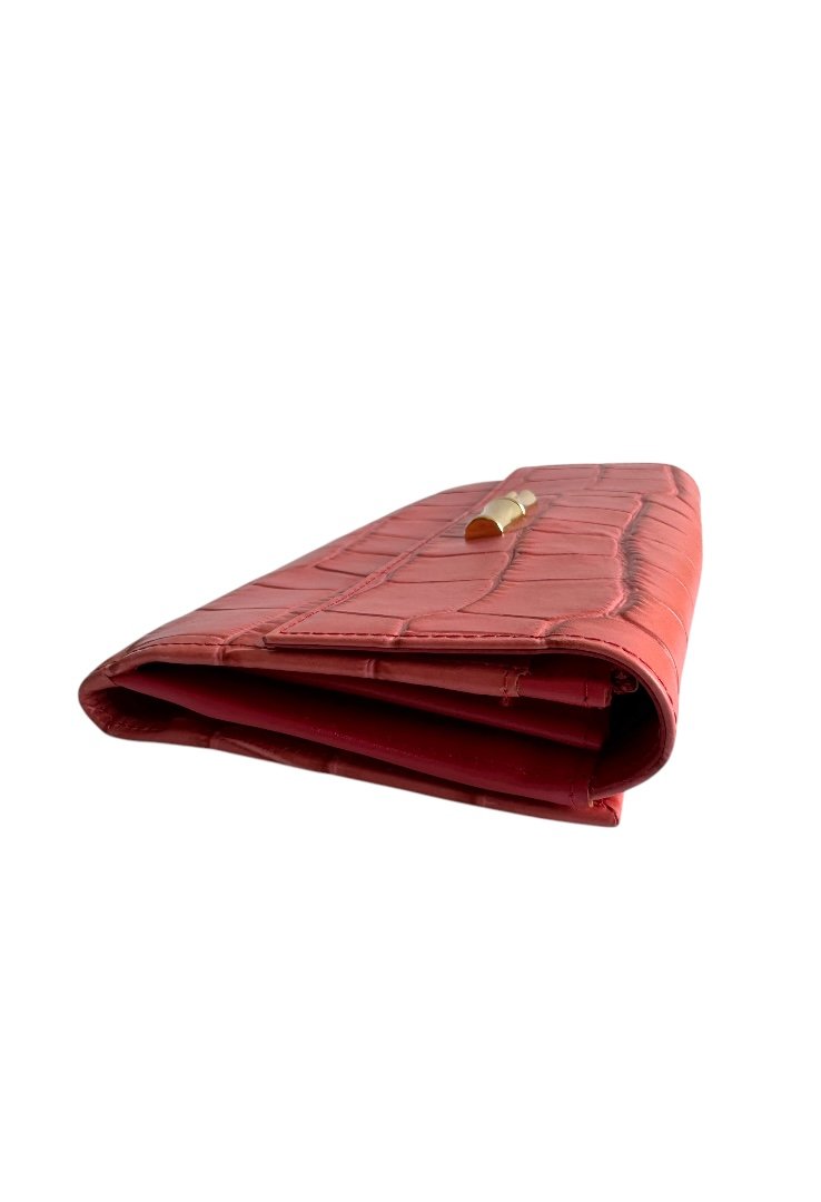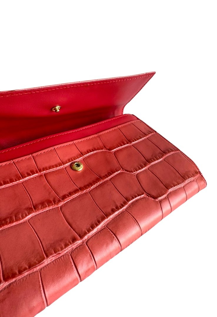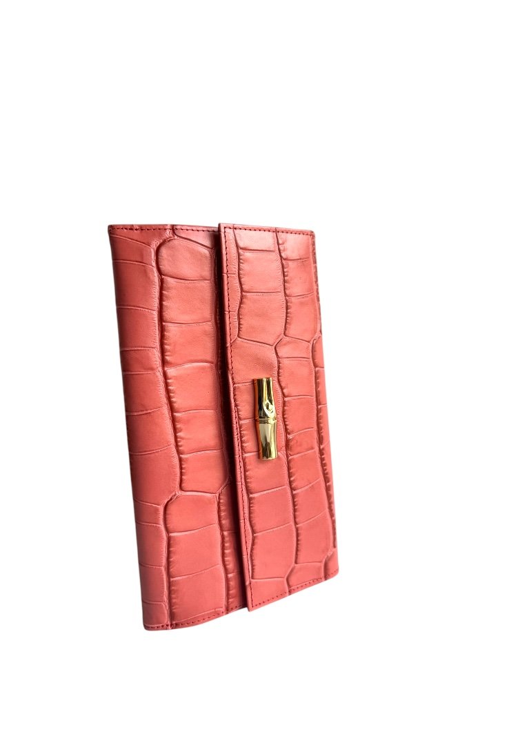 Confeccionada en piel imitación cocodrilo, con cierre de solapa broche en forma de bambú, detalle emblemático de la línea, adorna los modelos como una joya, añadiendo un toque de brillo y feminidad.