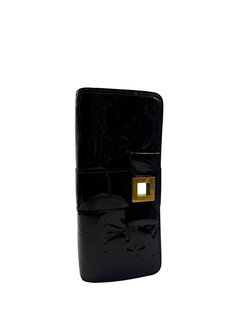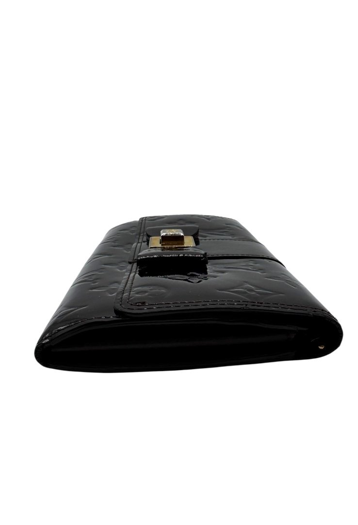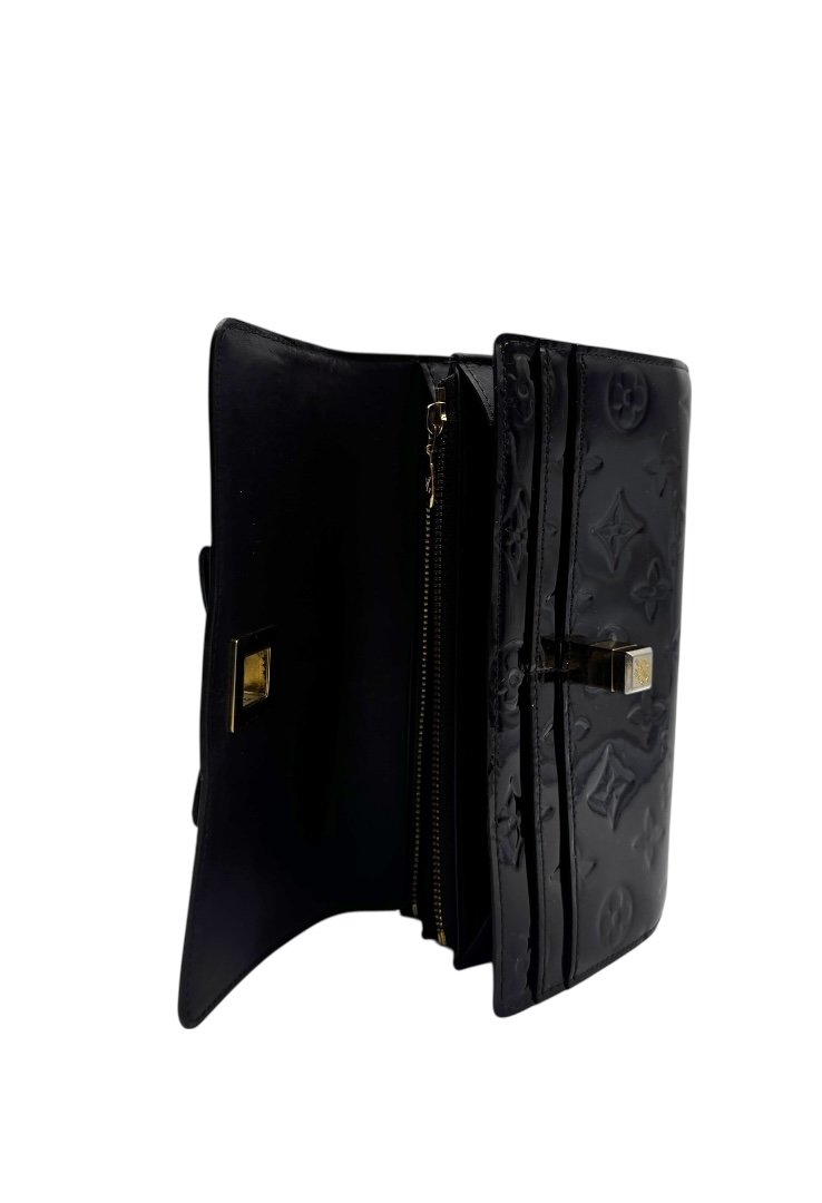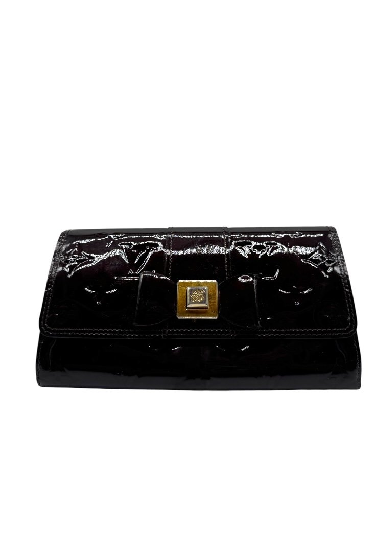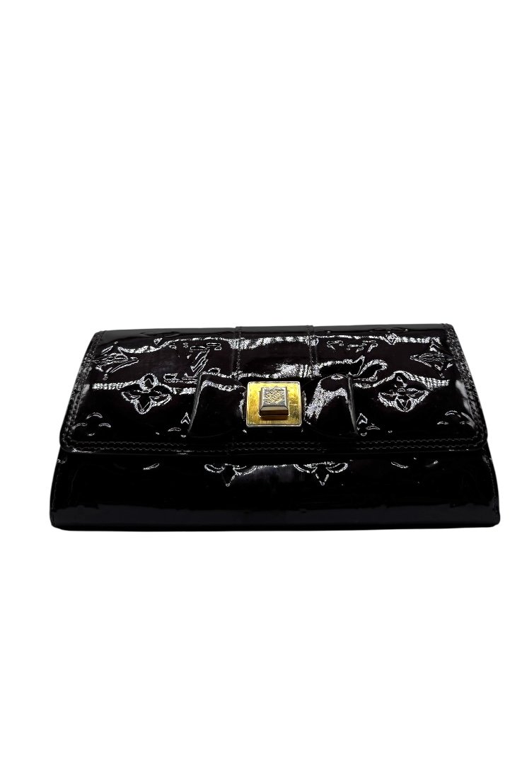 Cartera en acabado charol, diseño monogram, cierre en solapa con broche, apliques en dorado.