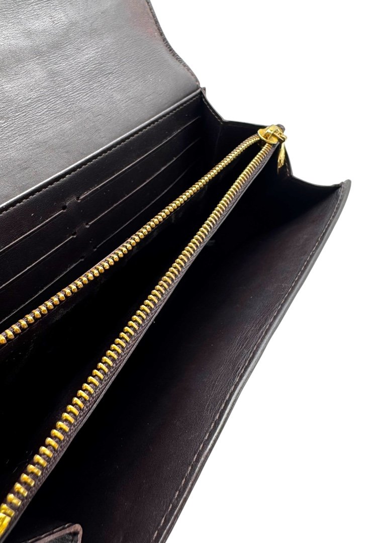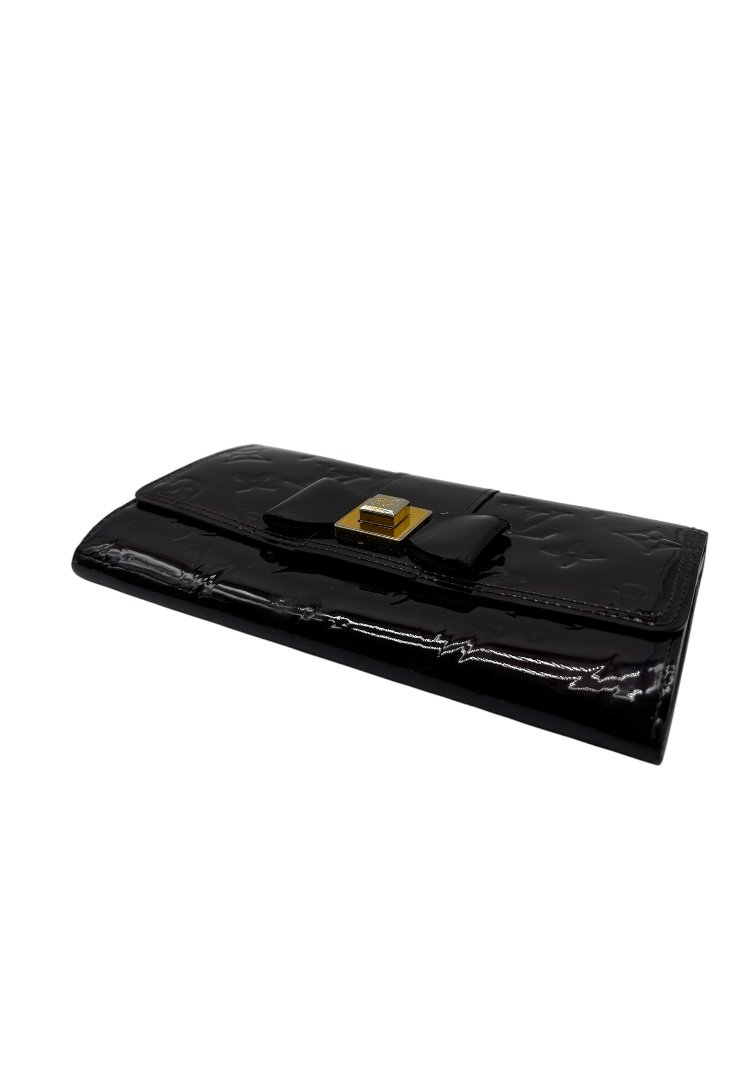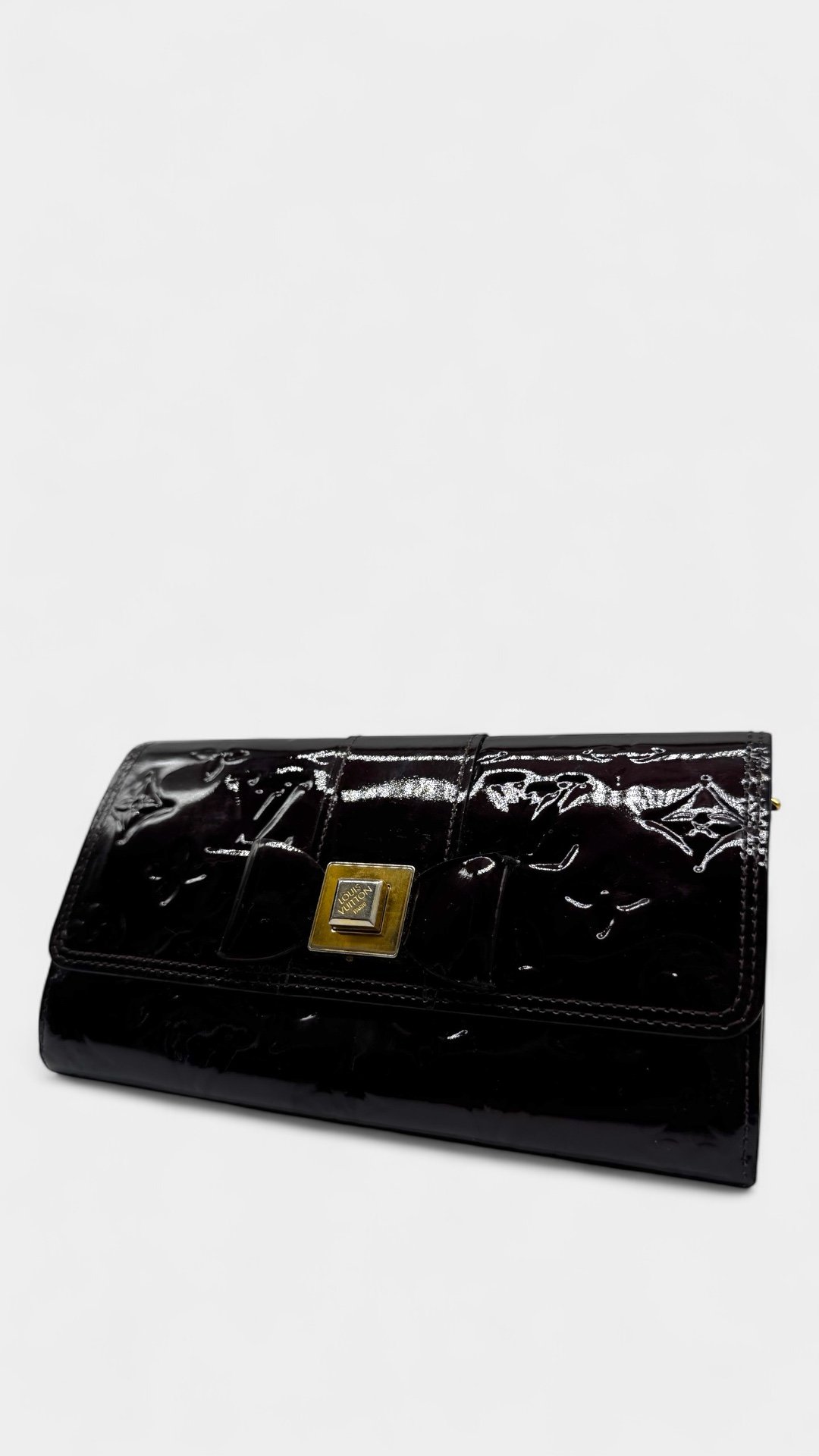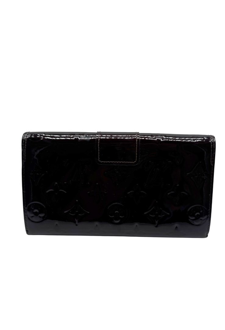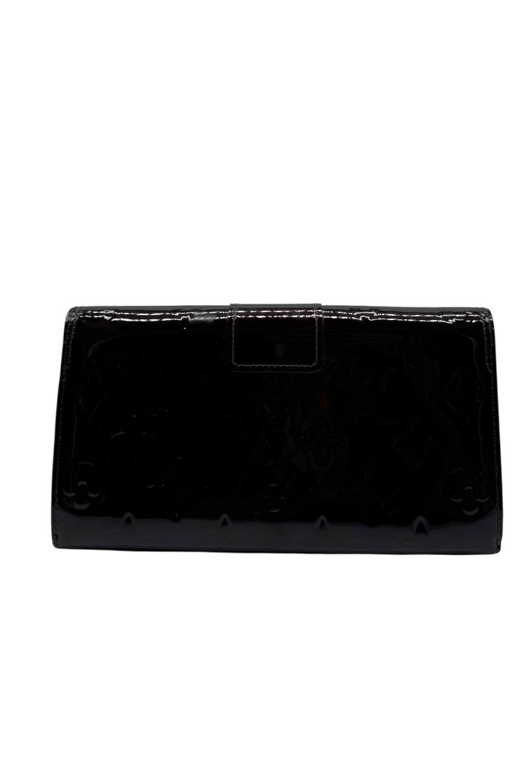 Cartera en acabado charol, diseño monogram, cierre en solapa con broche, apliques en dorado.