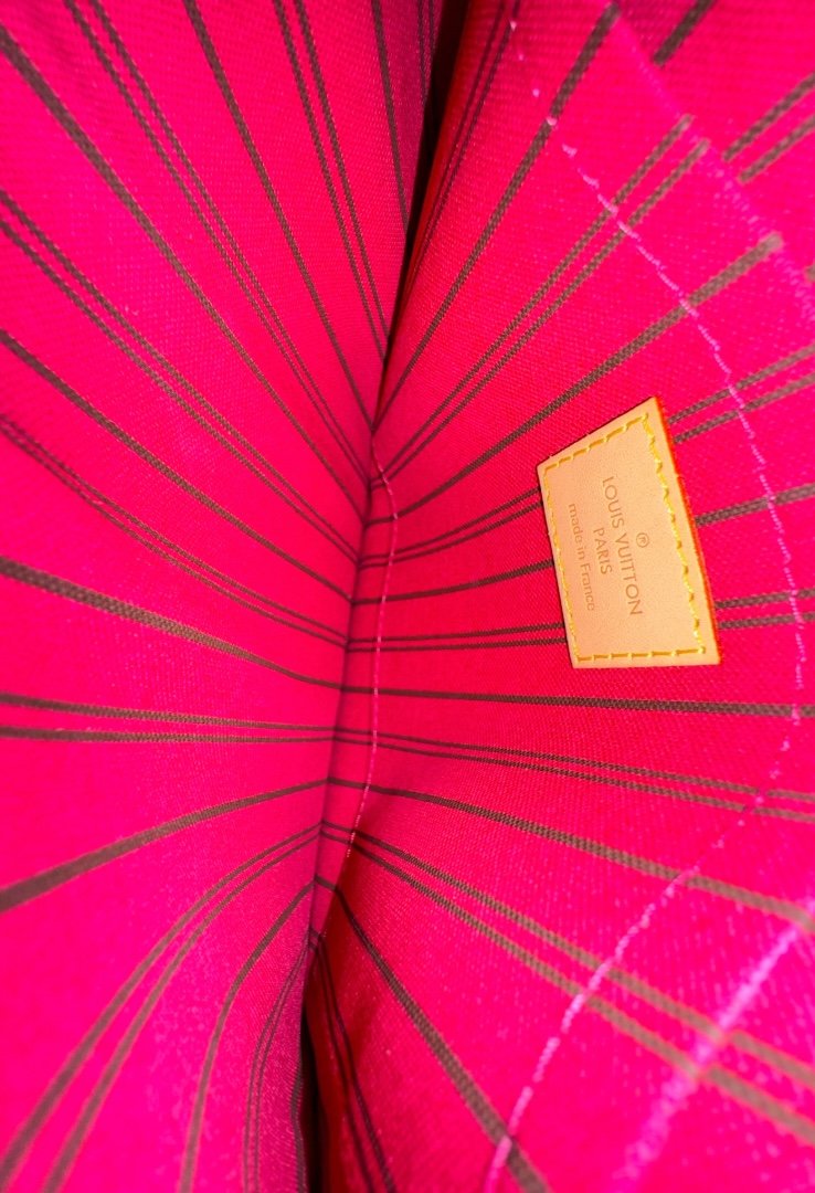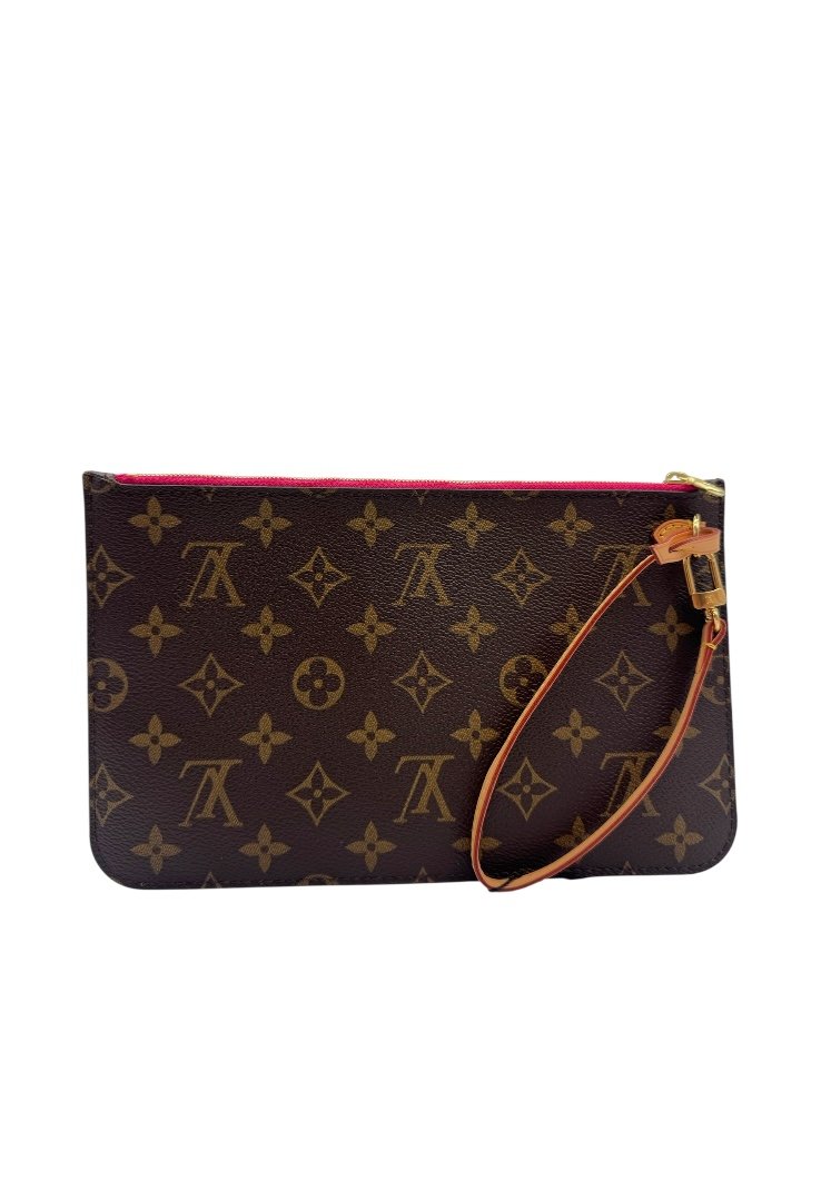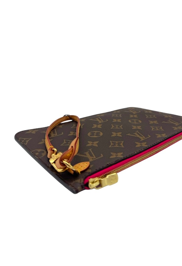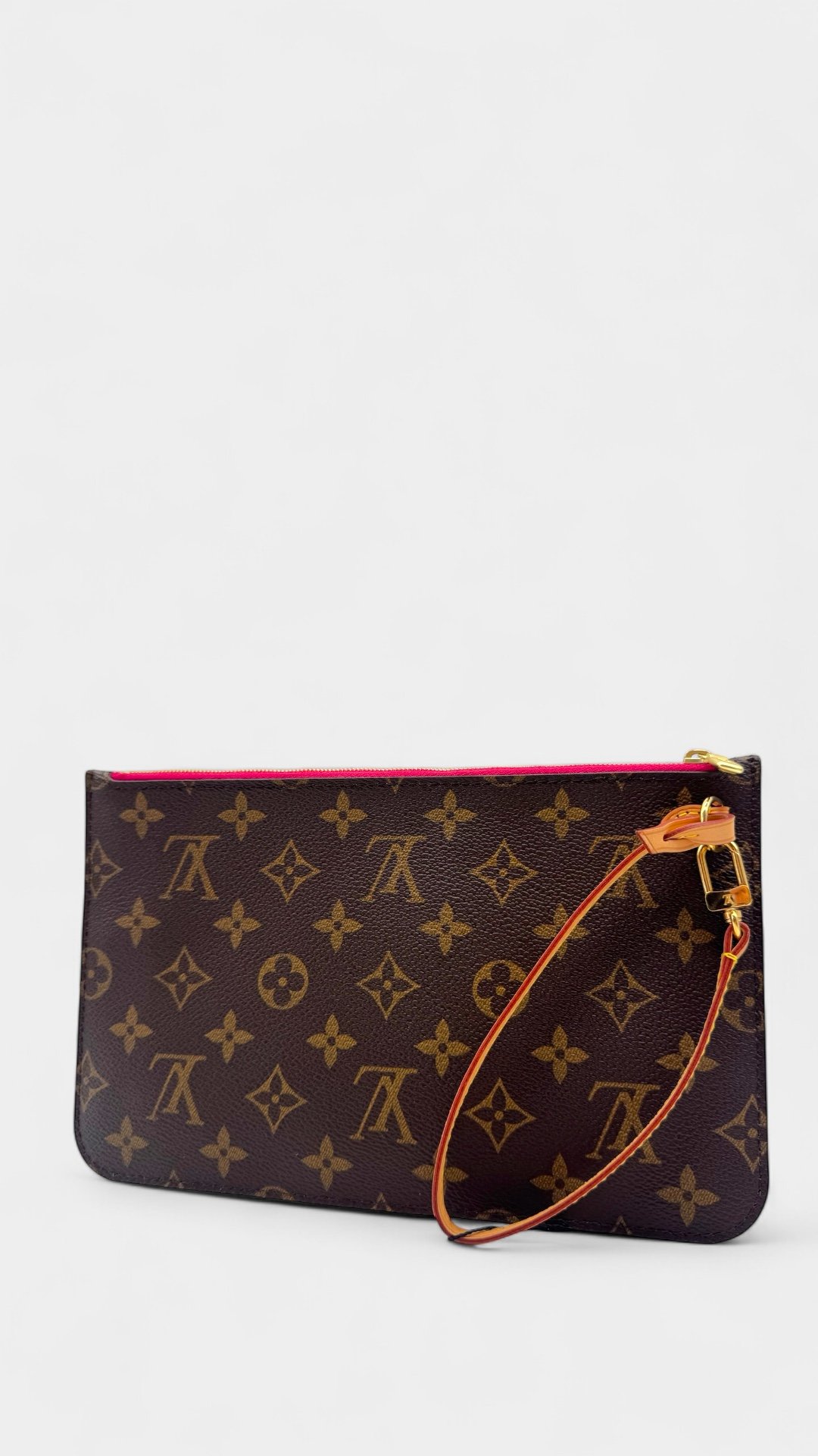 Pochette elaborado en lona monogram, interior de tela en fucsia.