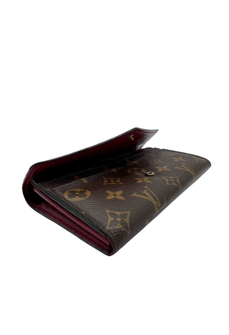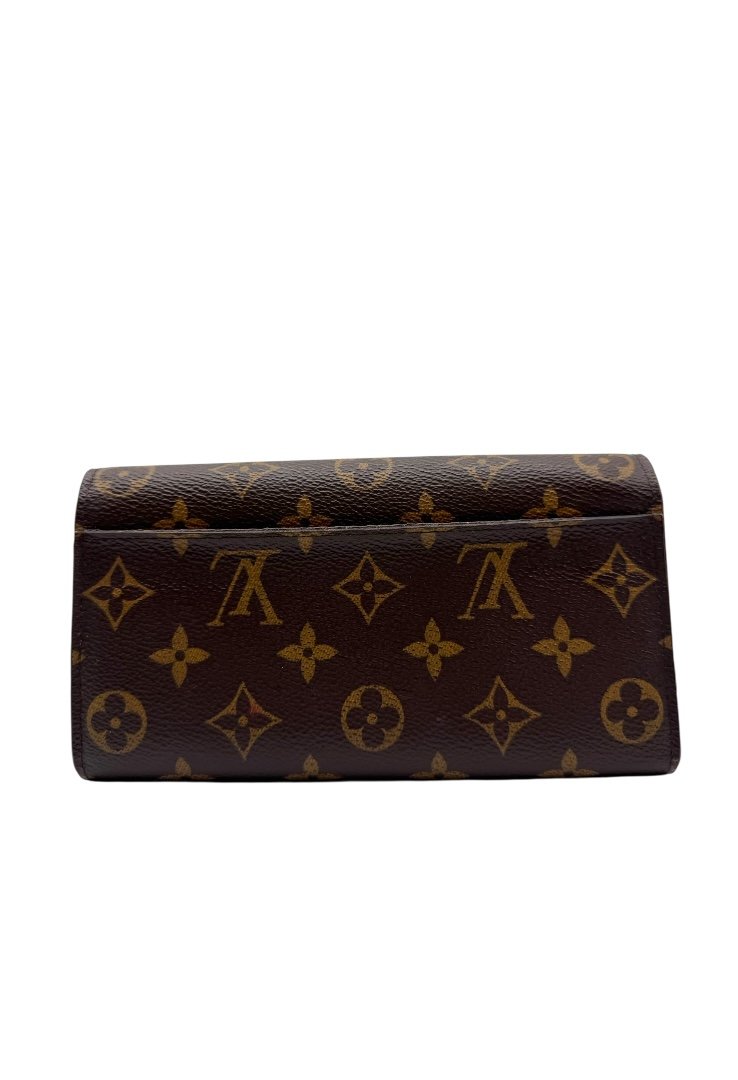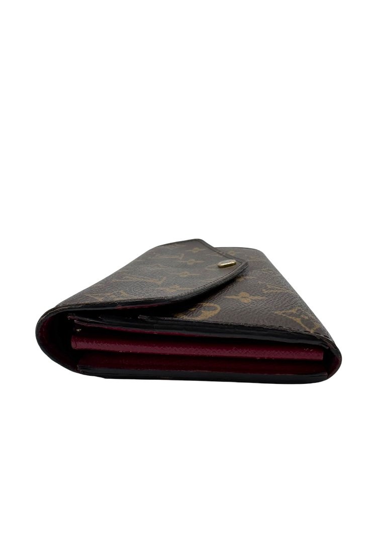 Cartera elaborada en lona con diseño monogram, forro en piel granulada, compartimentos para tarjetas y monedas, apliques en dorado.