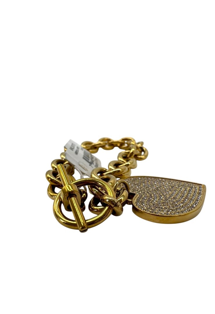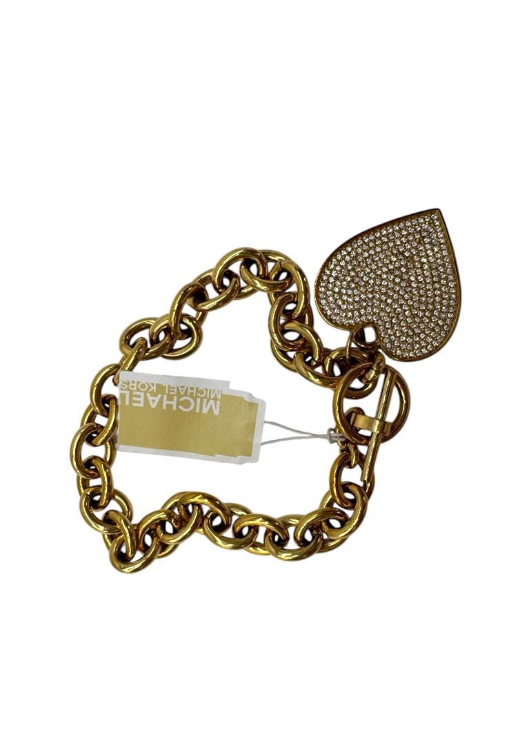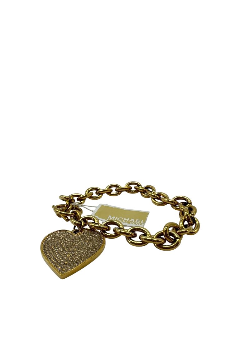 Pulsera de latón con, chapeada en oro, dije de corazón con pedrería de fantasia incrustada.
