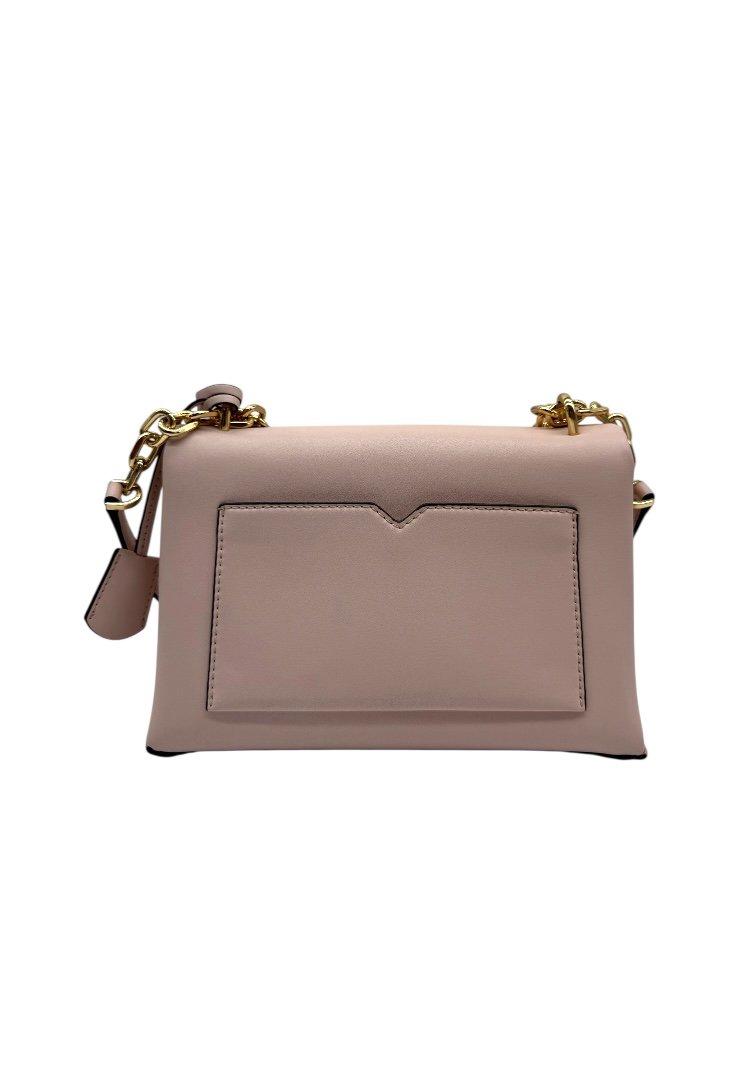 Detalles exteriores bolsillo trasero, bolsillo trasero, 3 bolsillos frontales para tarjetas. Forro interior, cierre a presión y cadena en color dorado.