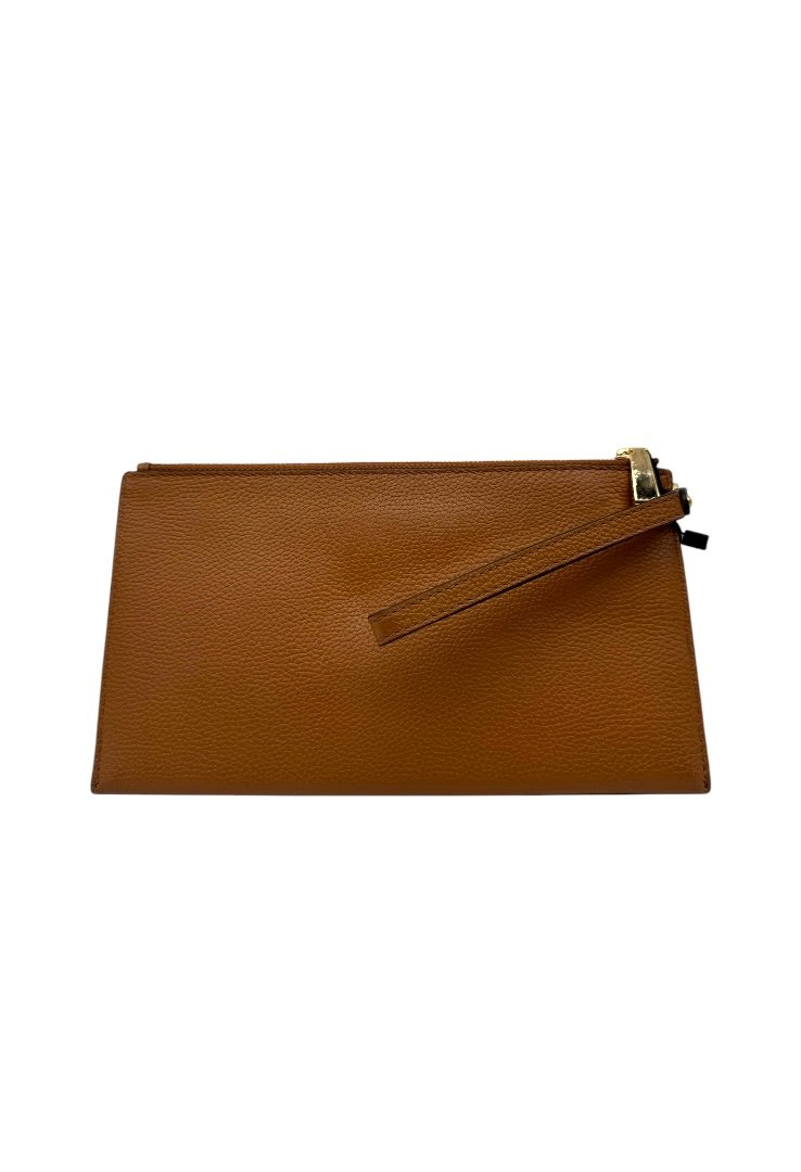 Fabricada en piel con logotipo de la marca en la parte delantera, forro de tela personalizada, un bolsillo deslizante y correa de mano.