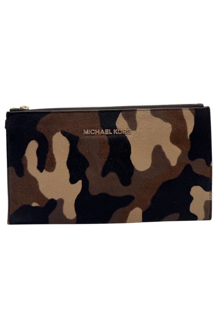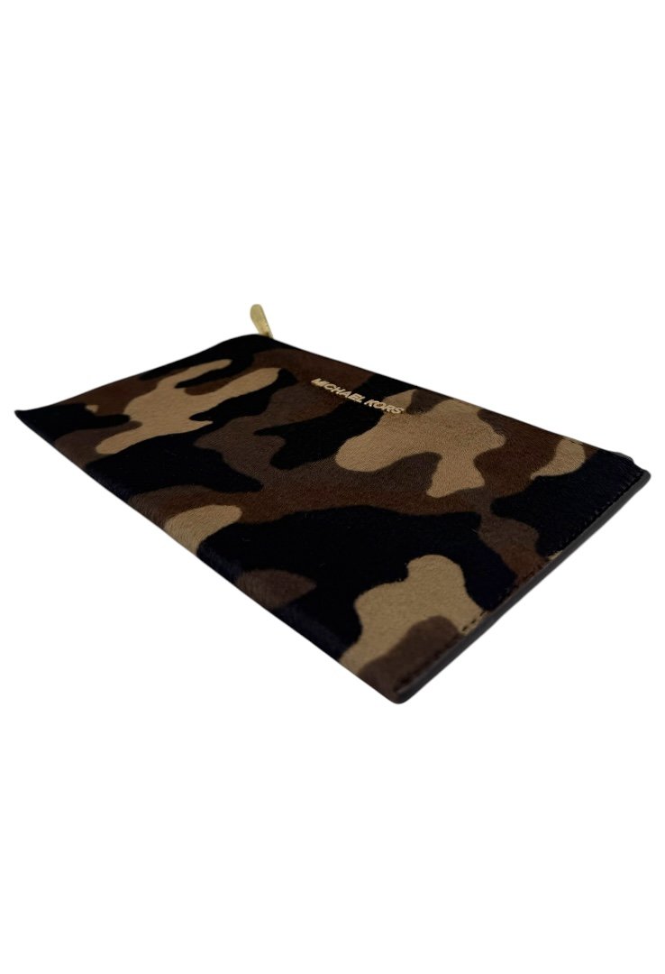Fabricada en piel con logotipo de la marca, diseño de camuflaje , con una correa de mano y cierre de cremallera dorada.