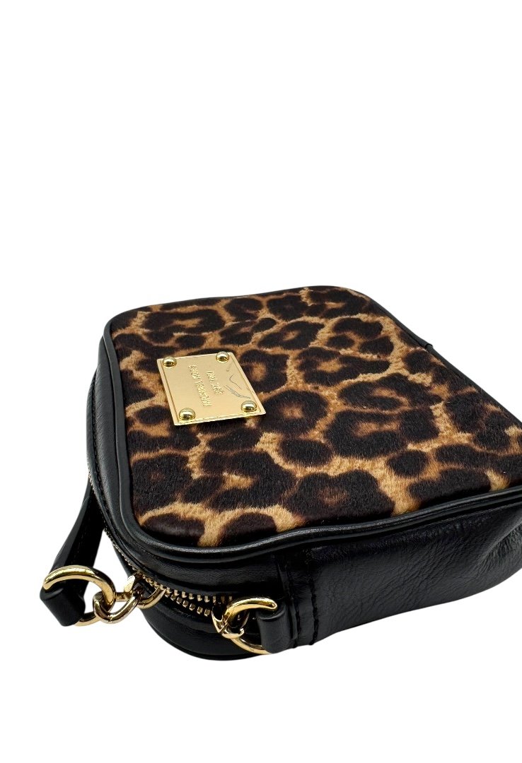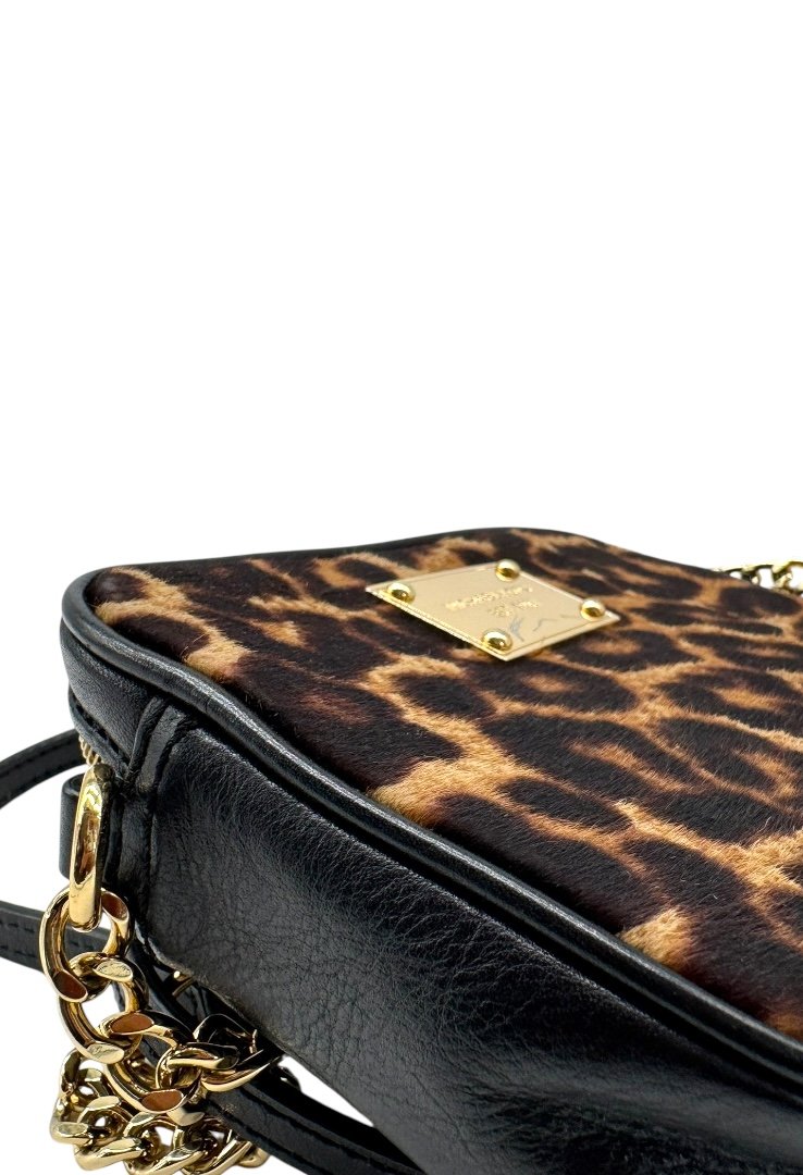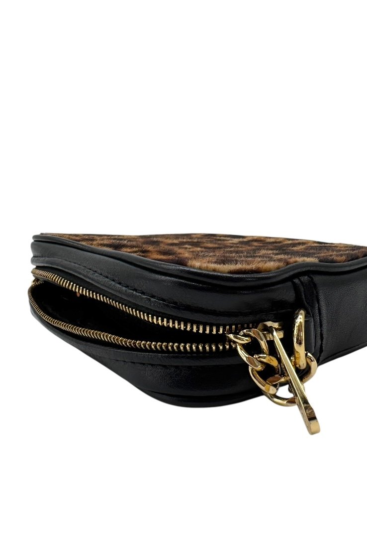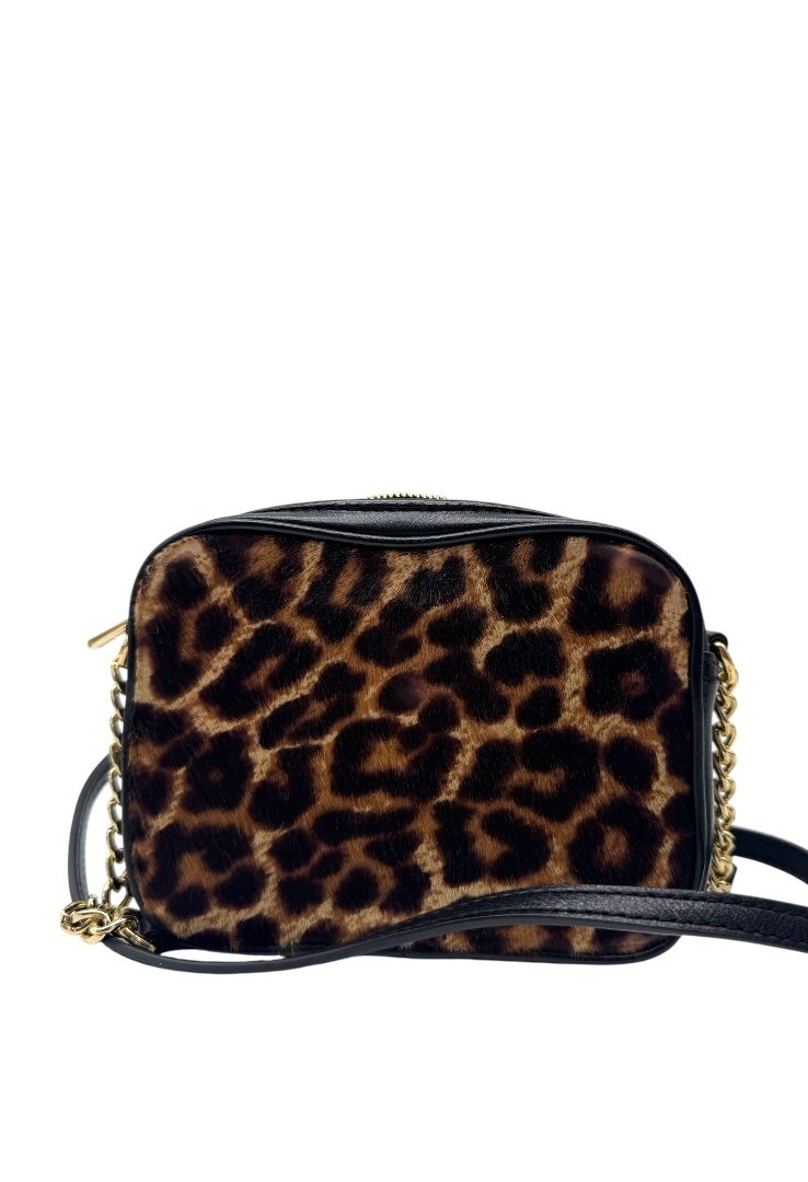 Bolso mini elaborada de cuero, parte frontal elaborado imitación leopardo, apliques en dorado, asa de cadena.