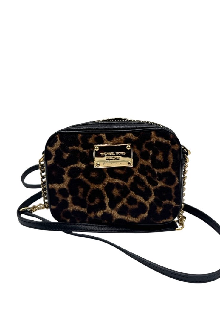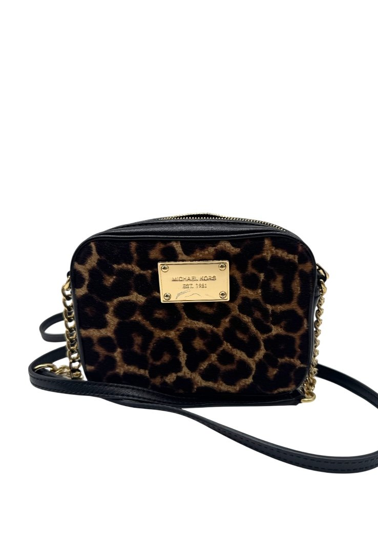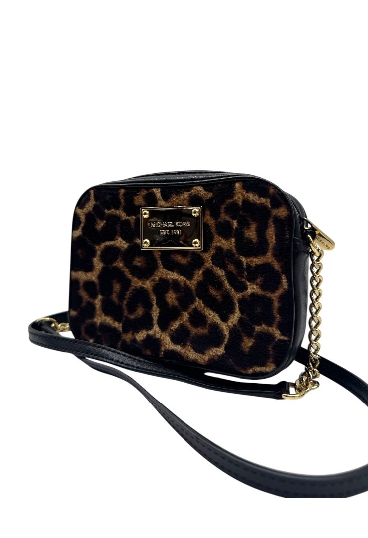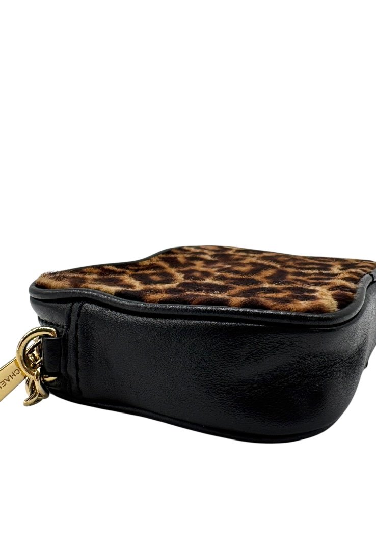 Bolso mini elaborada de cuero, parte frontal elaborado imitación leopardo, apliques en dorado, asa de cadena.