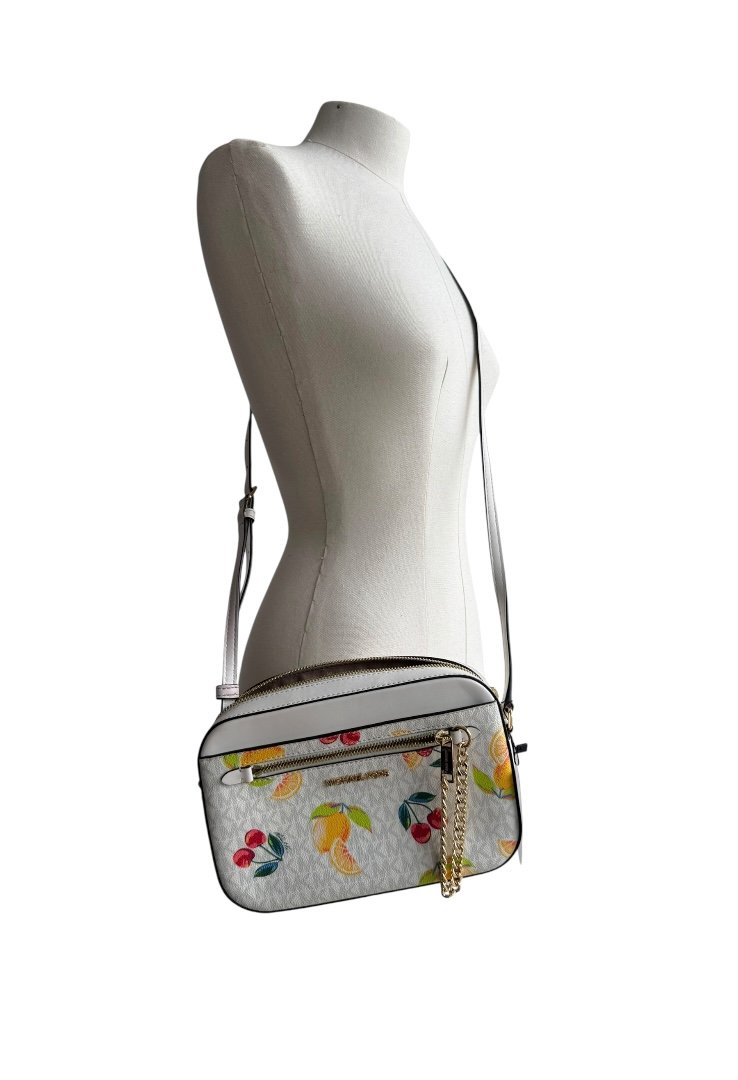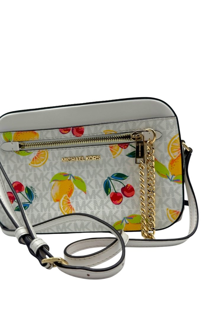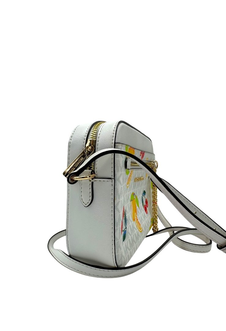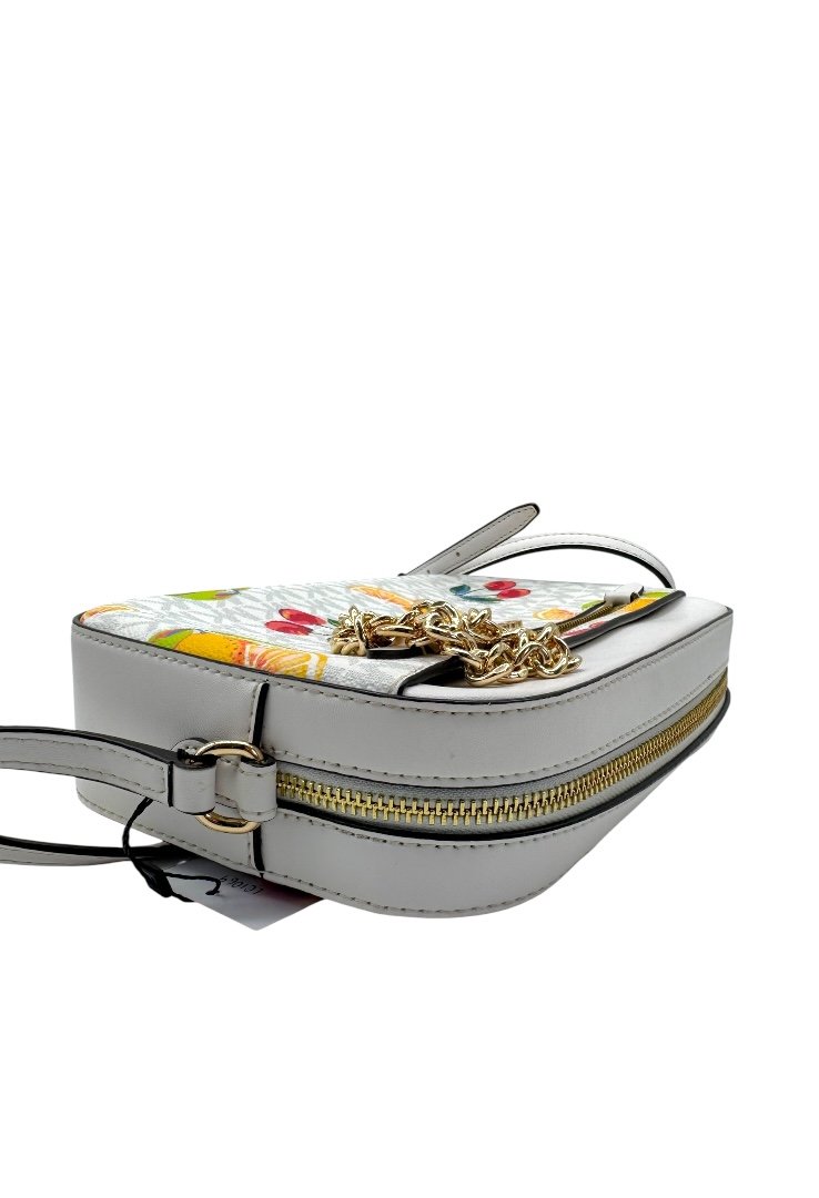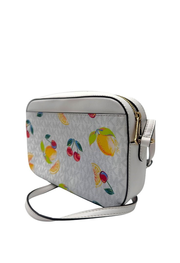 Bolso fabricado lona revestida en diseño monogram, estampado de frutas, apliques en dorado, compartimento principal de cremallera.