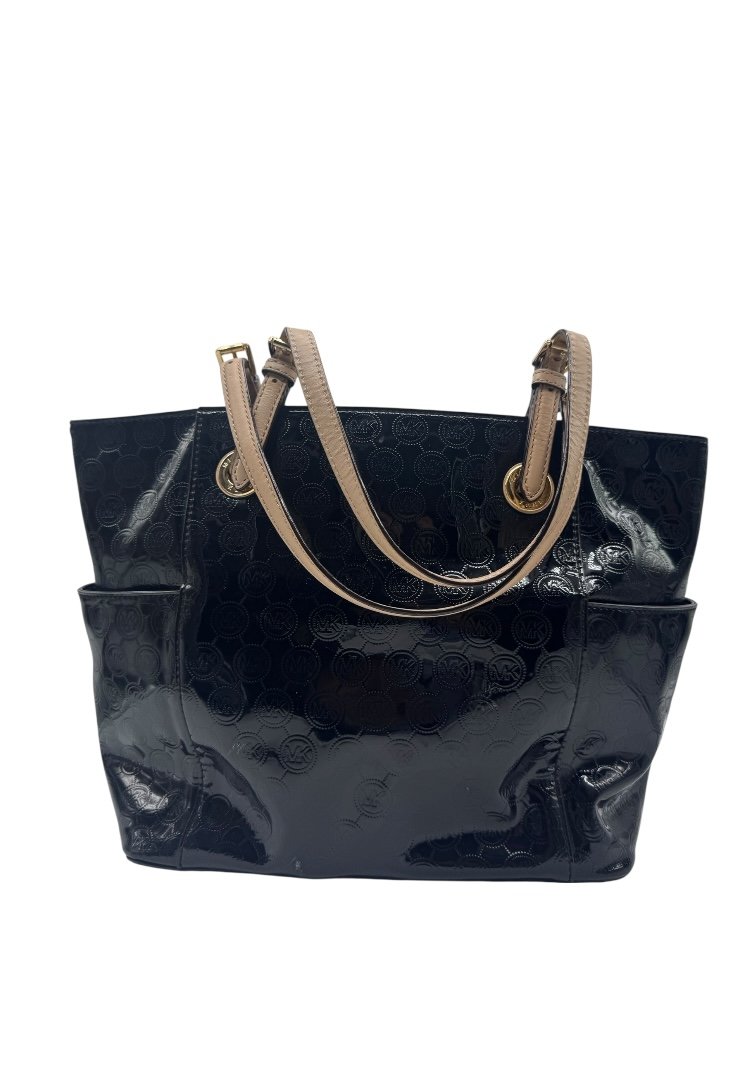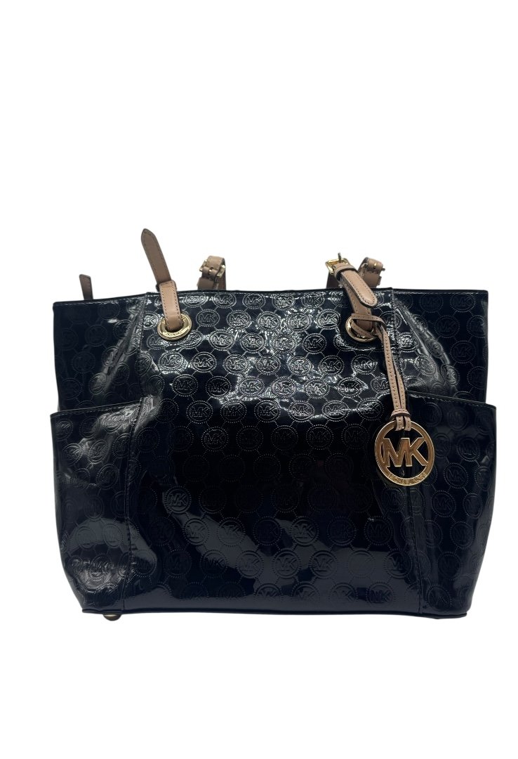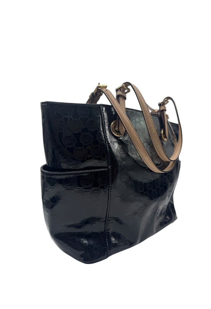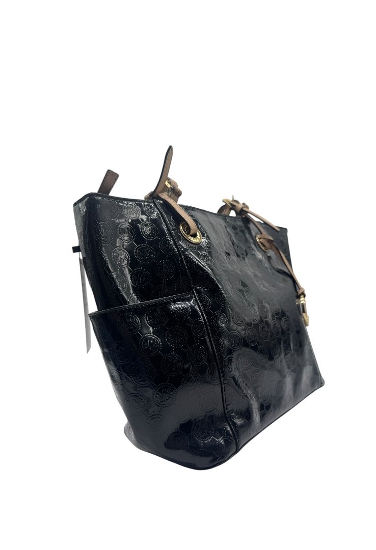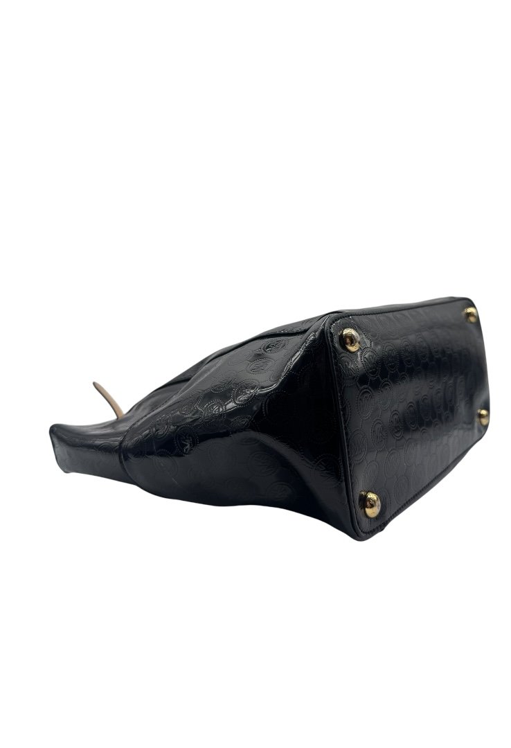 olso elaborado lona, con acabado en charol, asas en cuero, apliques en dorado, compartimento interno con cremallera.