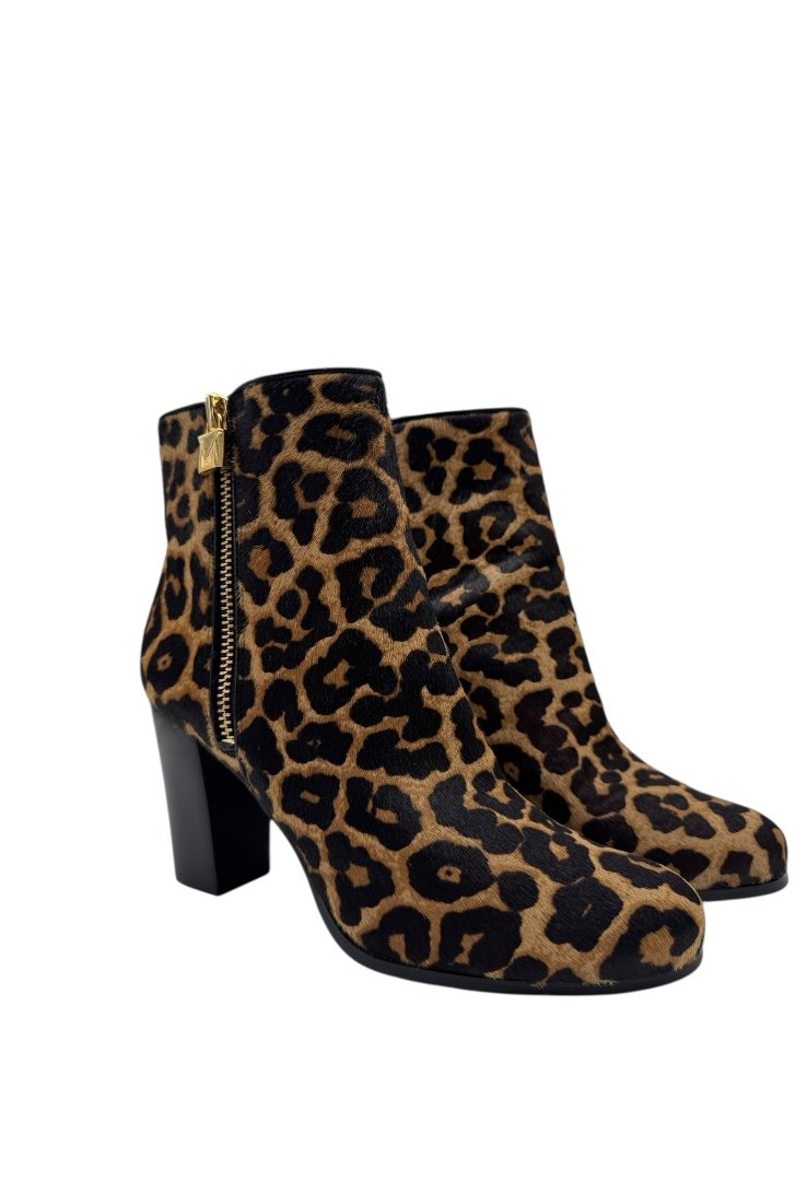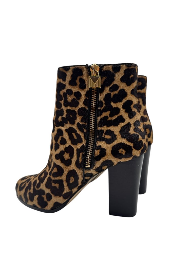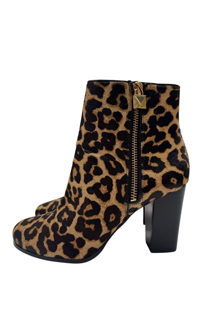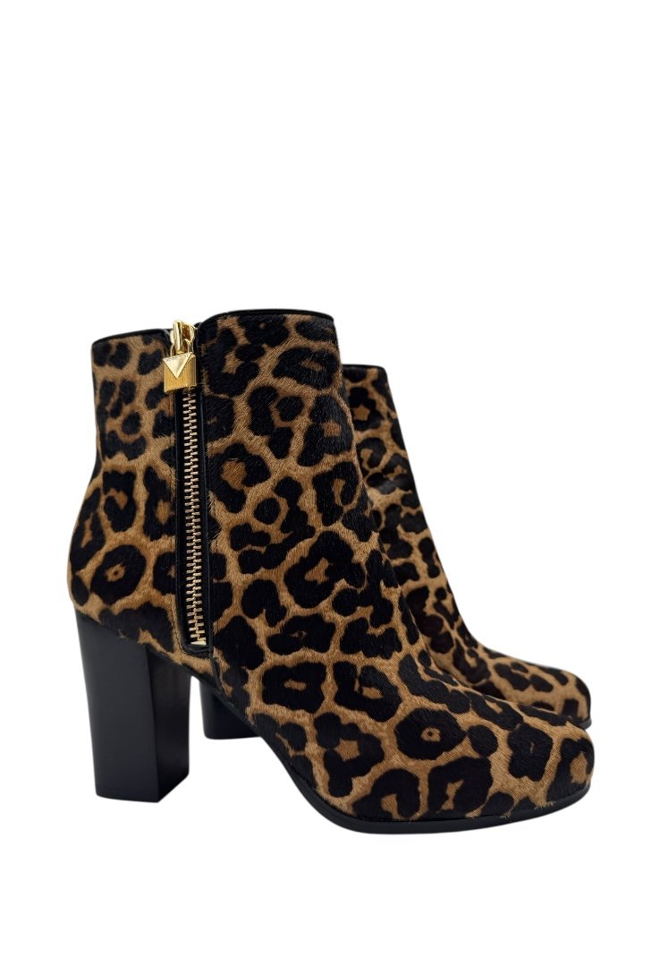Botines elaborados en pelo de becerro con estampado de becerro, suela de gomar, candado decorativo en el zipper .
