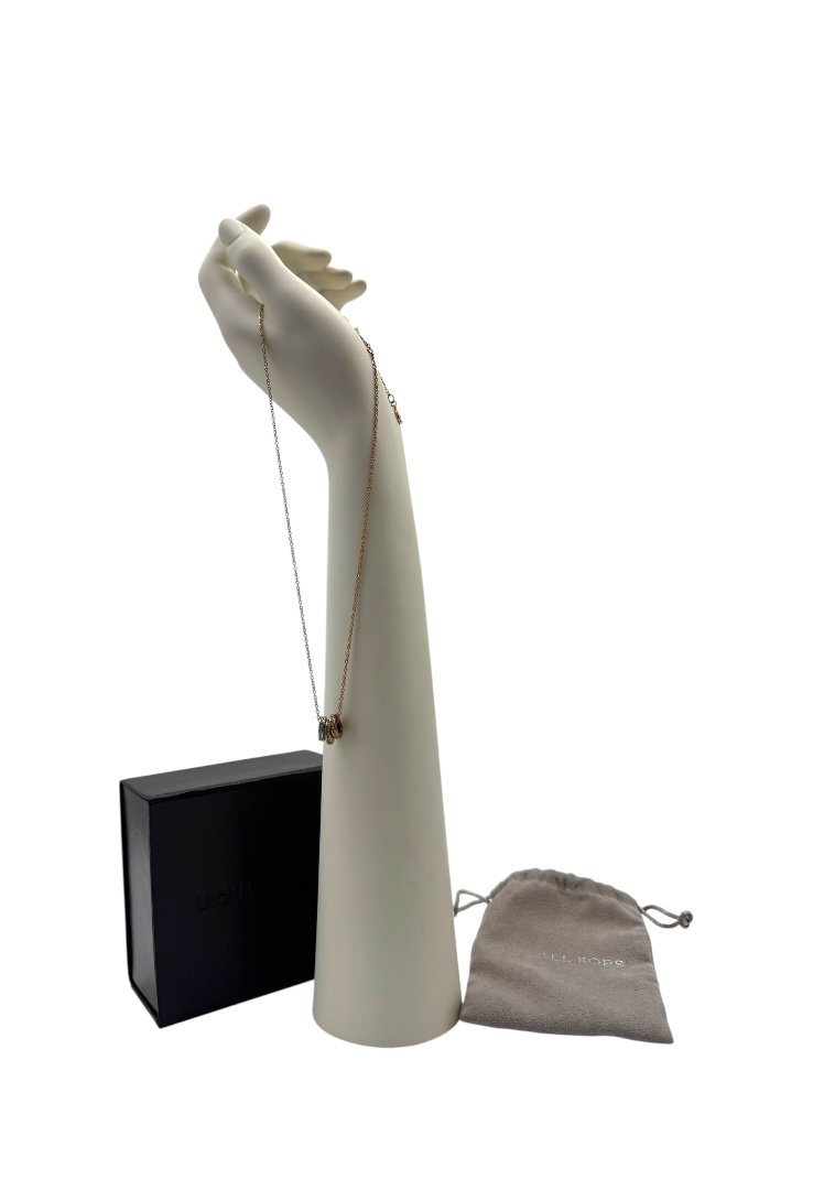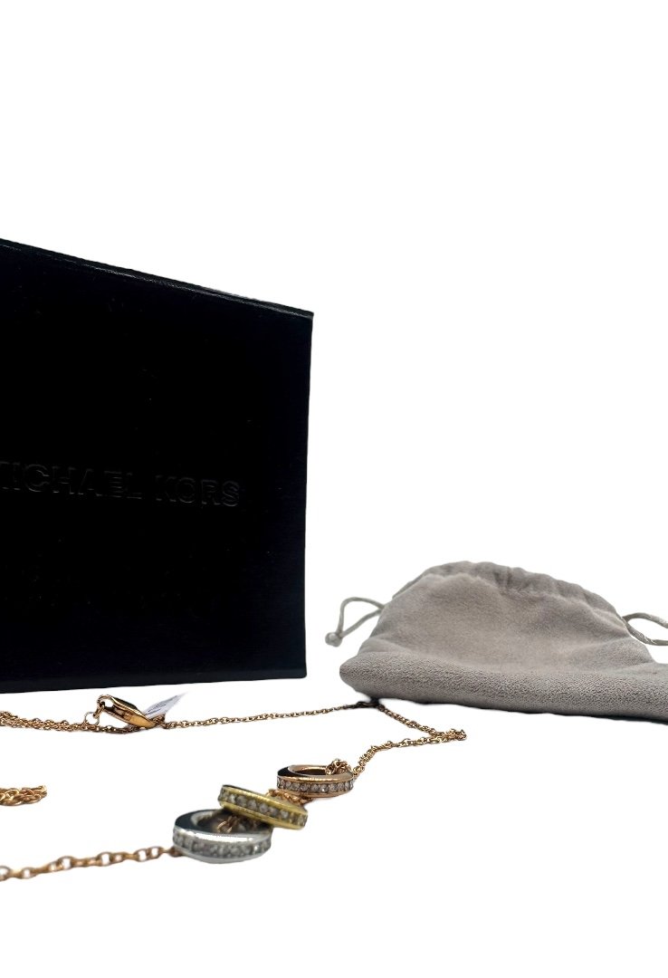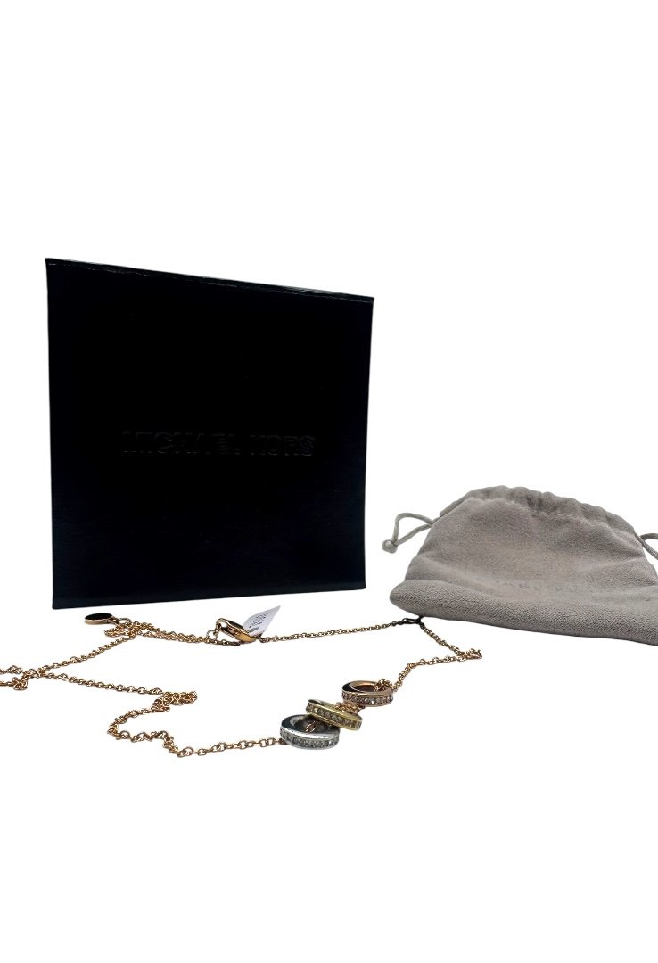 Collar de plata y bañado en oro, diseño de aros con pedrería incrustada.