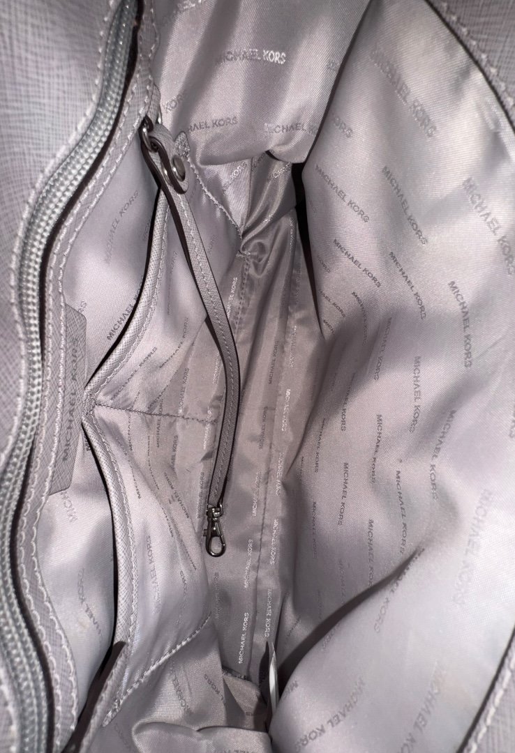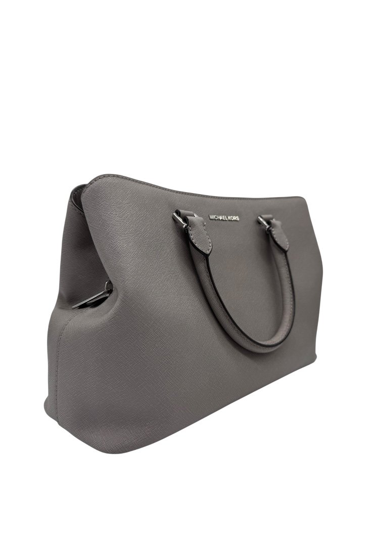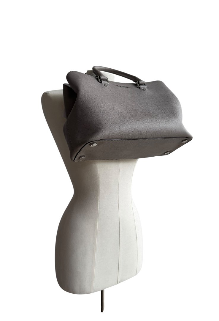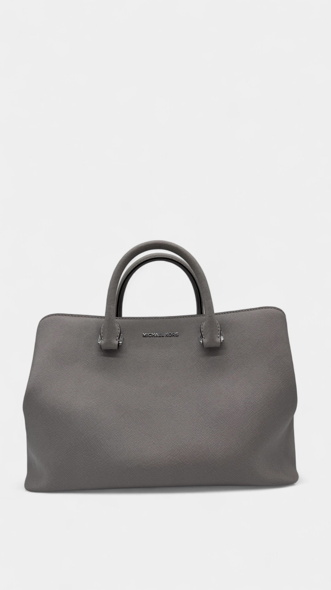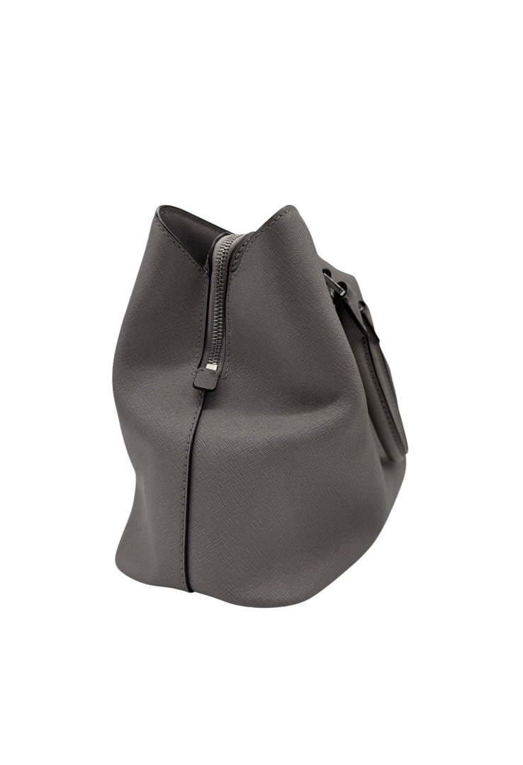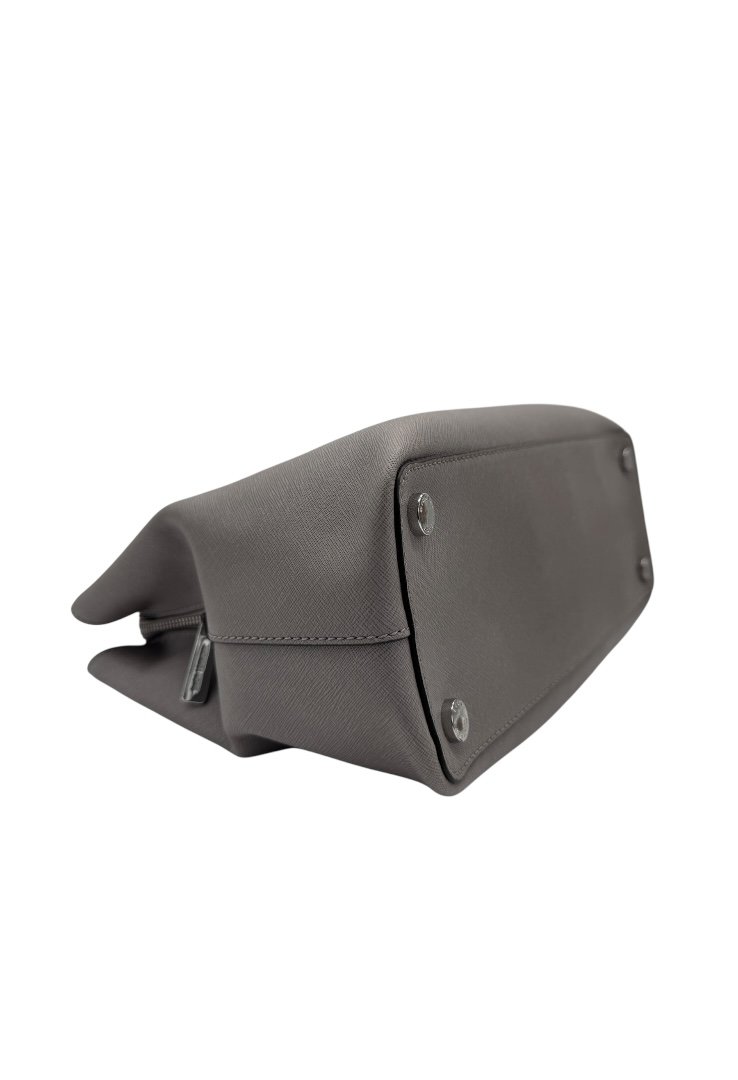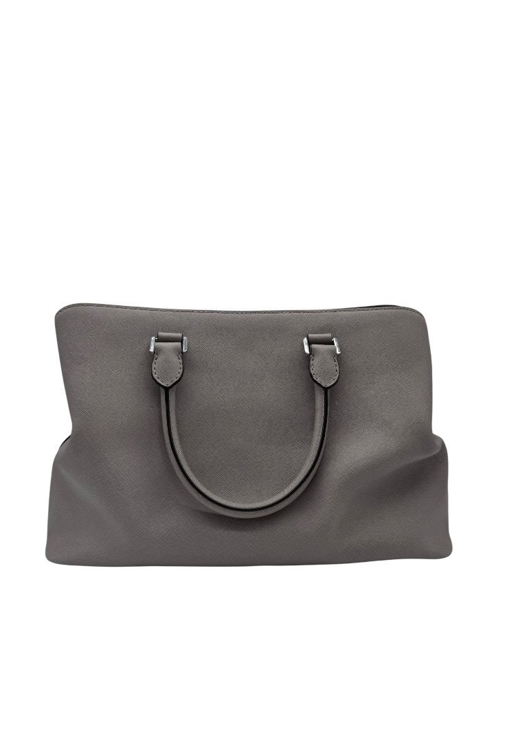 Bolsa fabricada en saffiano, apliques en plata, compartimento en medio con cremallera.