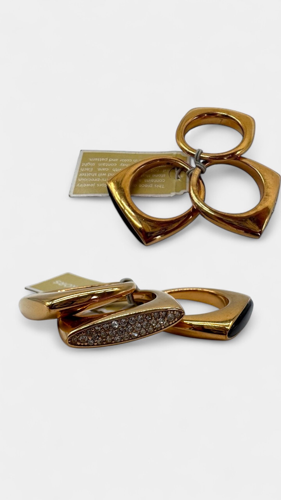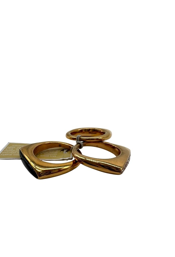 Set de 3 anillos en forma olvalada de latón , chapeada en oro, uno con pedrería incrustada, uno liso y uno con una pieza imitación piedra negra.