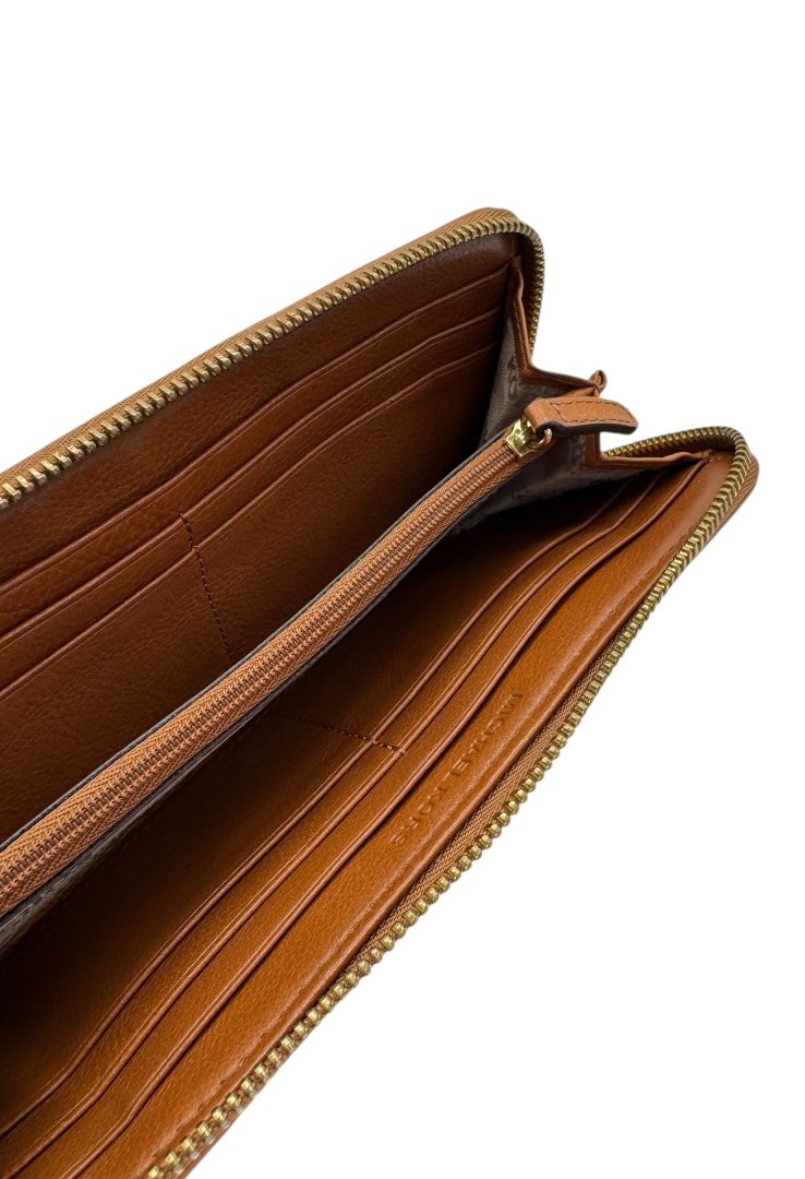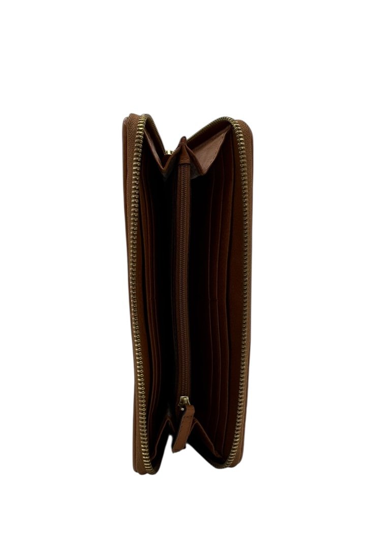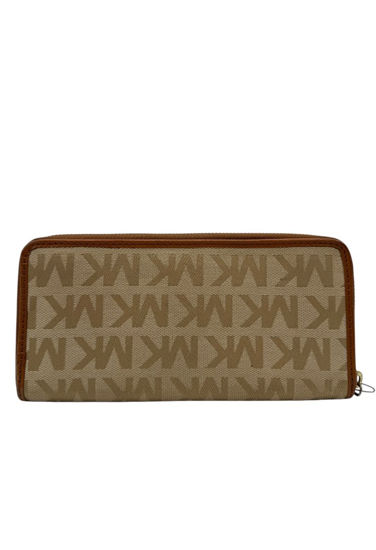 Cartera de textil monogram, esquinas en cuero café, apliques en dorado.