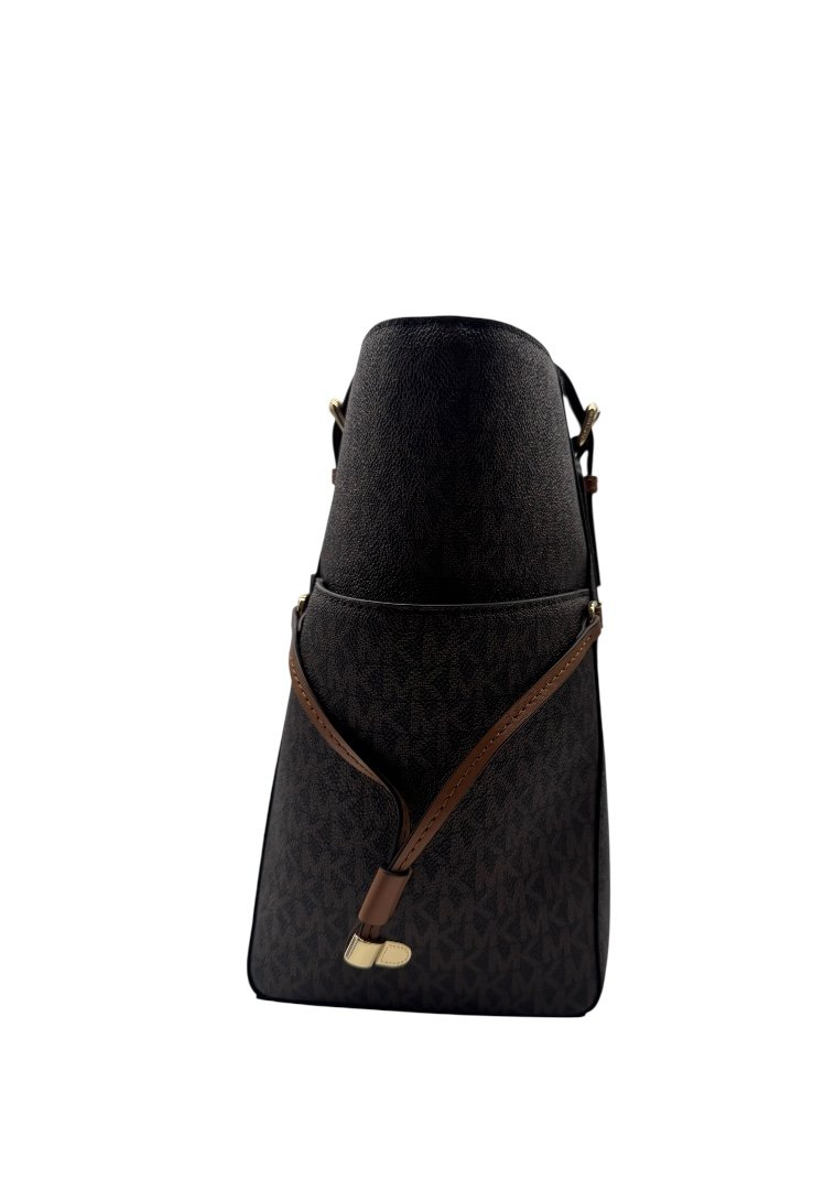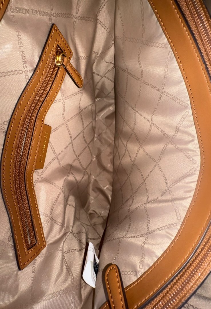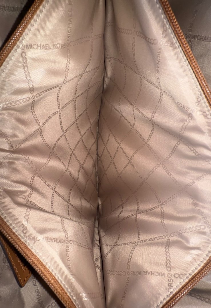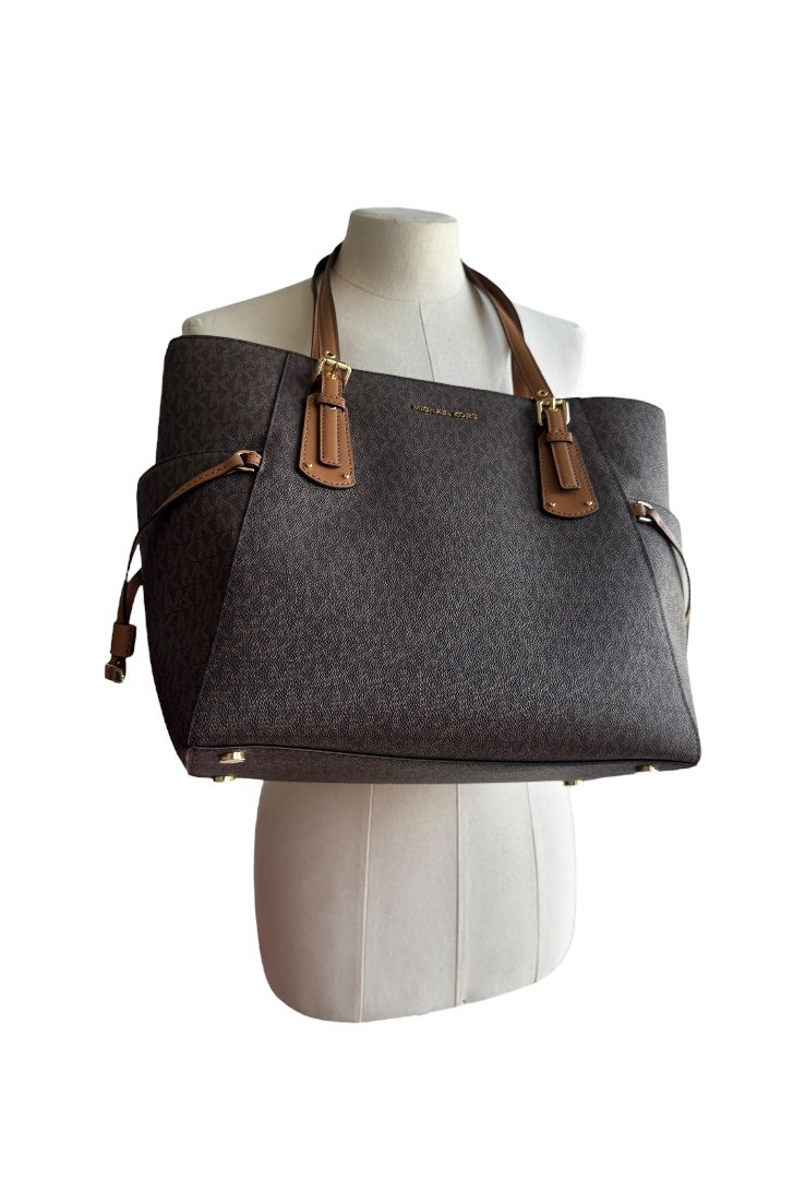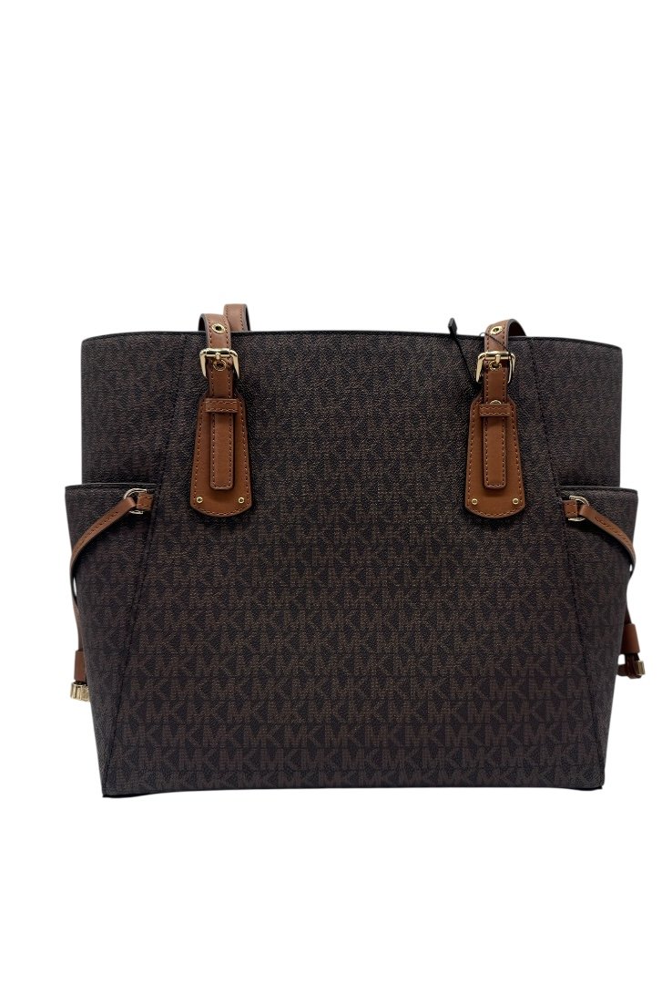 Bolso elaborado en lona diseño monogram, apliques en dorado, asas en cuero, compartimento con cremallera, compartimento doble sin cremallera.