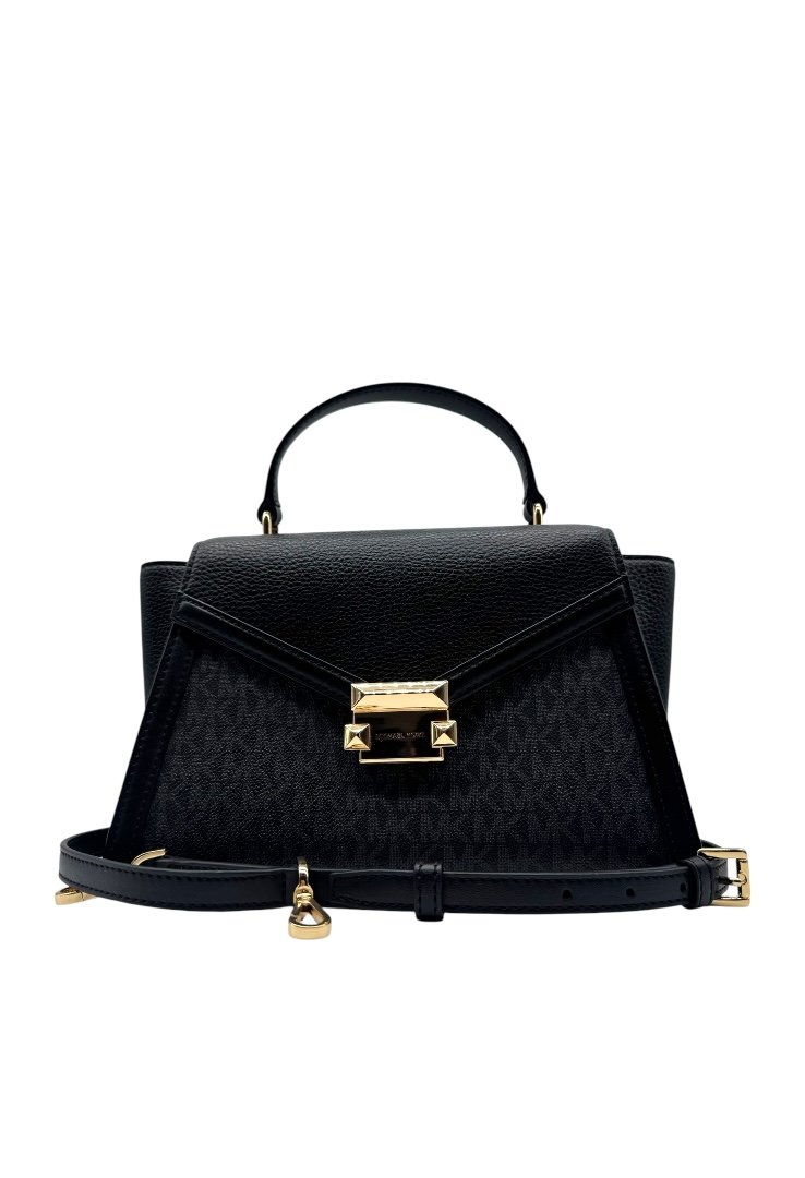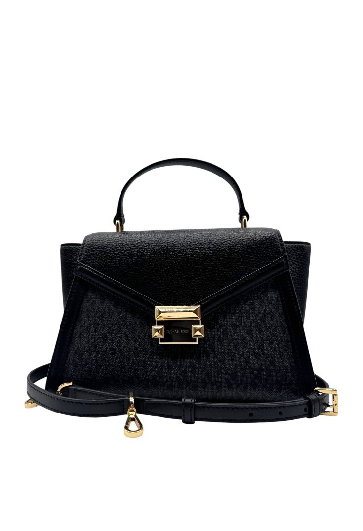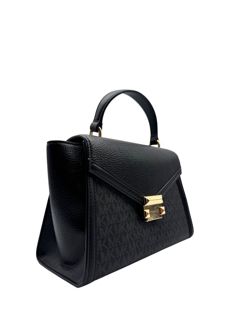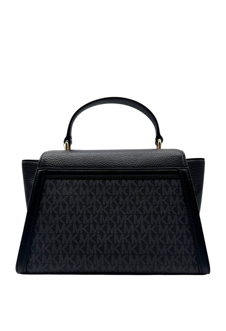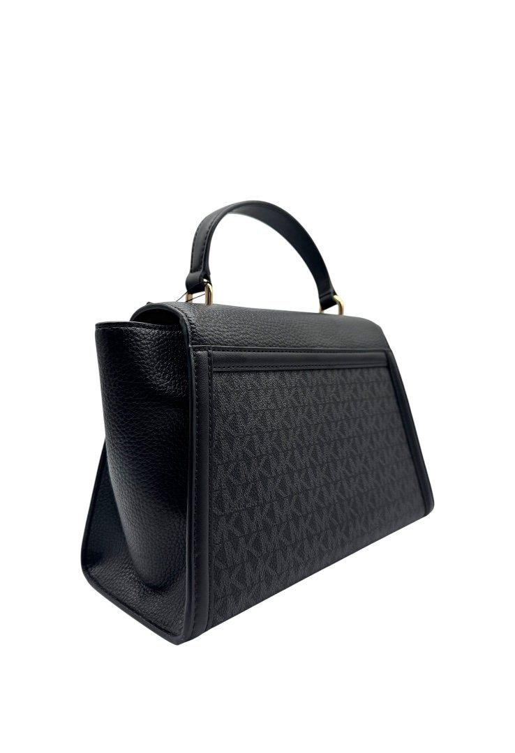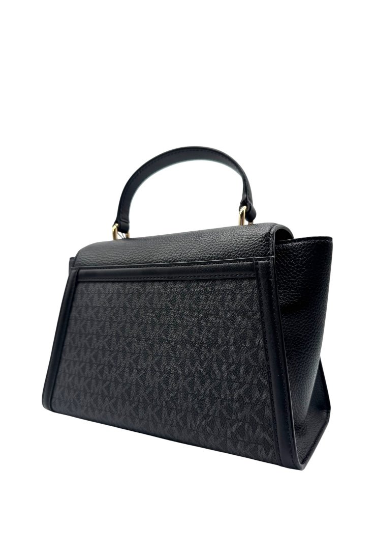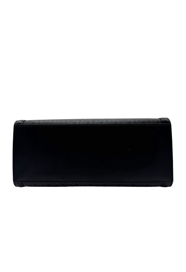 Bolso elaborado en piel granulada y lona con diseño monogram, apliques en dorado, asa ajustable, cierre en solapa con broche.