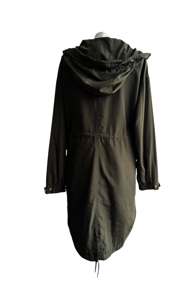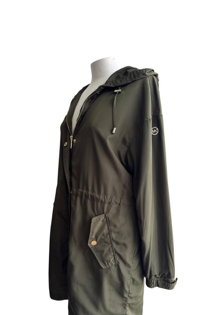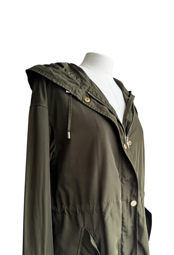 Confeccionada en poliéster 100% con capucha, cierre con cremallera, bolsillos, hardware en color dorado.