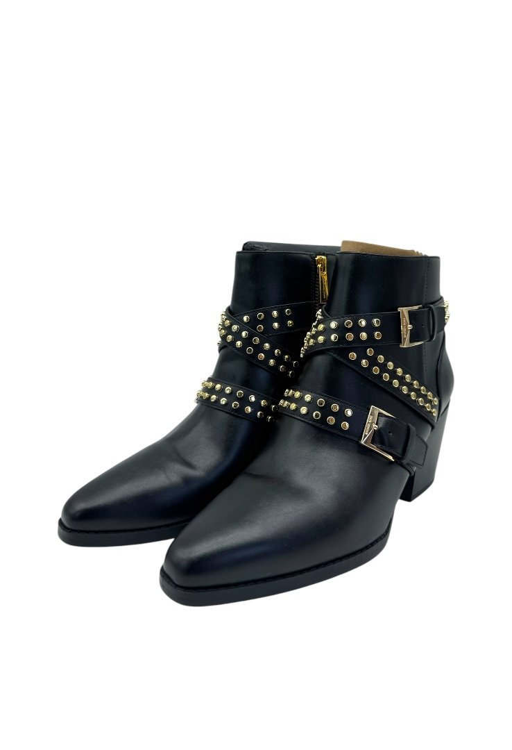 Botas con tacón elaboradas en piel de becerro, punta triangular, cierre en lateral con cremallera, estoperoles y broches en dorado.