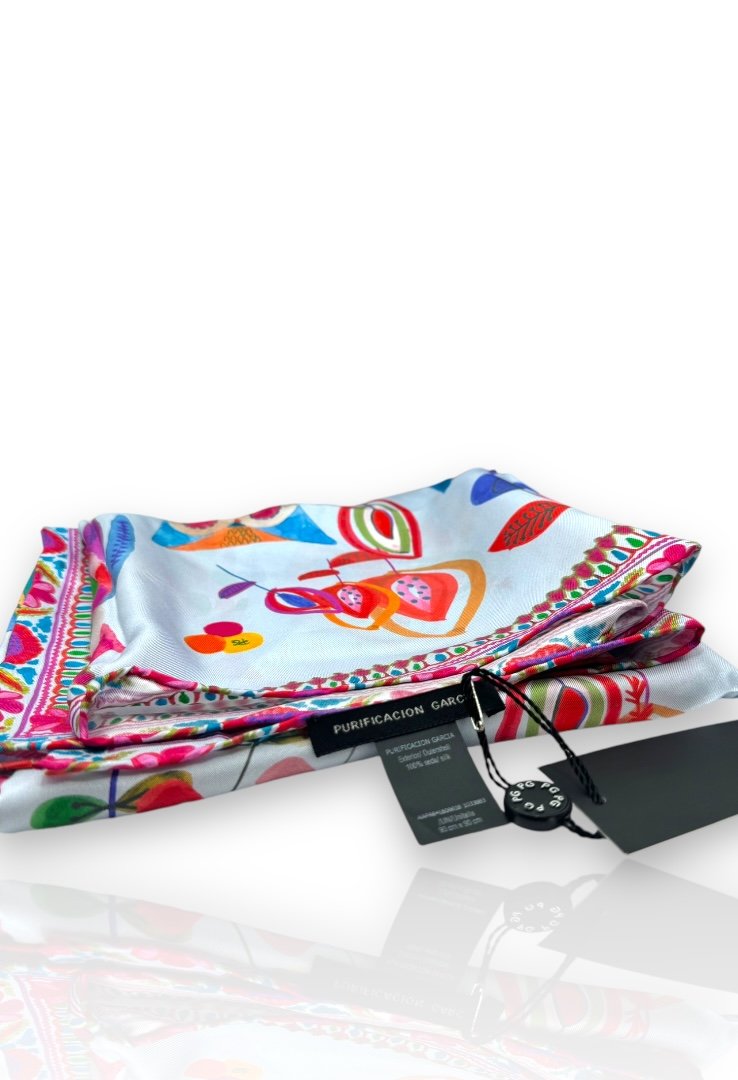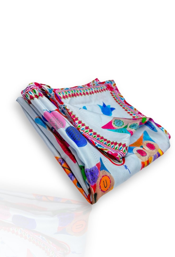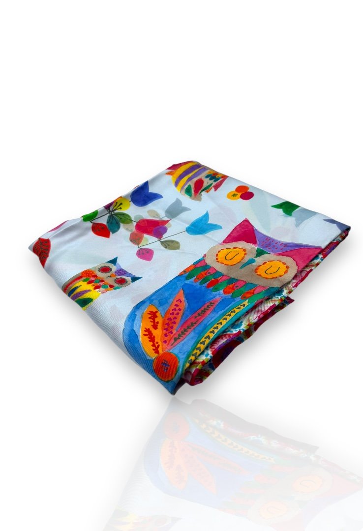 Pashmina con estampado multicolor de buho y tulipanes.