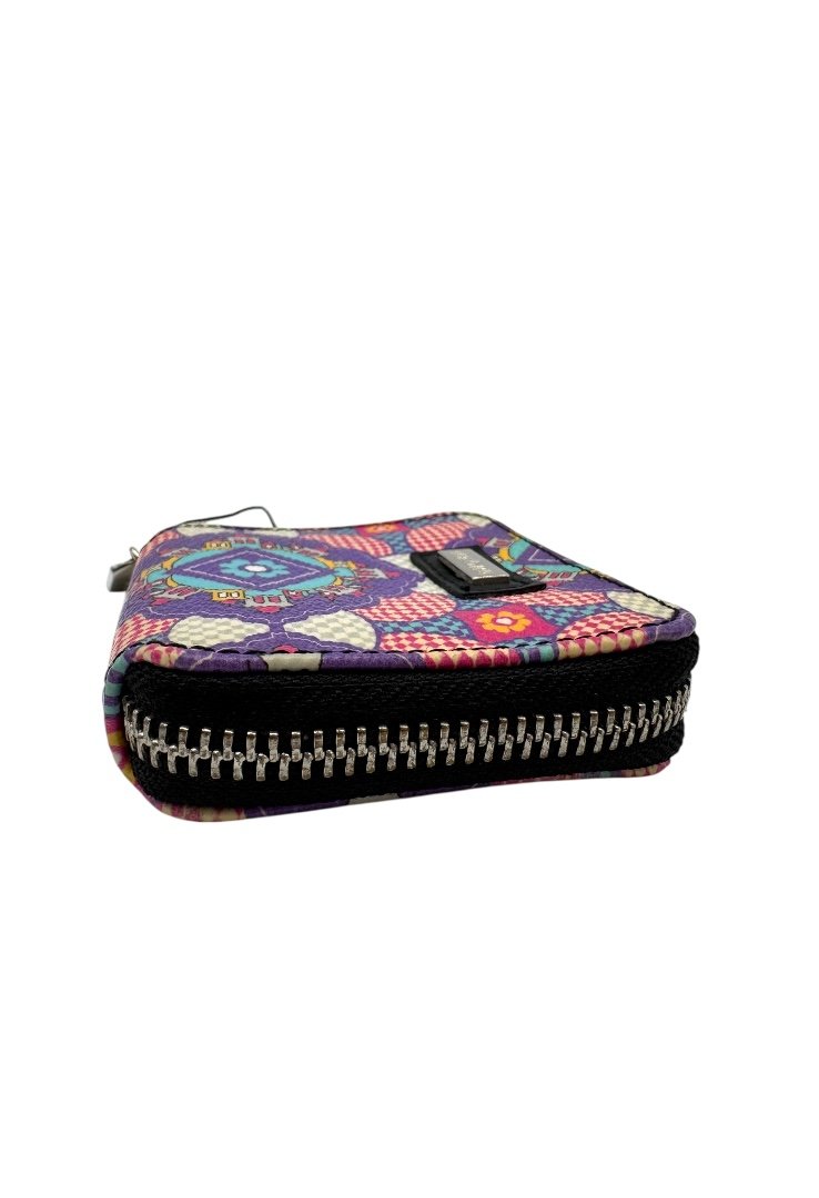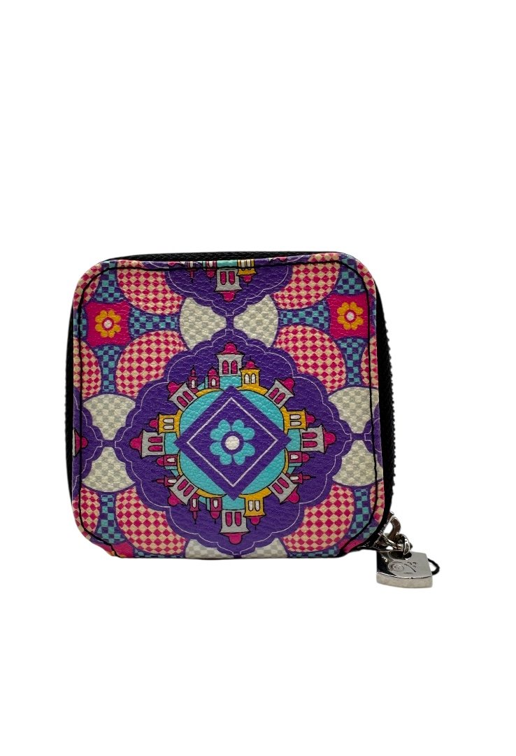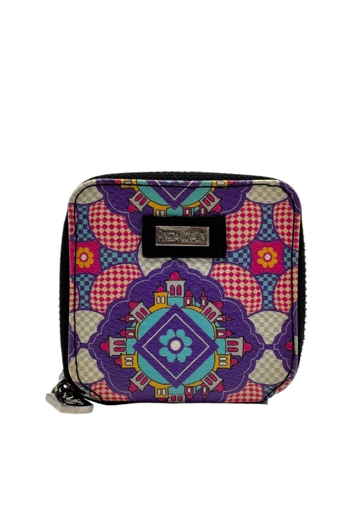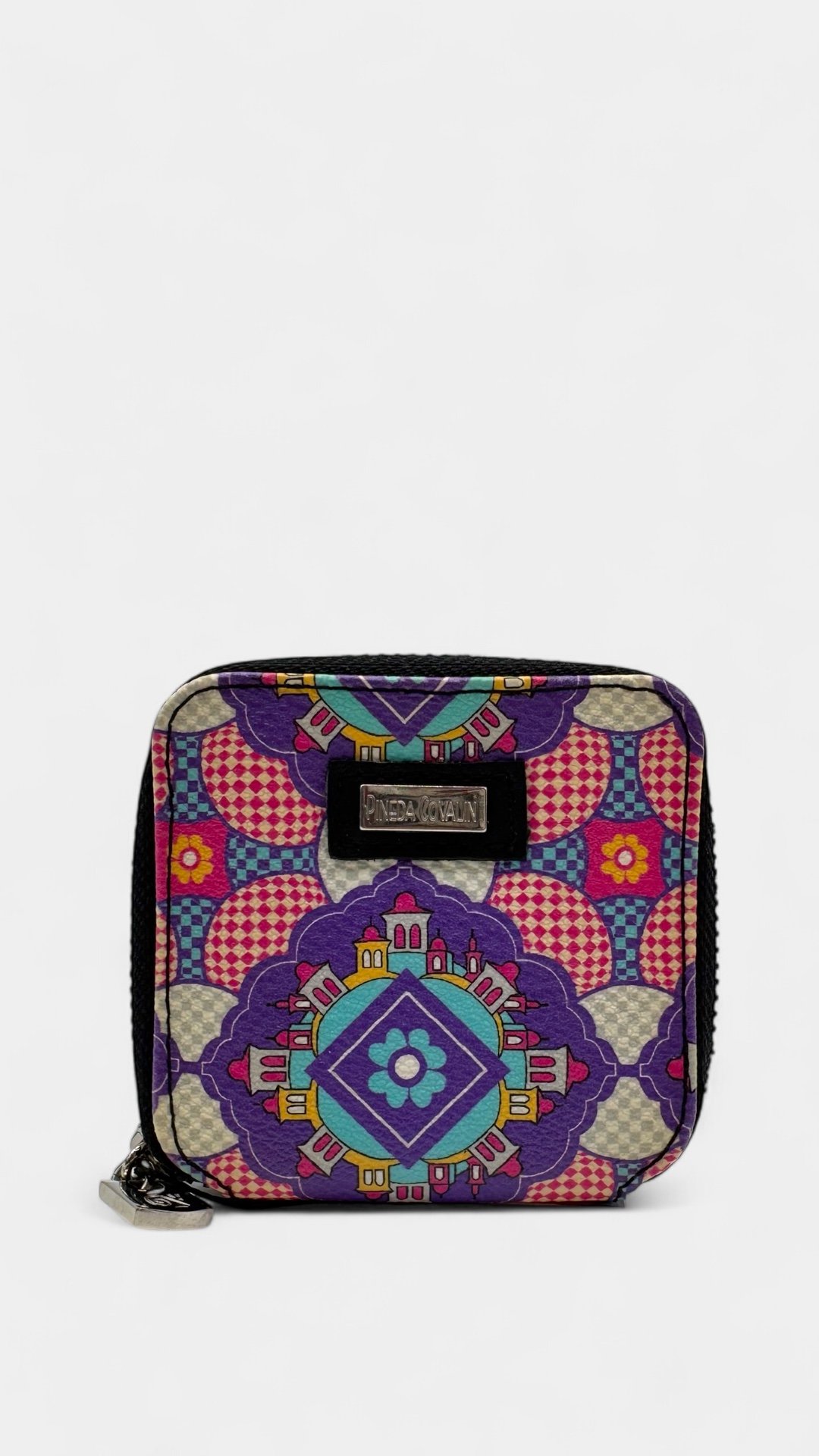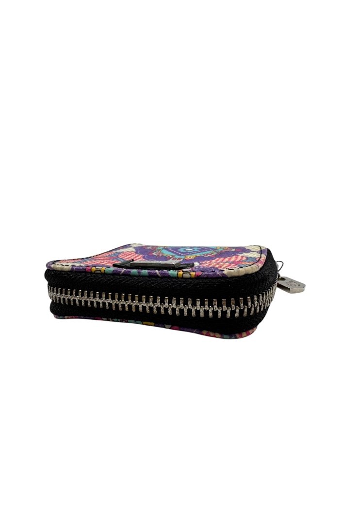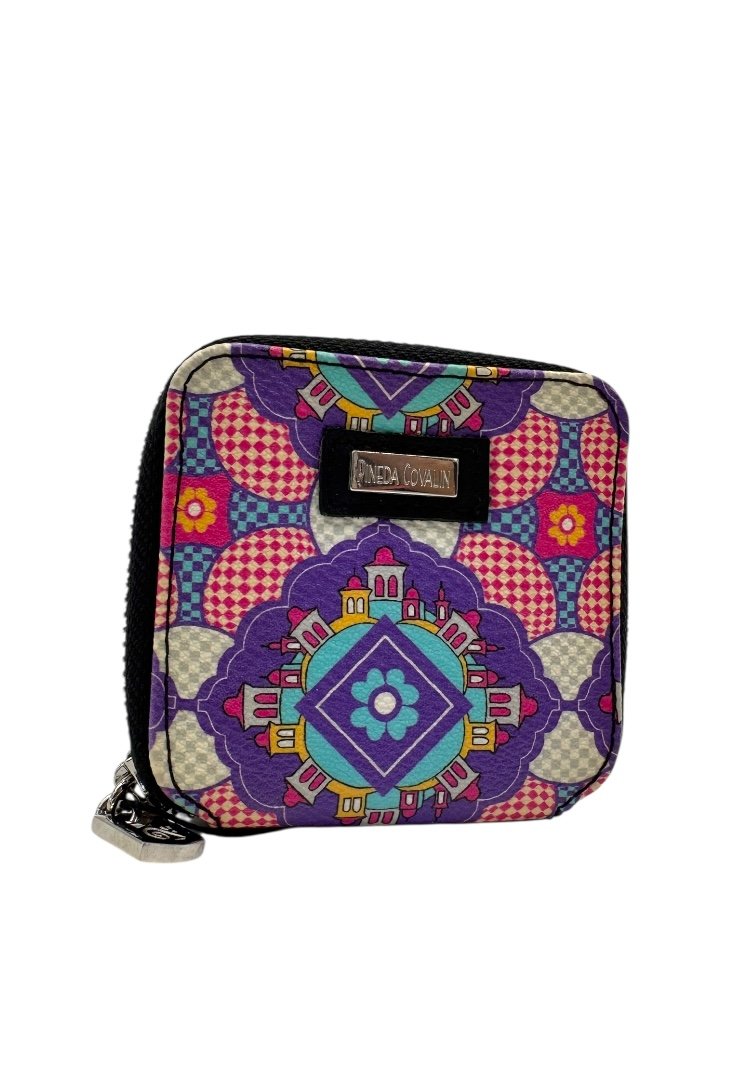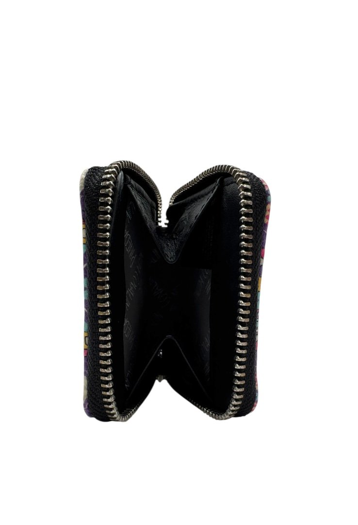 Monedero con diseño chantli en piel de vacuno, apliques en plata.